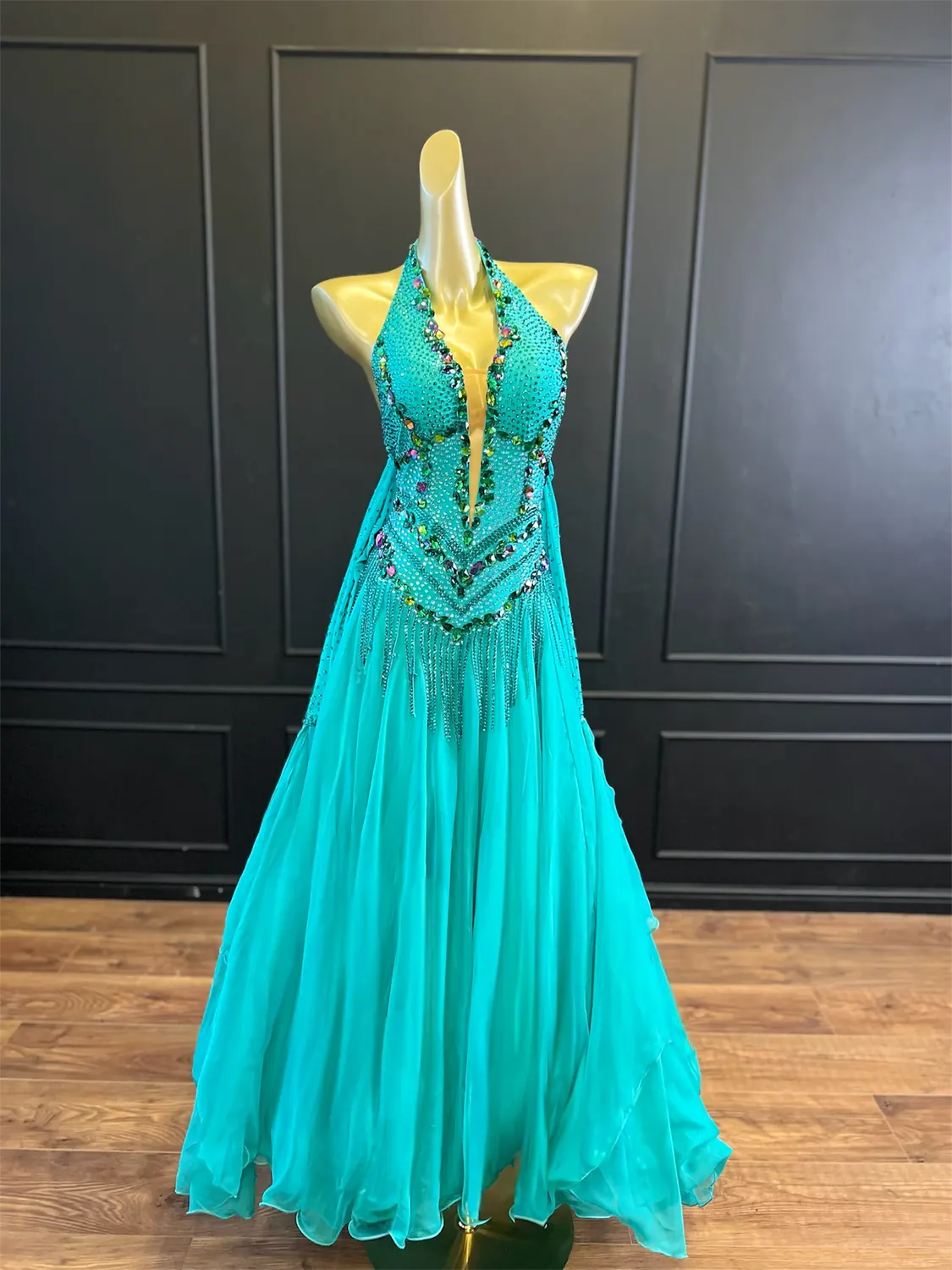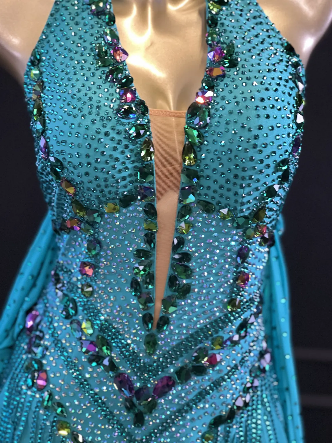 The feature stoning on this dress does not restrict the considerable stretch in the bodice, therefore it is true to size UK 10-12. This dress has secure poppers at the gusset.