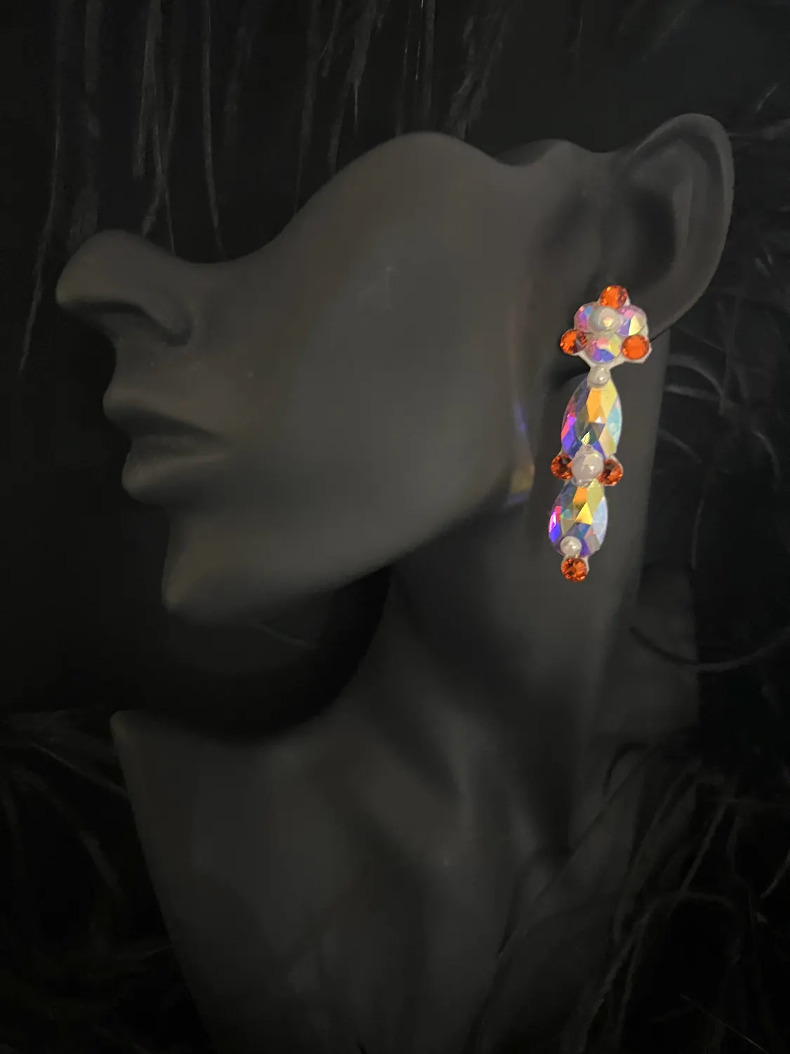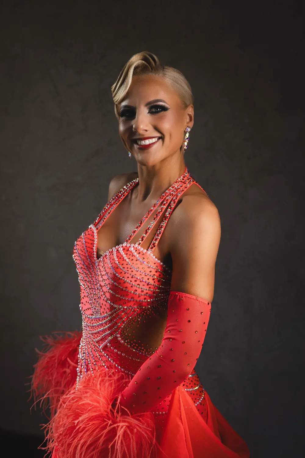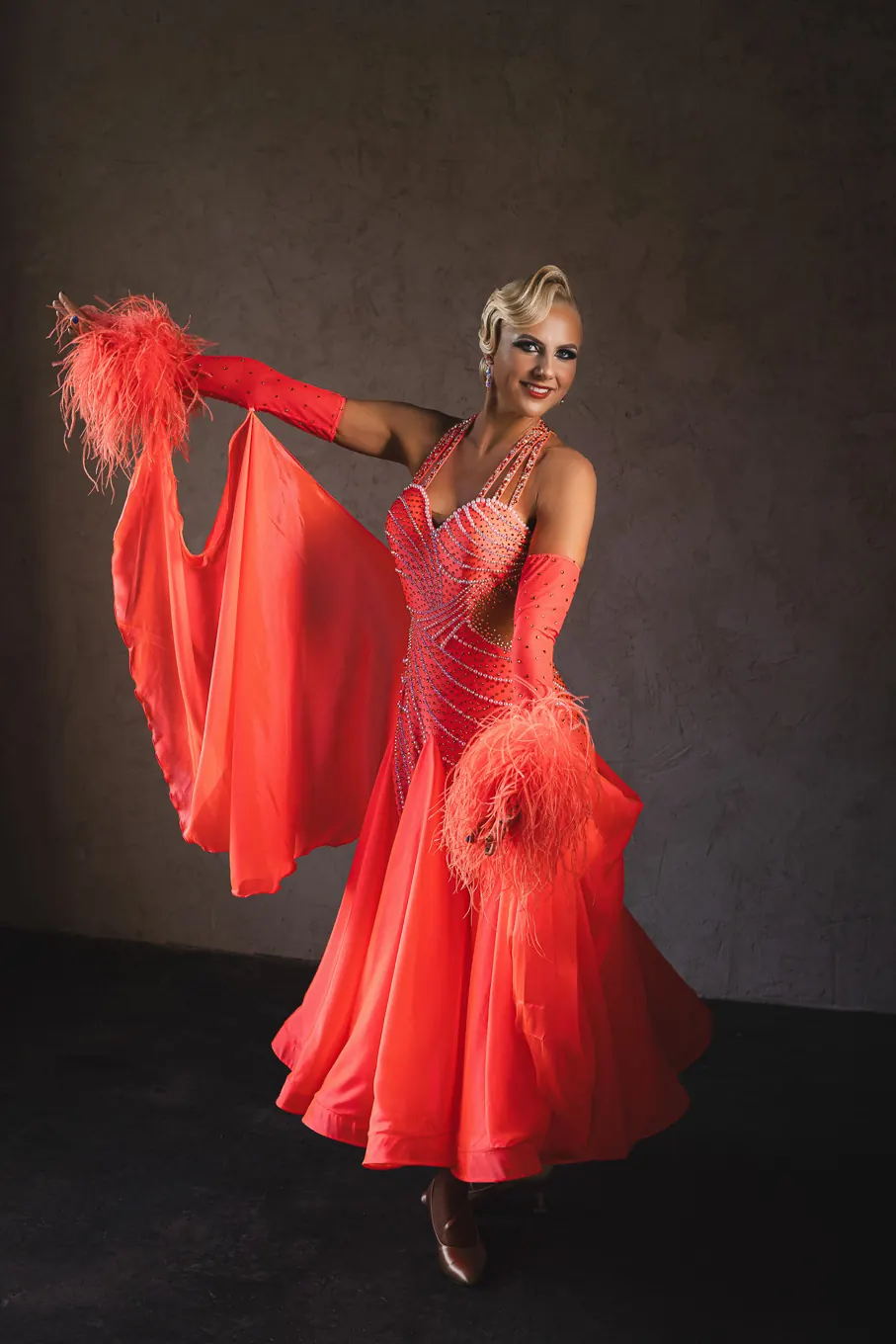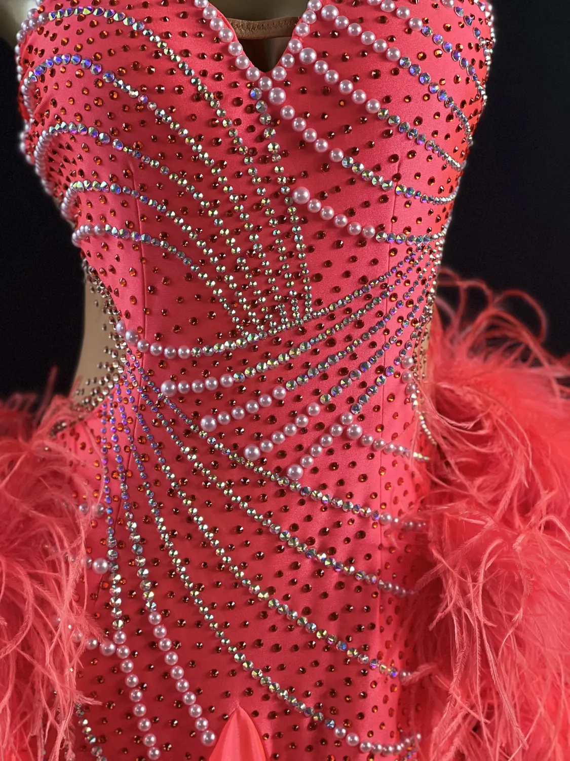 Ballroom competition dress in Coral Pearl lycra and satin chiffon with flat back pearls, Hyacinth, Golden Shadow and Crystal AB stoning, detachable satin chiffon floats, Coral Ostrich Feather Cuffs and stoned feature earrings.