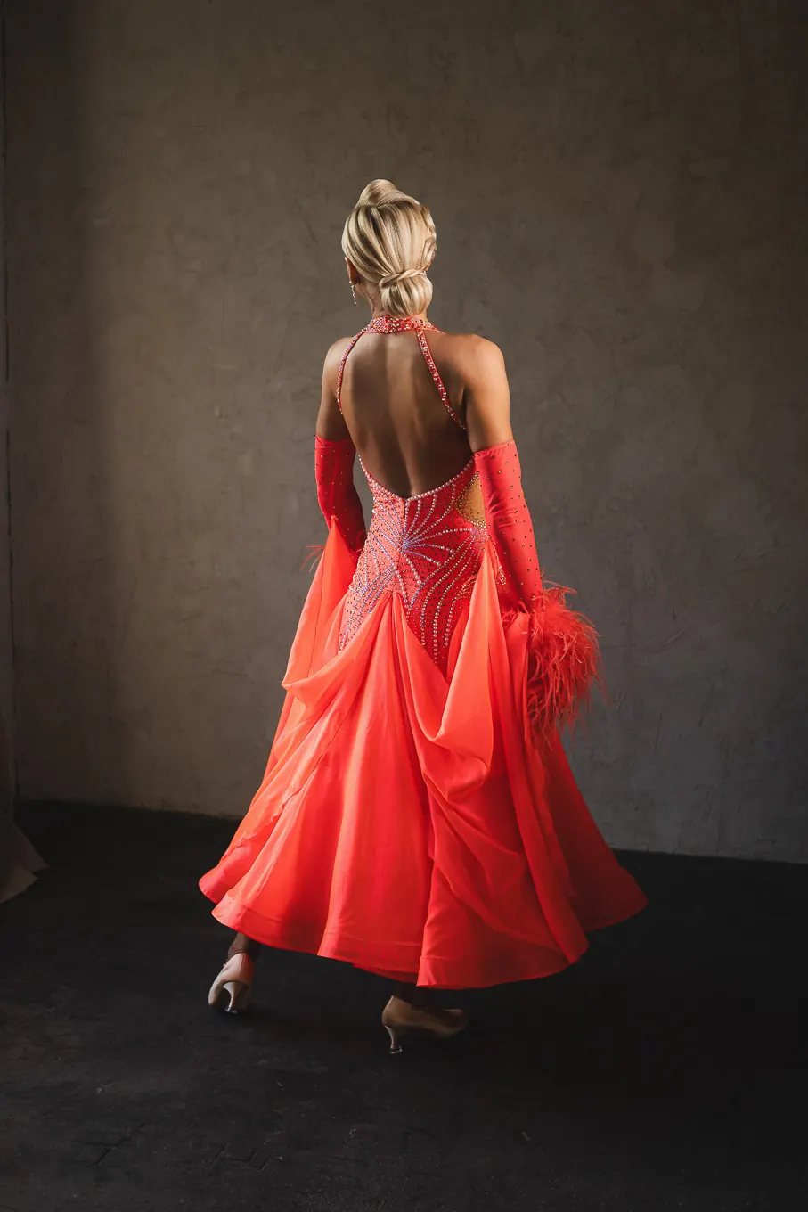 Ballroom competition dress in Coral Pearl satin chiffon