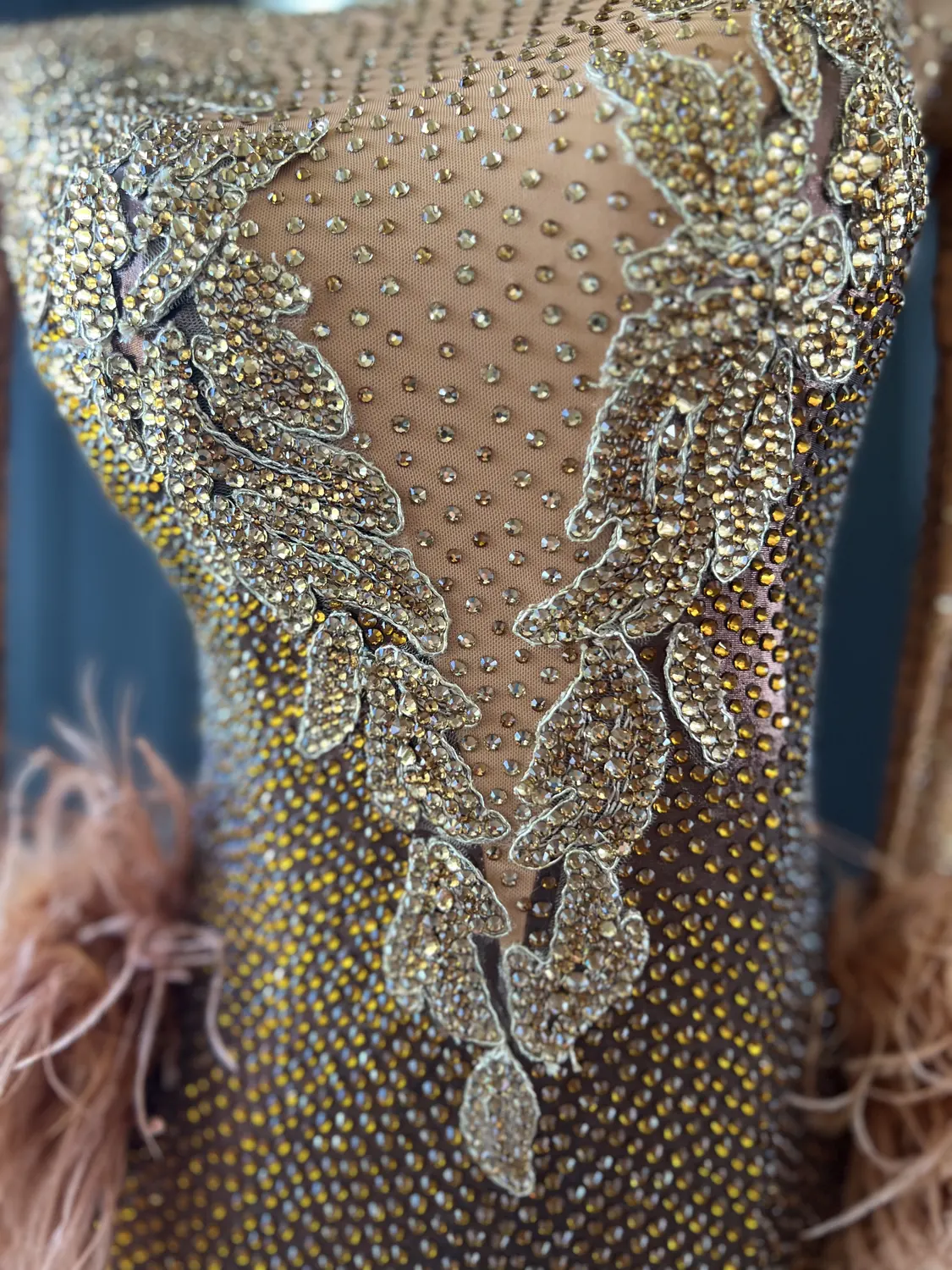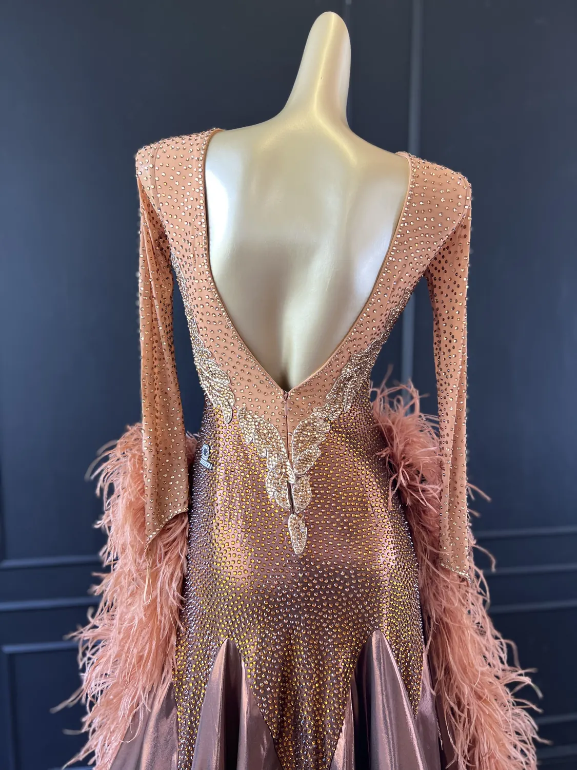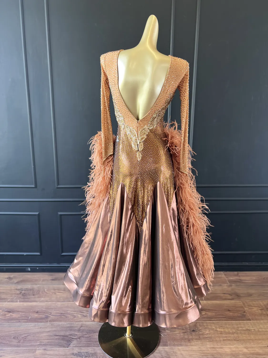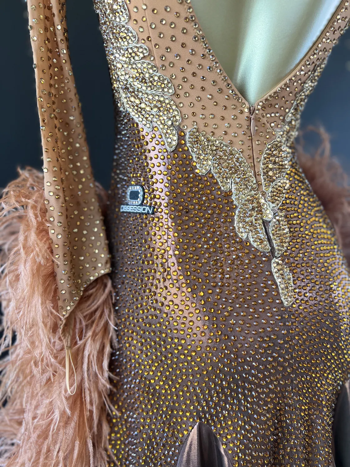 The bodice of this dress is made from metallic lycra which has limited additional stretch. The dress also has heavily stoned. Therefore, this dress is best suited to a UK size 10 dancer. This dress has secure poppers at the gusset.