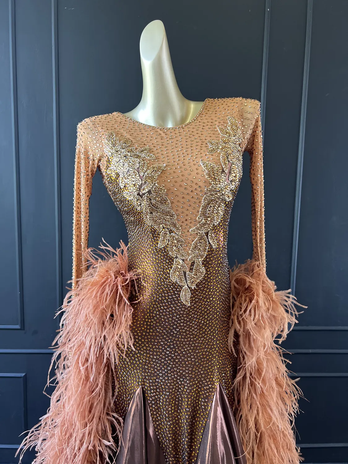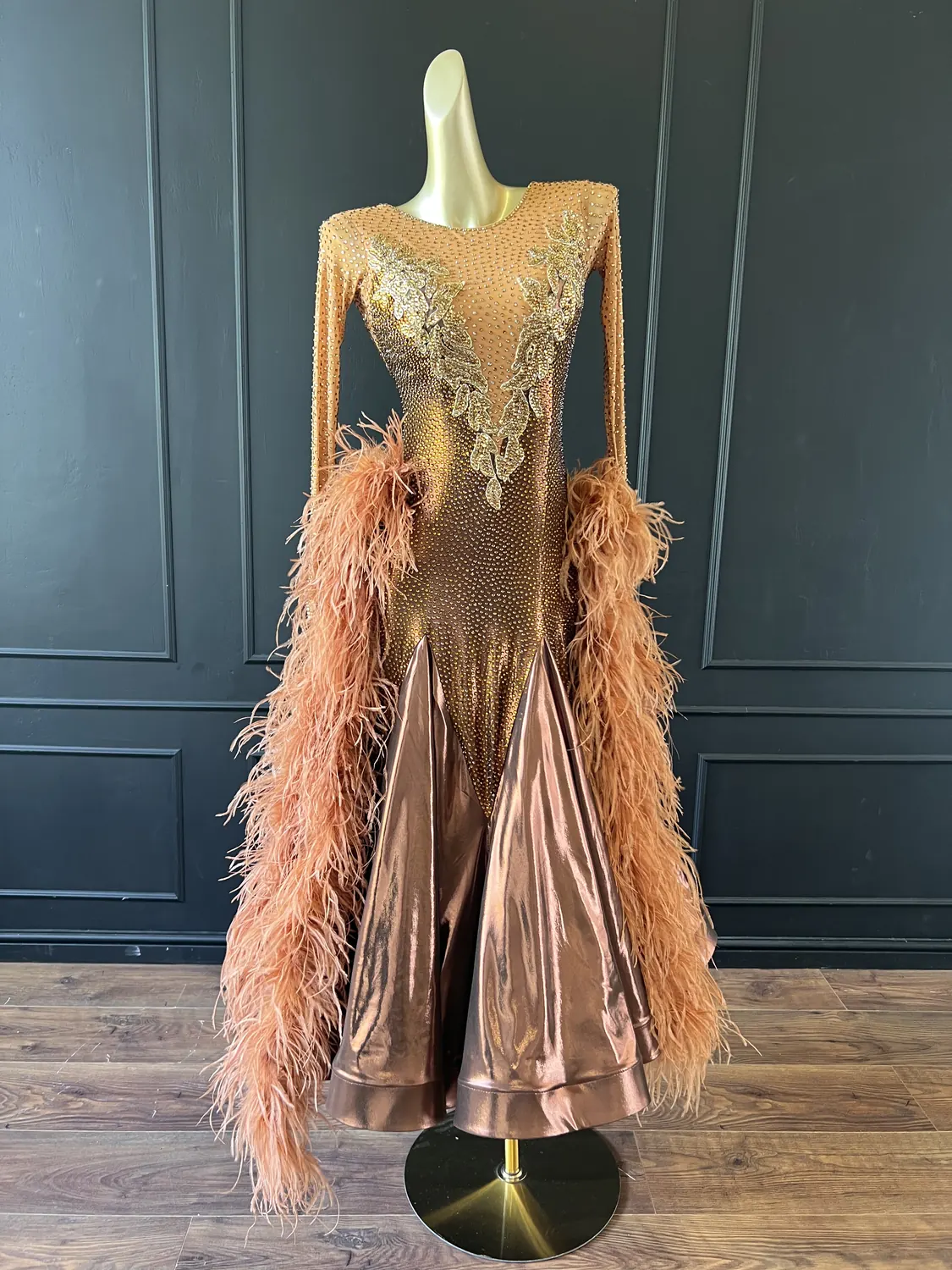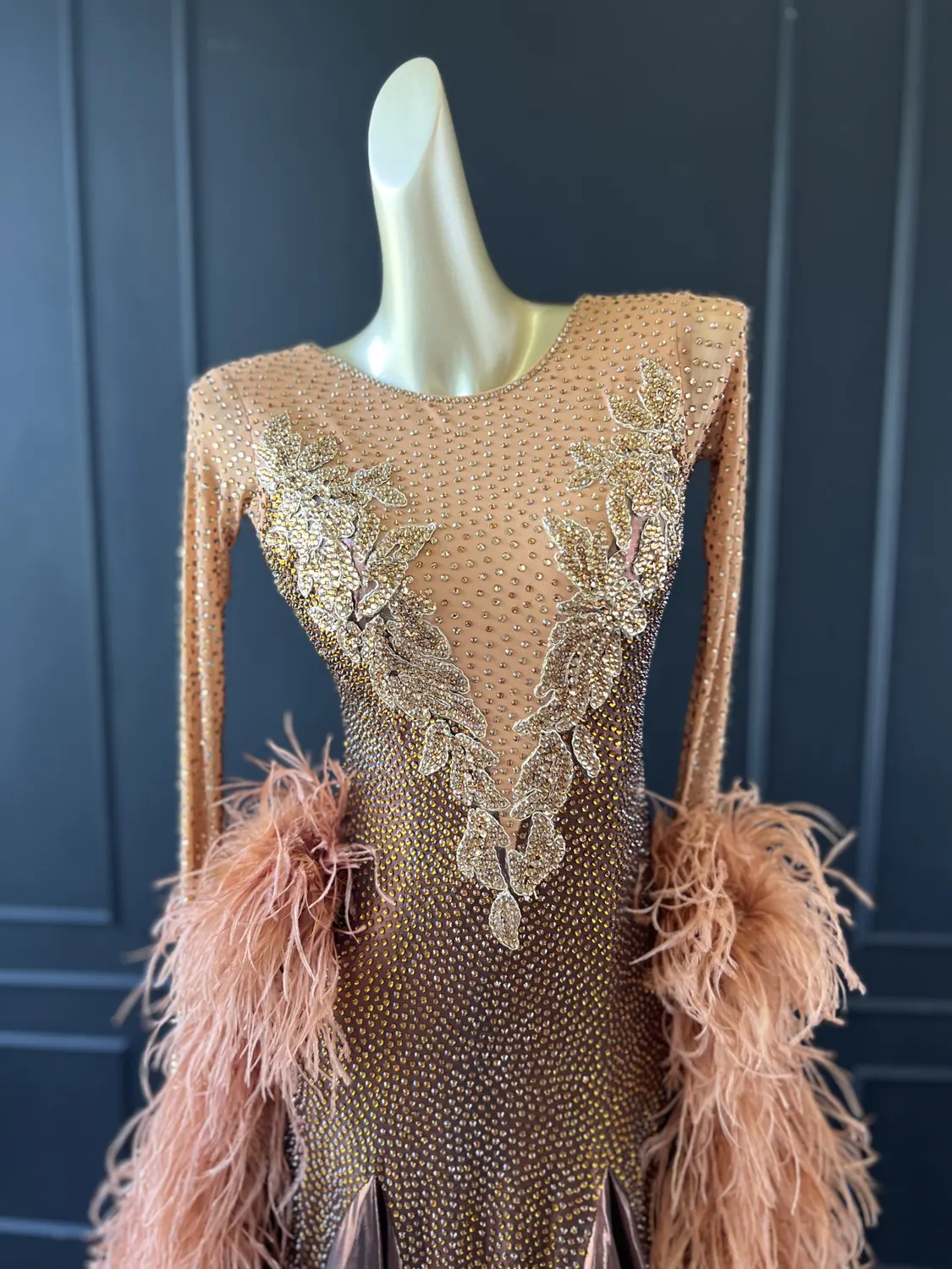 The bodice of this dress is made from metallic lycra which has limited additional stretch. The dress also has heavily stoned. Therefore, this dress is best suited to a UK size 10 dancer. This dress has secure poppers at the gusset.