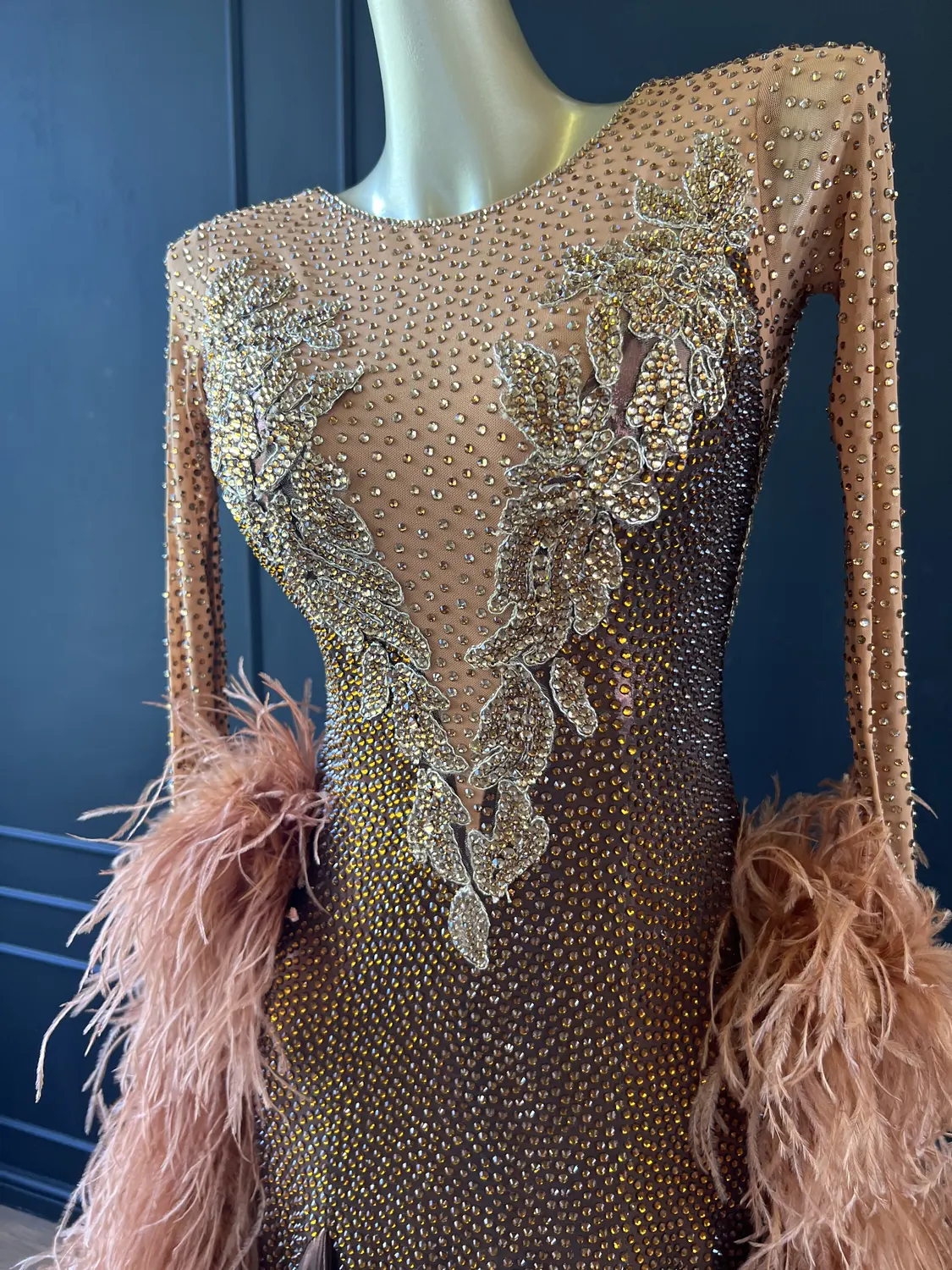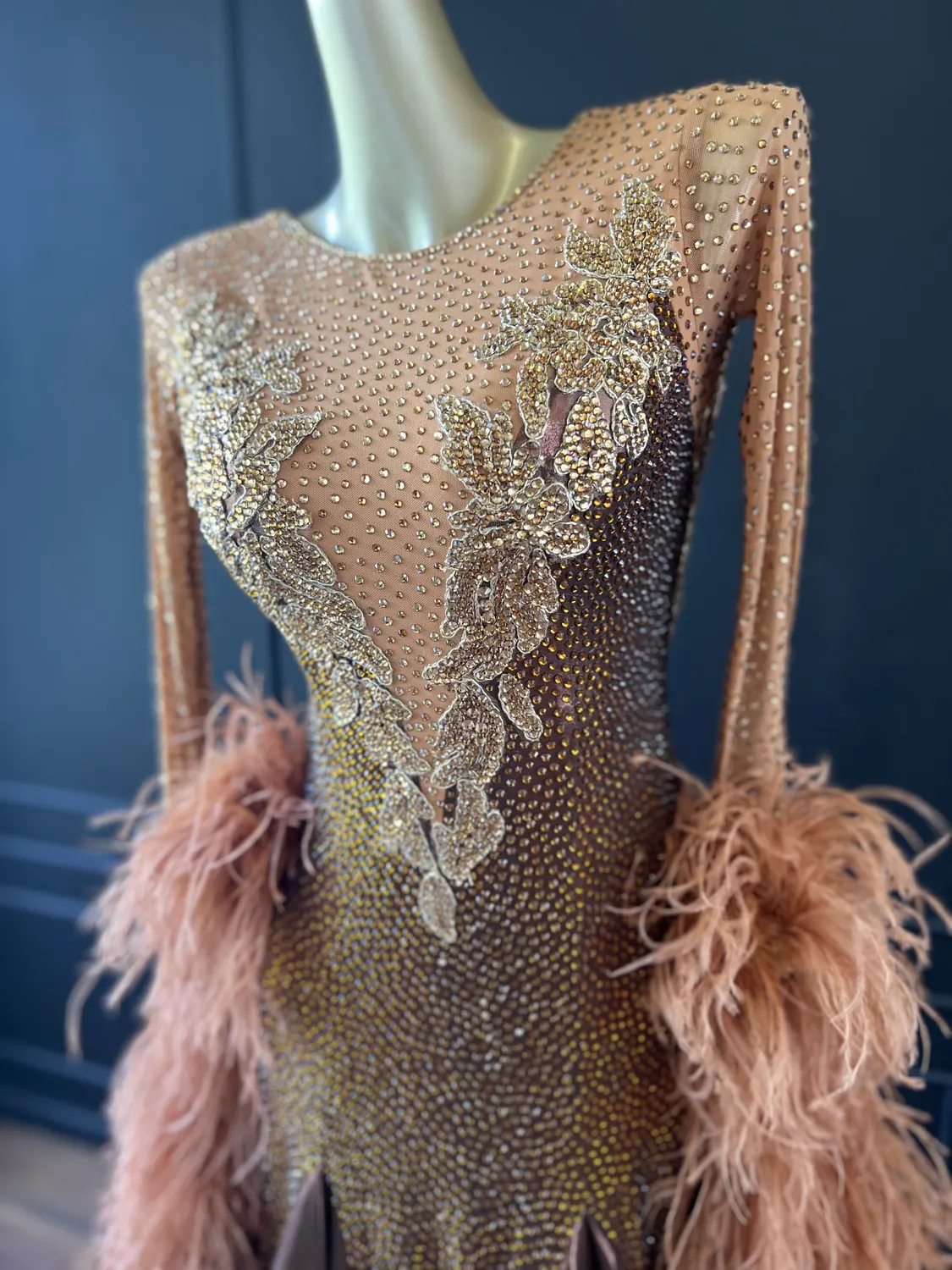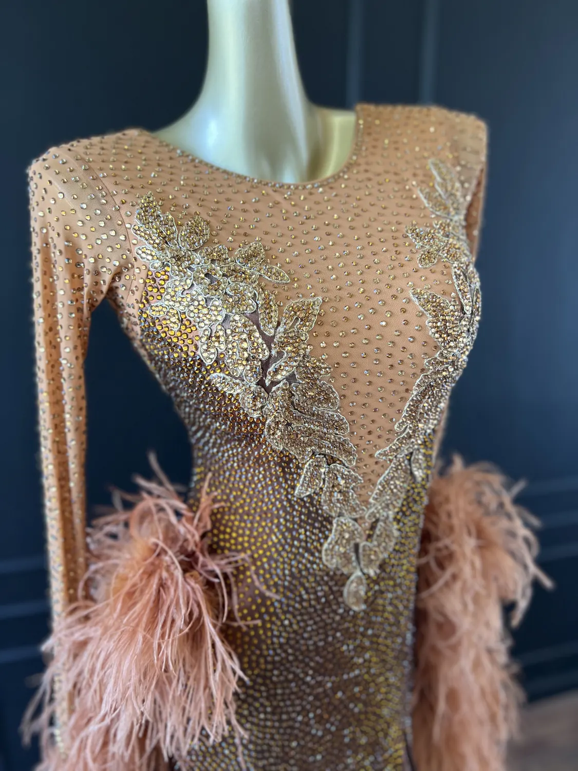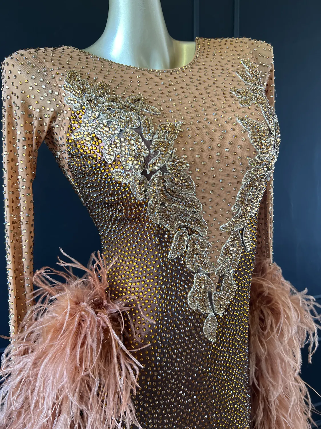 The bodice of this dress is made from metallic lycra which has limited additional stretch. The dress also has heavily stoned. Therefore, this dress is best suited to a UK size 10 dancer. This dress has secure poppers at the gusset.