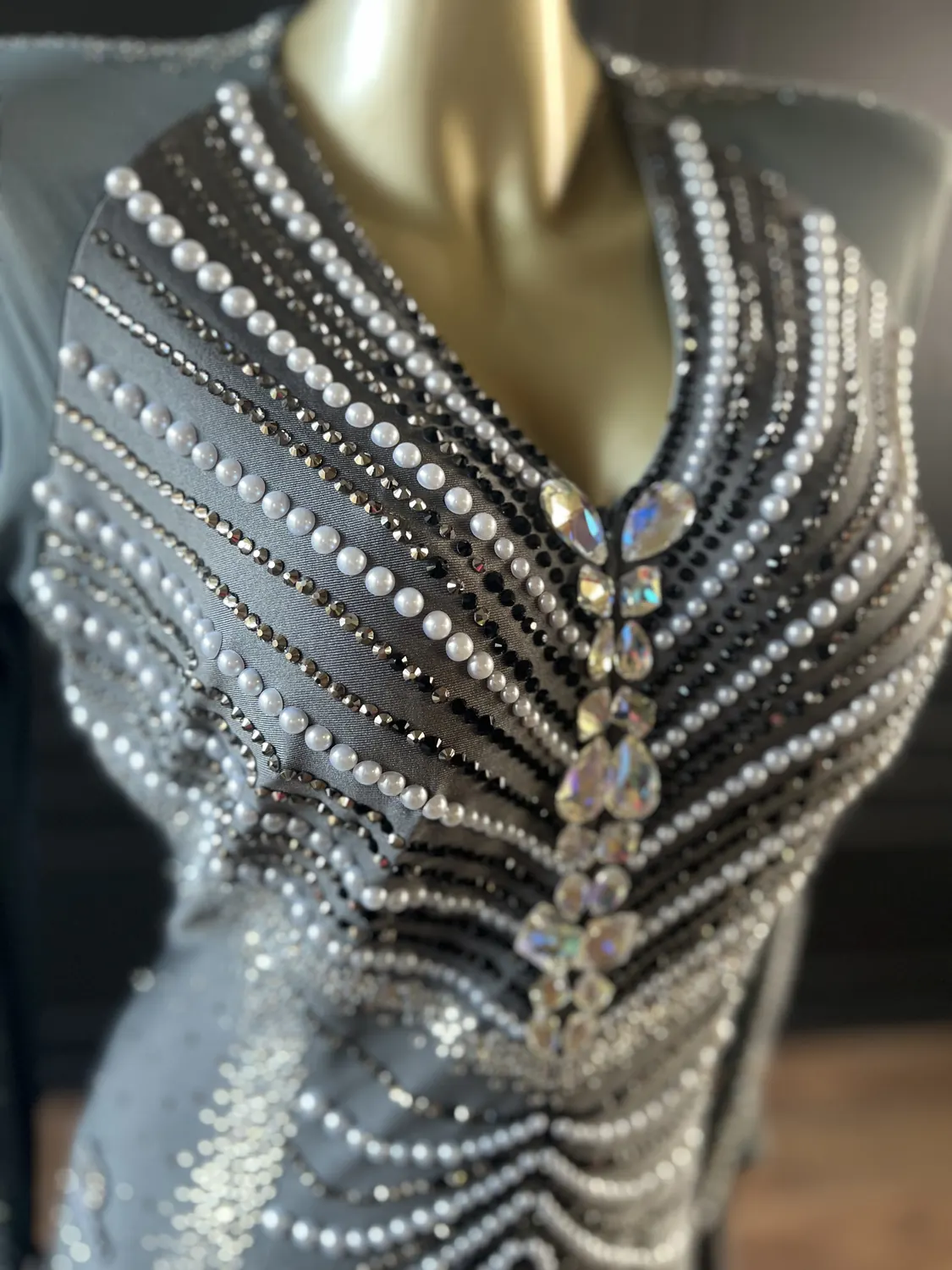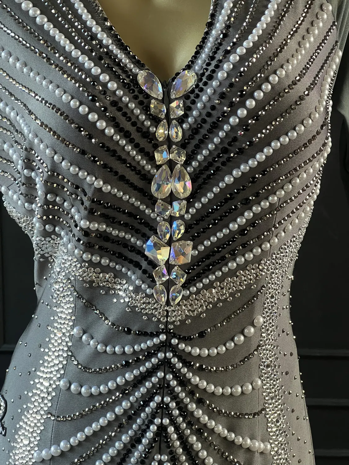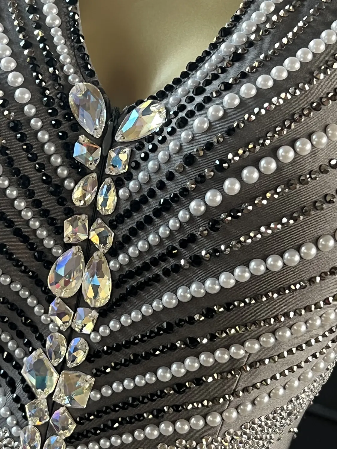 This dress, though heavily stoned, does not have restrictive stoning across the sides of the bodice thus allowing maximum stretch in the garment. This dress is therefore suitable for UK size 16-18+. This dress has a front zip which makes it particularly easy to get on and off and also allows for maximum stretch in the back. The stoning pattern on the back of the dress is strategically designed to hide a bra strap. This dress has secure poppers at the gusset.