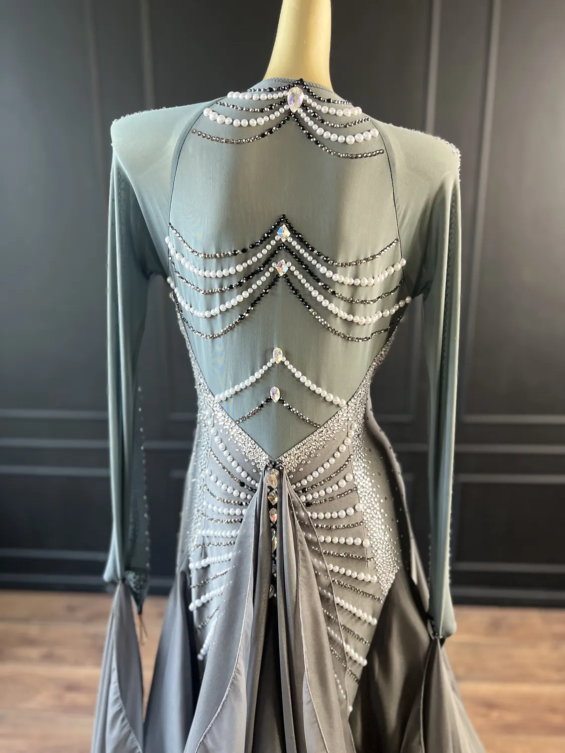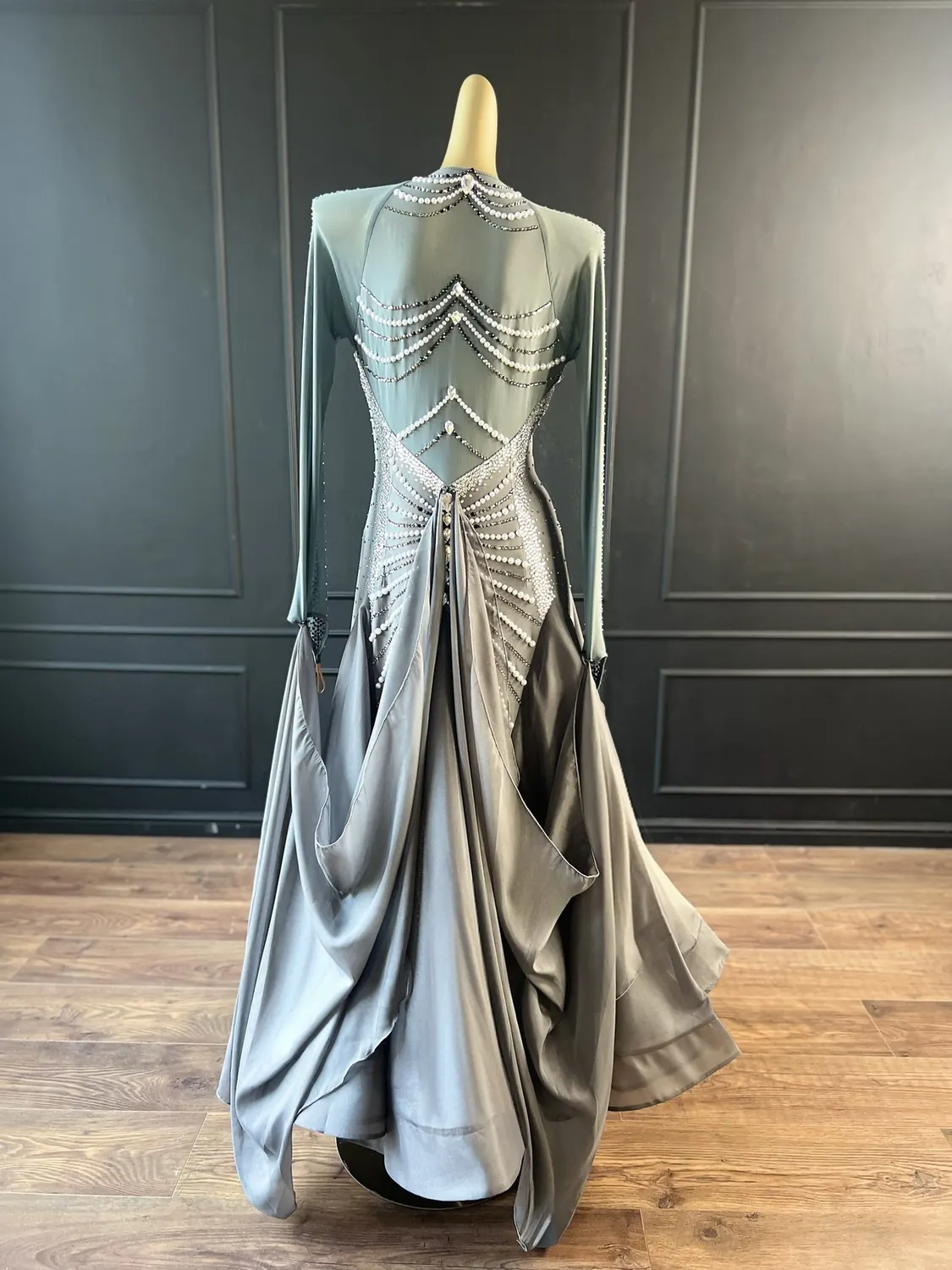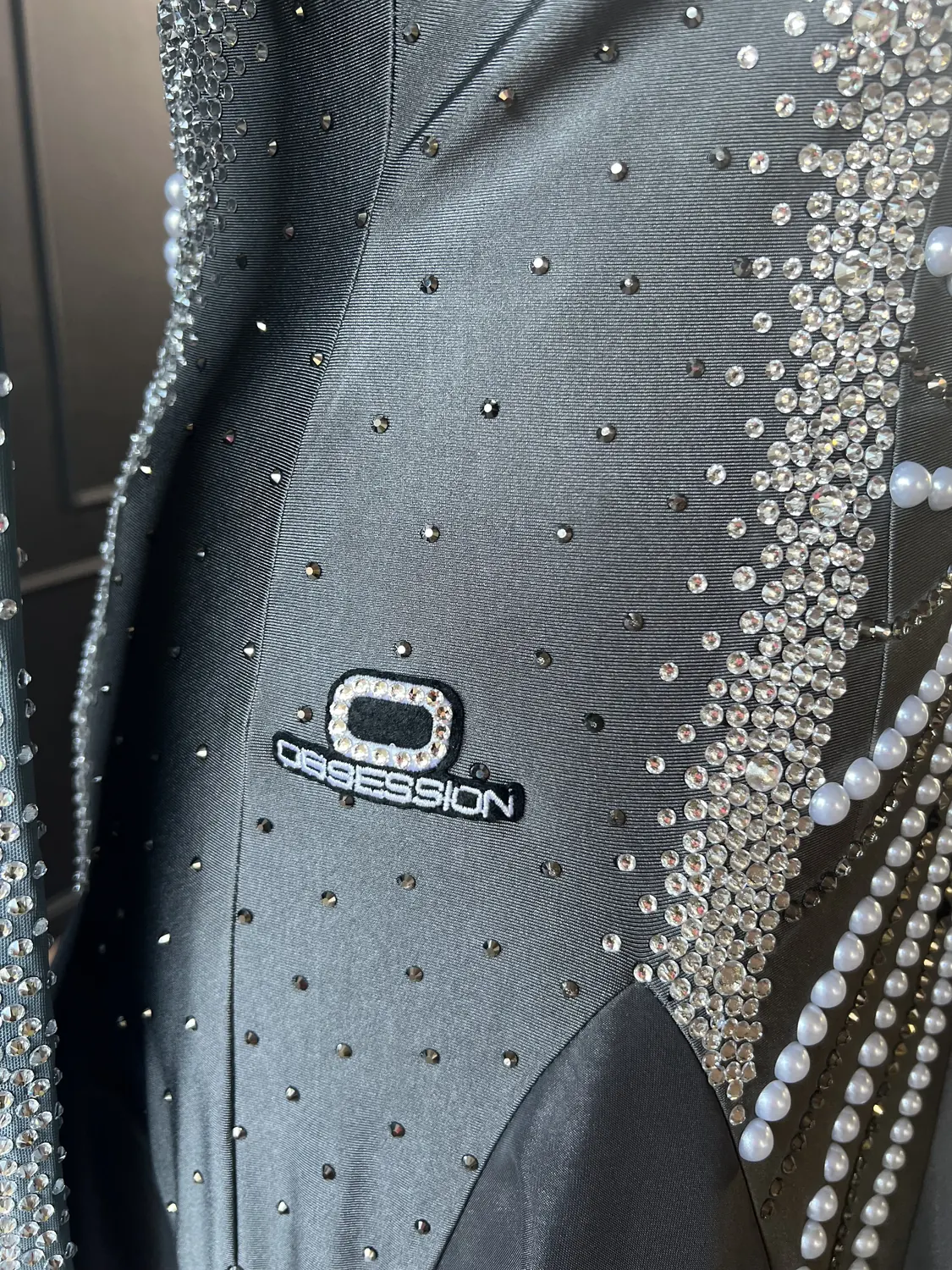 This dress, though heavily stoned, does not have restrictive stoning across the sides of the bodice thus allowing maximum stretch in the garment. This dress is therefore suitable for UK size 16-18+. This dress has a front zip which makes it particularly easy to get on and off and also allows for maximum stretch in the back. The stoning pattern on the back of the dress is strategically designed to hide a bra strap. This dress has secure poppers at the gusset.