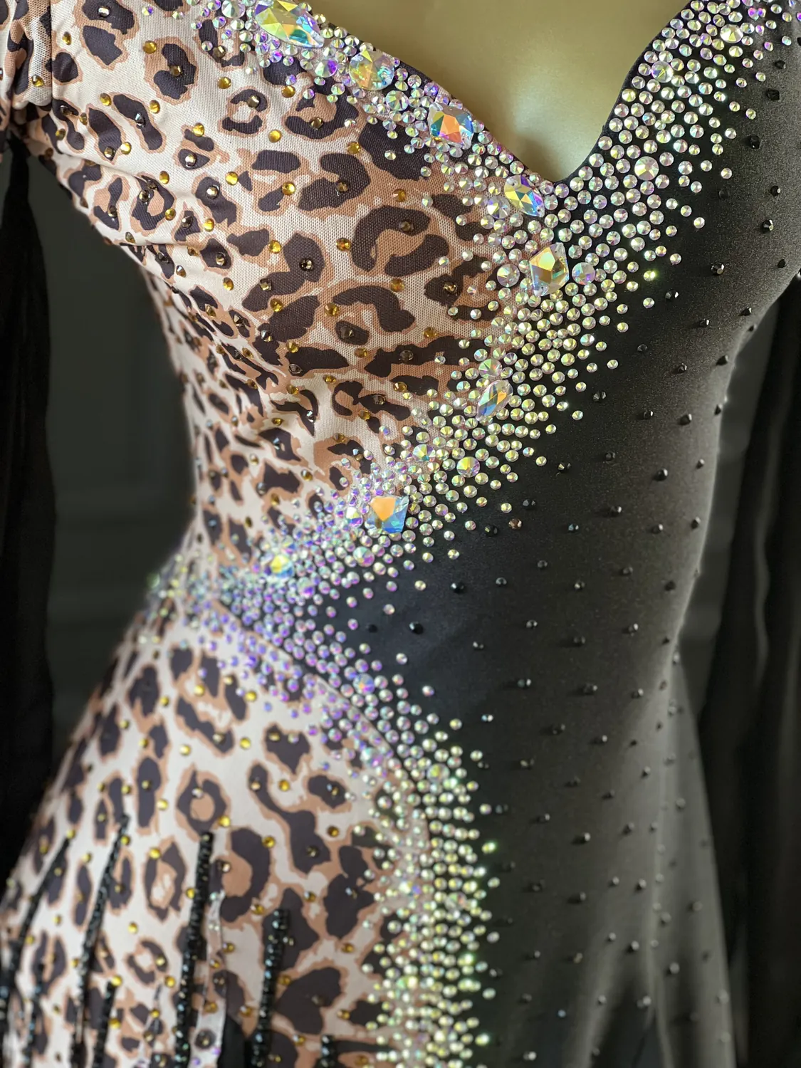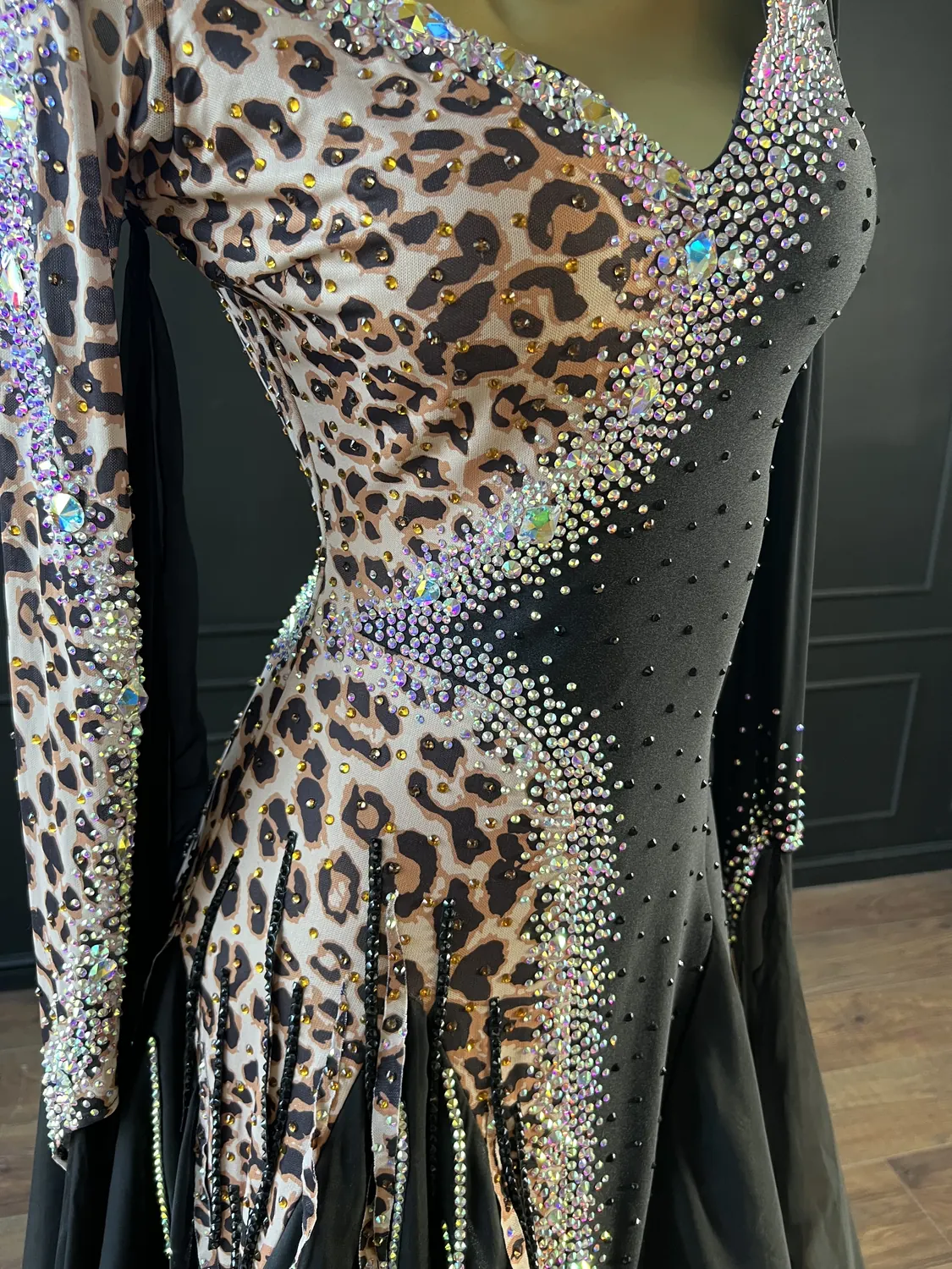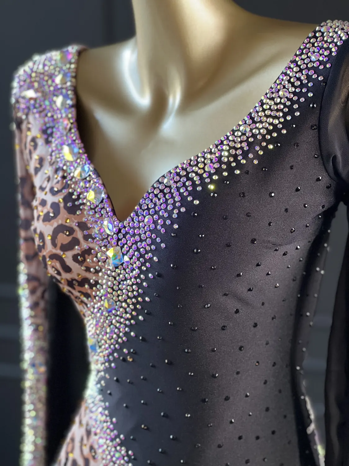 This dress is heavily stoned and has feature corset detailing which restricts the normal stretch offered by a lycra bodice. This dress is therefore most suitable for UK size 12 dancer. This dress has secure poppers at the gusset.