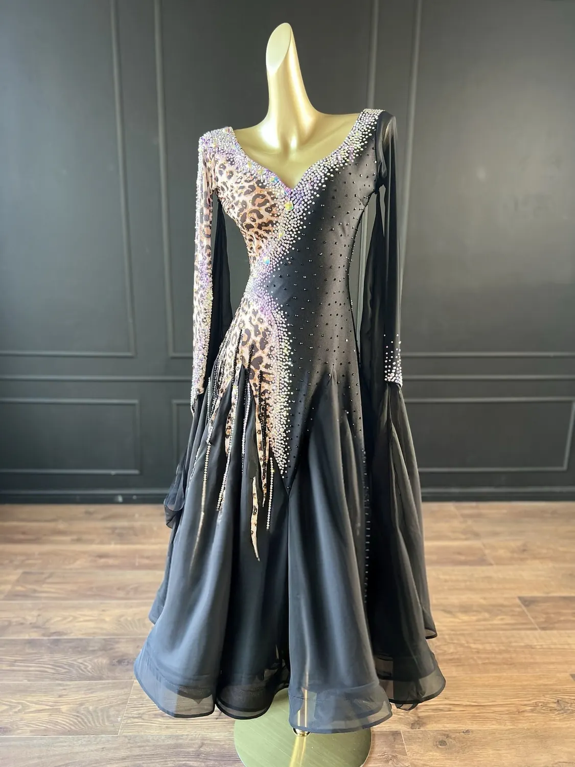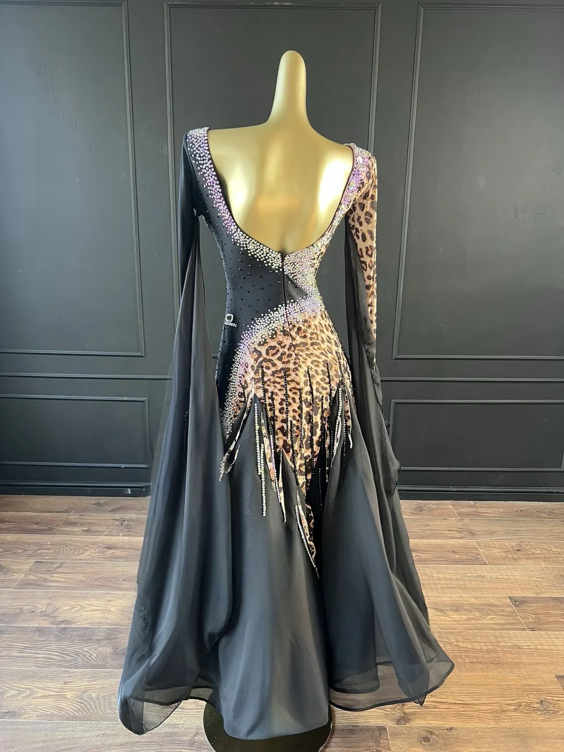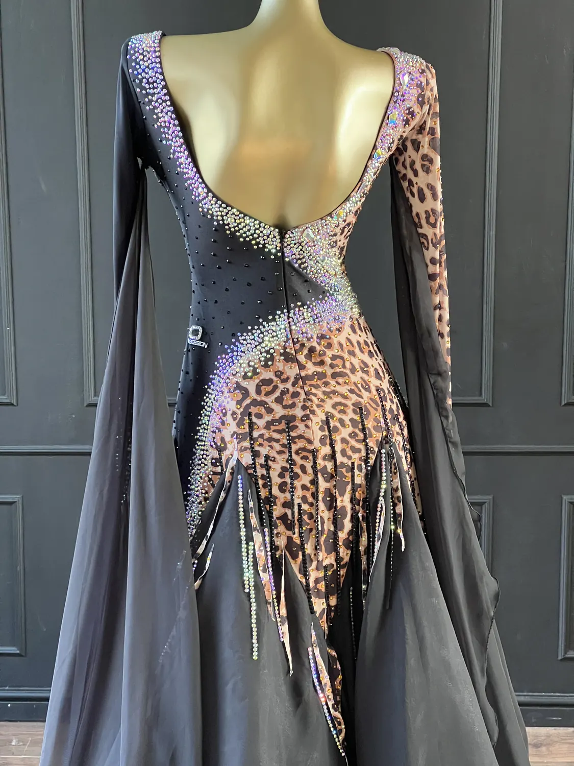 This dress is heavily stoned and has feature corset detailing which restricts the normal stretch offered by a lycra bodice. This dress is therefore most suitable for UK size 12 dancer. This dress has secure poppers at the gusset.