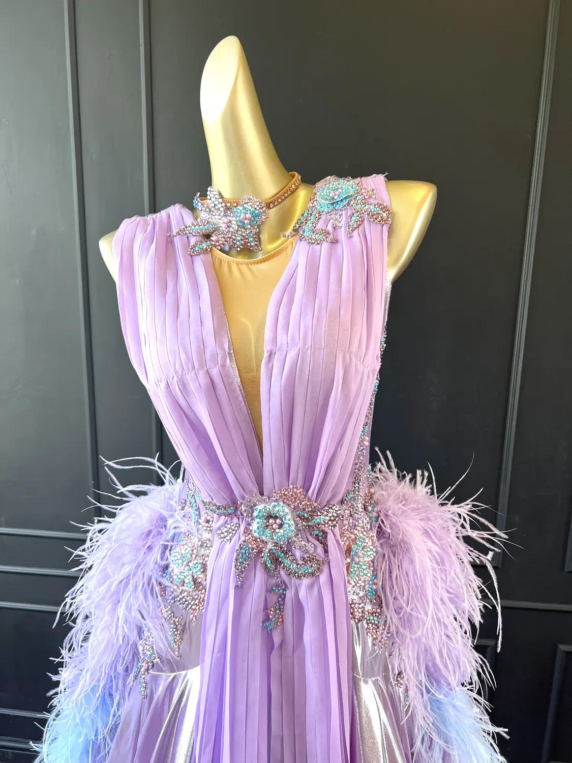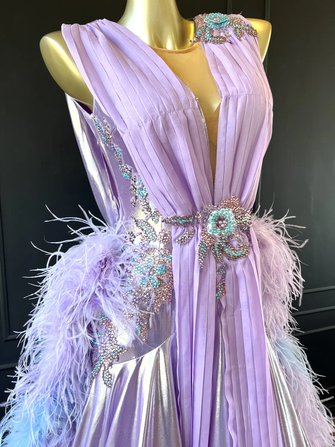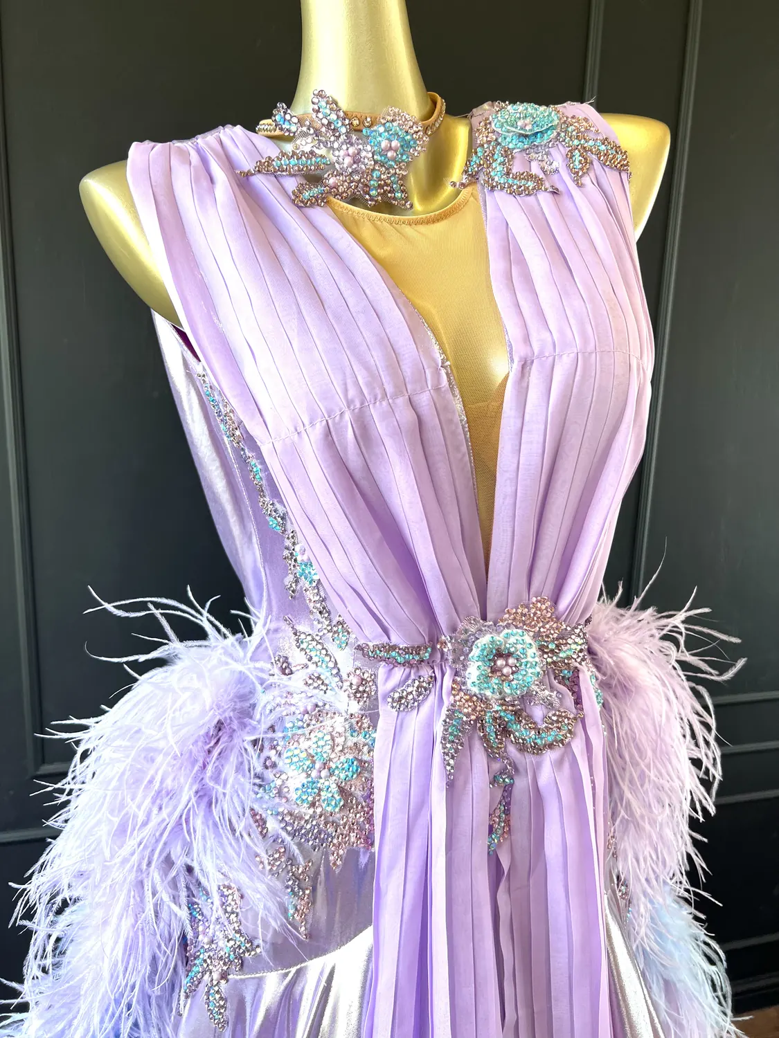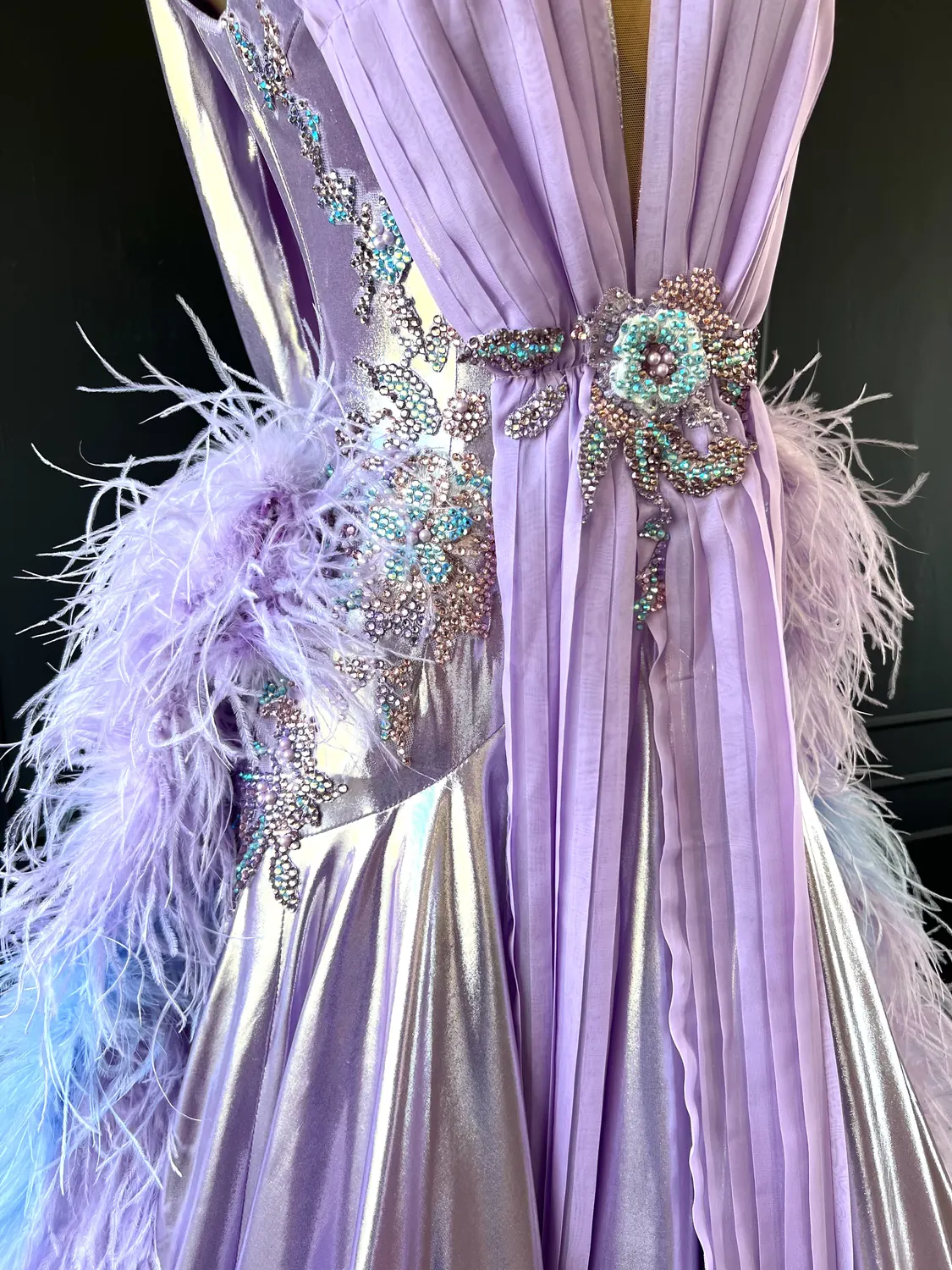 Ballroom competition dress in Lilac Shimmer metallic lycra and Lilac chiffon with Nutmeg (tan) mesh, Light Rose, Light Lilac, Tanzanite, Aquamarine and Aquamarine AB stoning, Lilac and Baby Blue Luxury Ostrich Feather Floats, feature stoned neckpiece and earrings.
