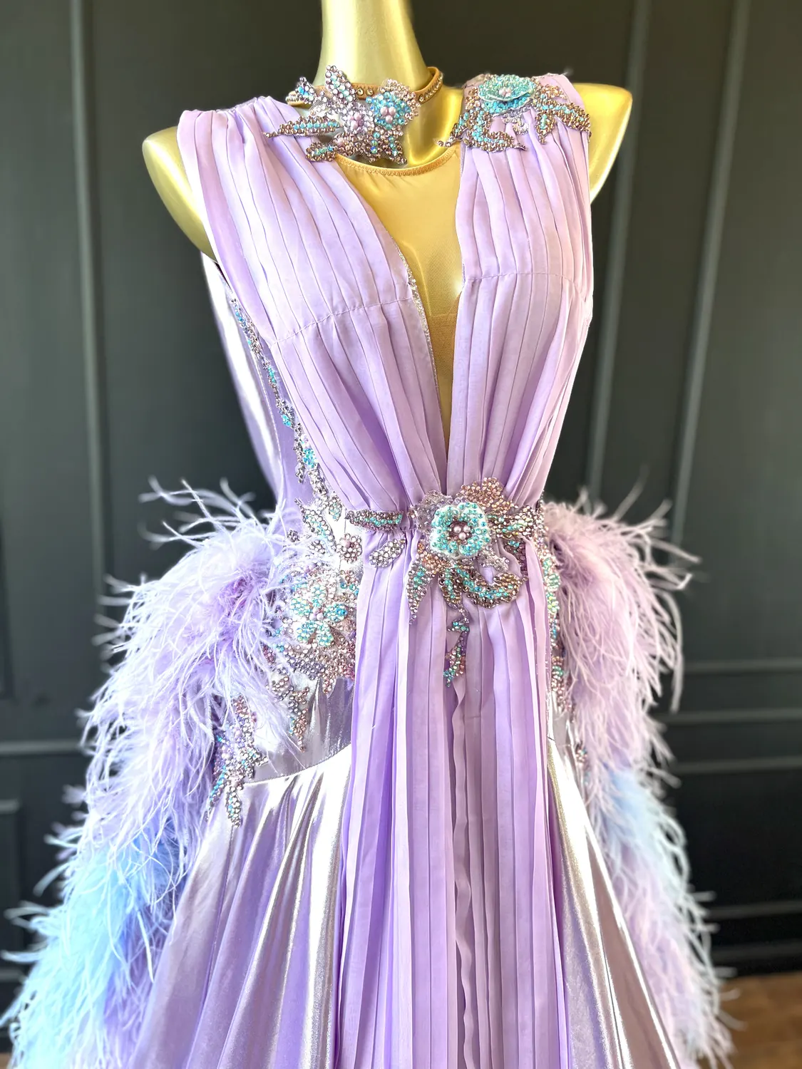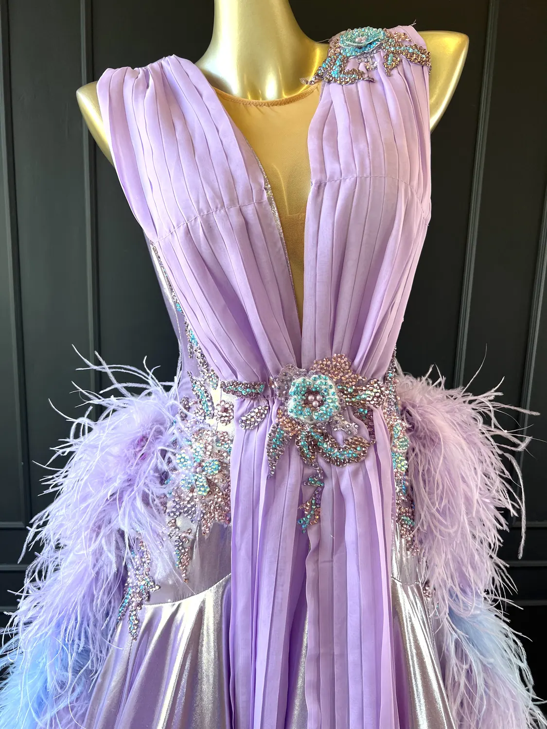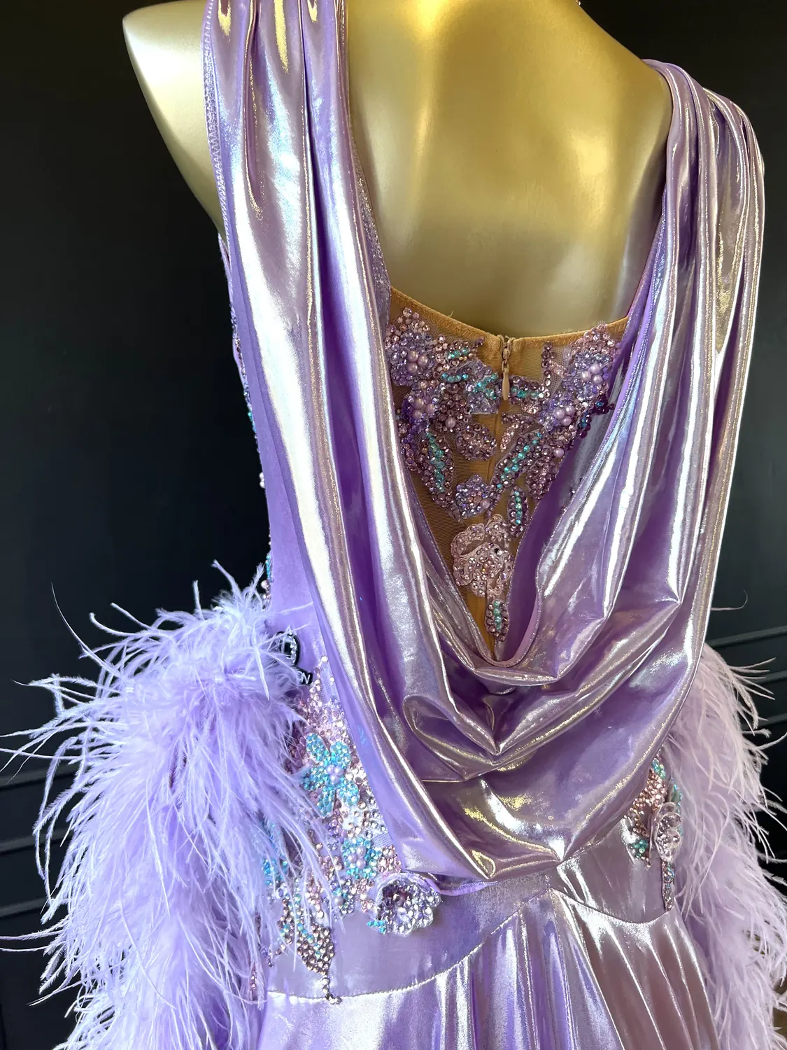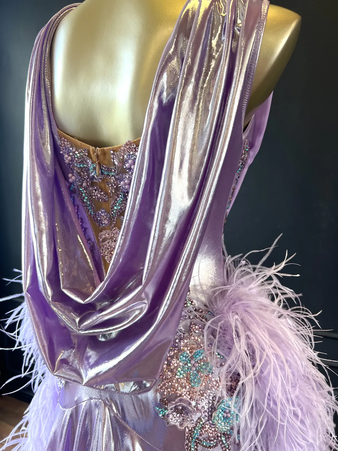 Ballroom competition dress in Lilac Shimmer metallic lycra and Lilac chiffon with Nutmeg (tan) mesh, Light Rose, Light Lilac, Tanzanite, Aquamarine and Aquamarine AB stoning, Lilac and Baby Blue Luxury Ostrich Feather Floats, feature stoned neckpiece and earrings.
