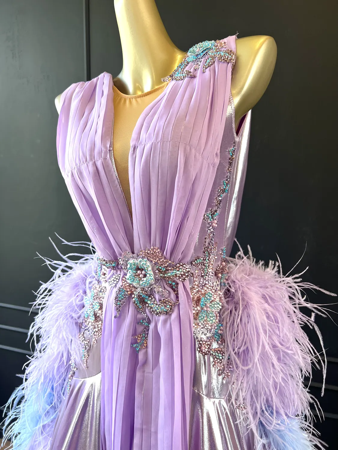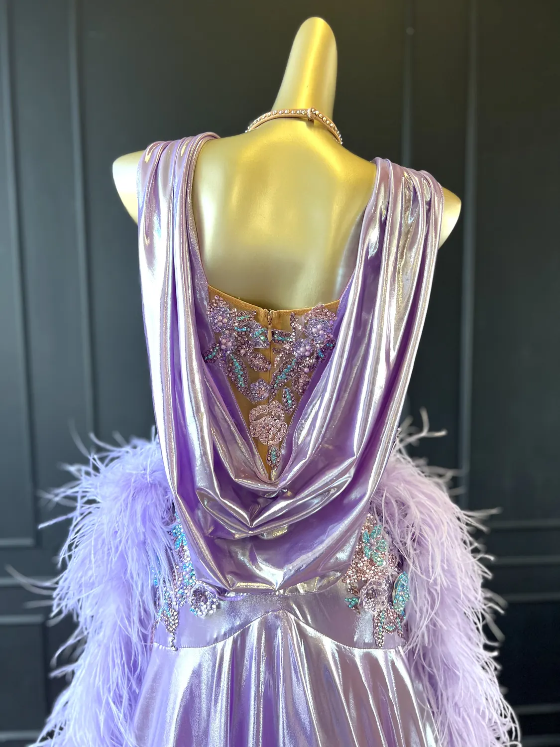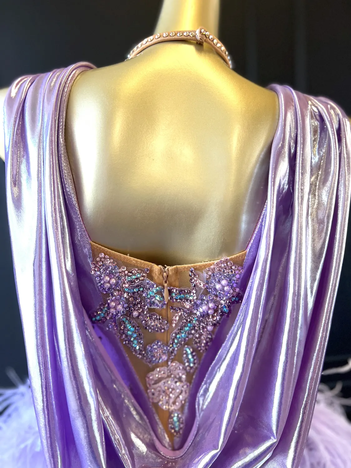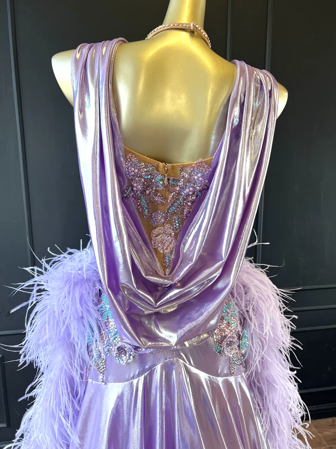 Ballroom competition dress in Lilac Shimmer metallic lycra and Lilac chiffon with Nutmeg (tan) mesh, Light Rose, Light Lilac, Tanzanite, Aquamarine and Aquamarine AB stoning, Lilac and Baby Blue Luxury Ostrich Feather Floats, feature stoned neckpiece and earrings.