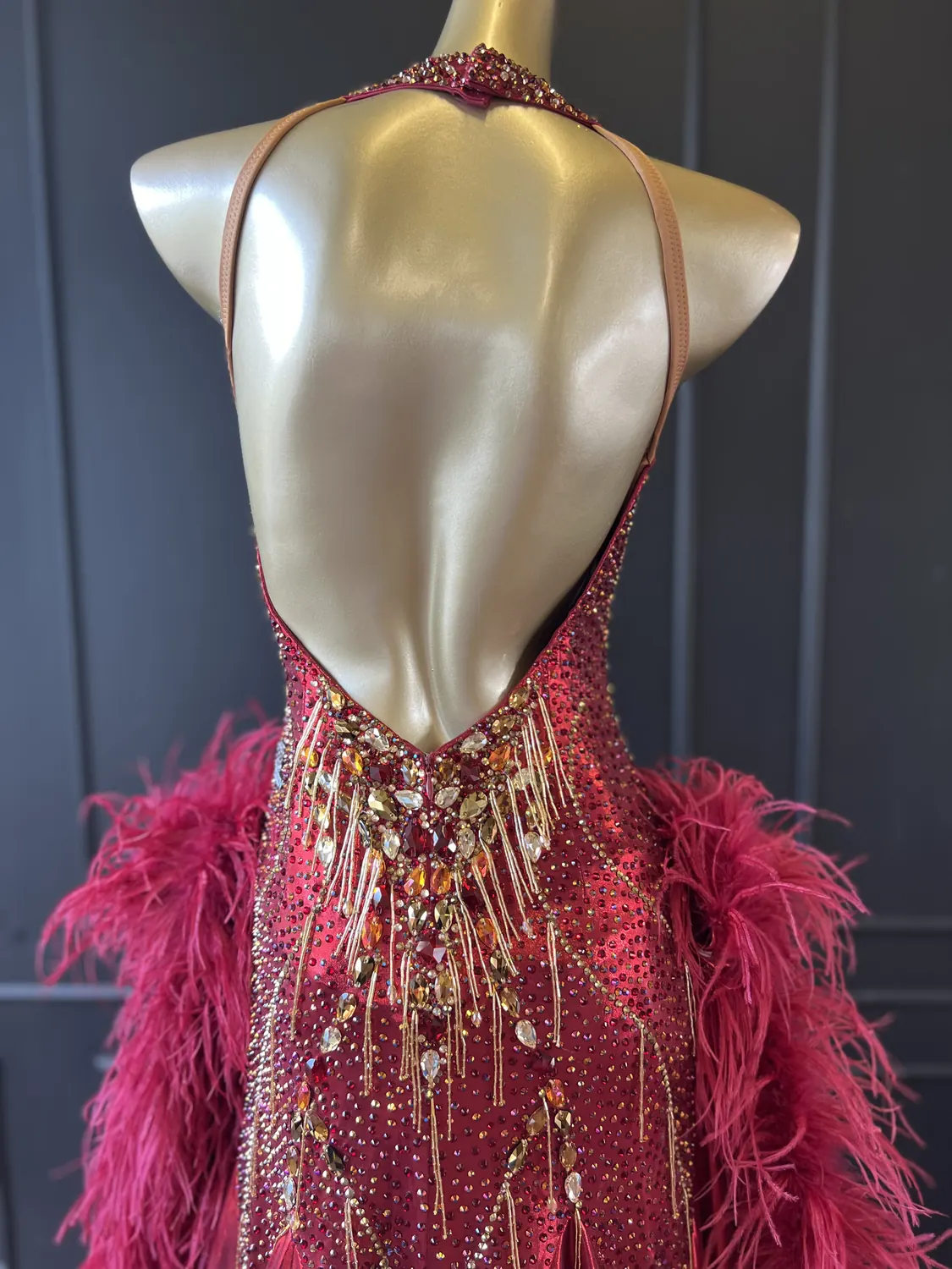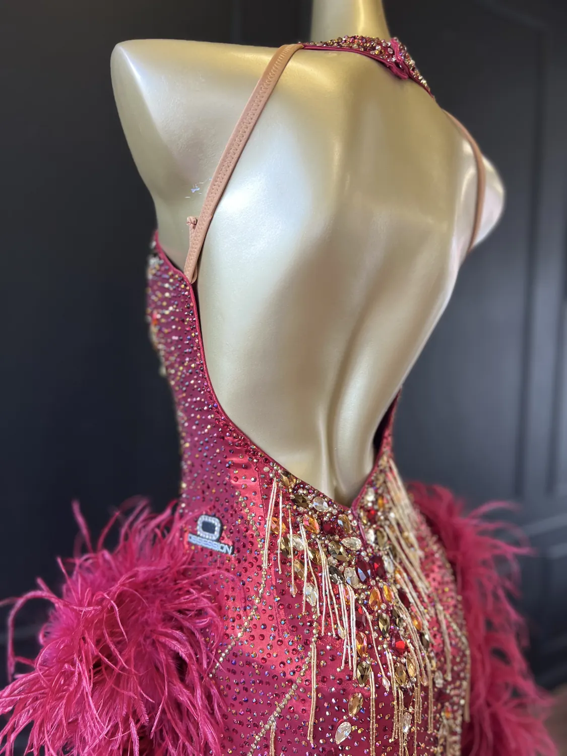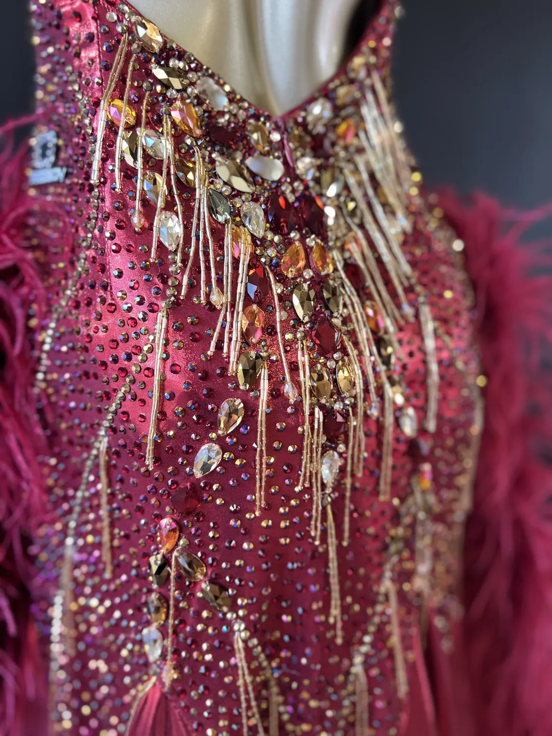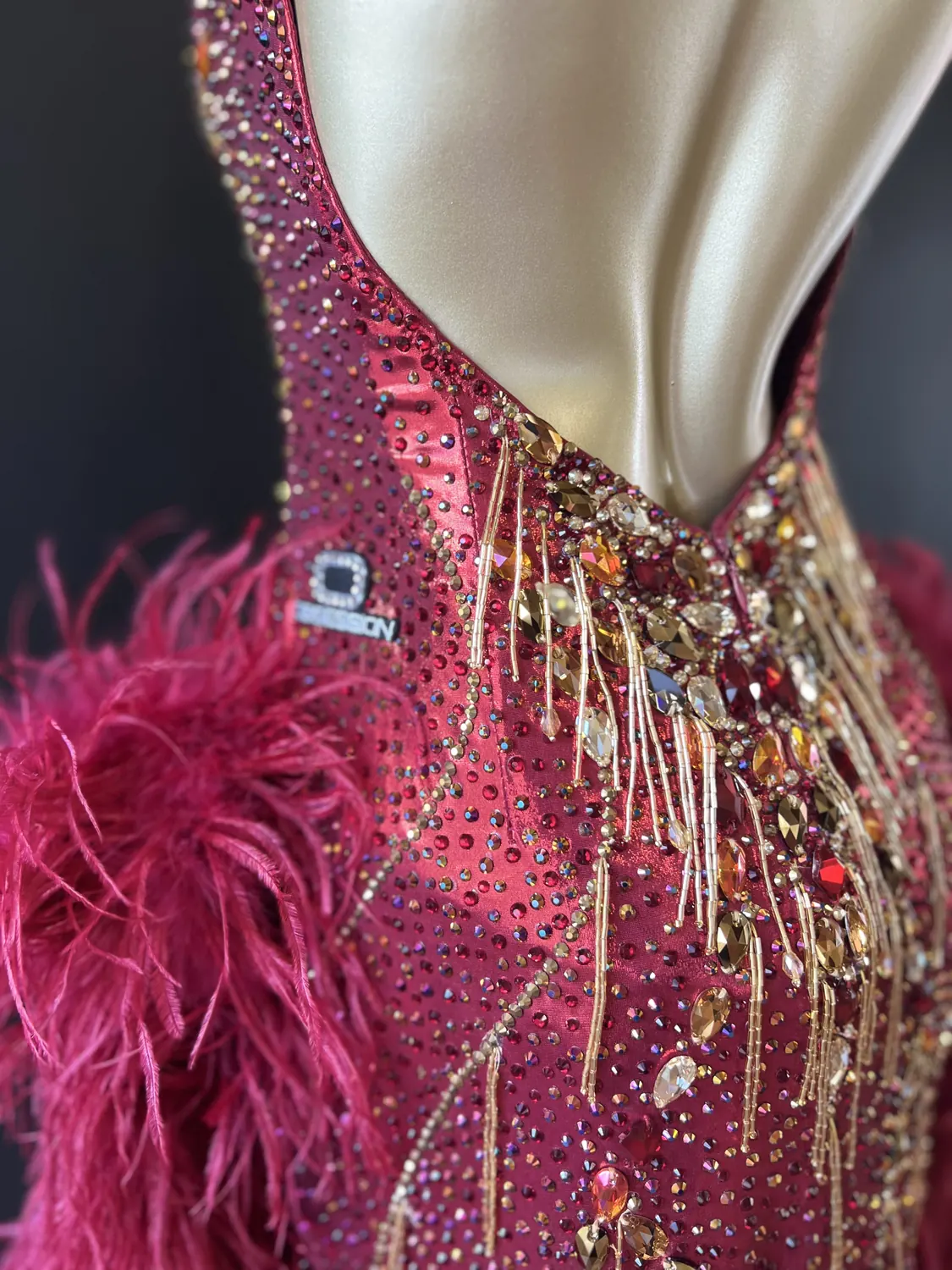 The bodice of this dress is made from metallic lycra which has limited additional stretch. The dress is also heavily stoned which further restricts the stretch. Therefore, this dress is best suited to a UK size 10 dancer. This dress has secure poppers at the gusset.