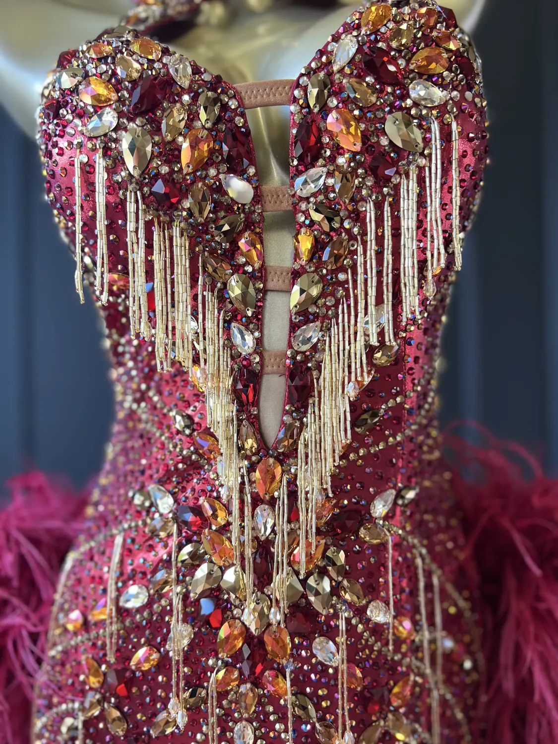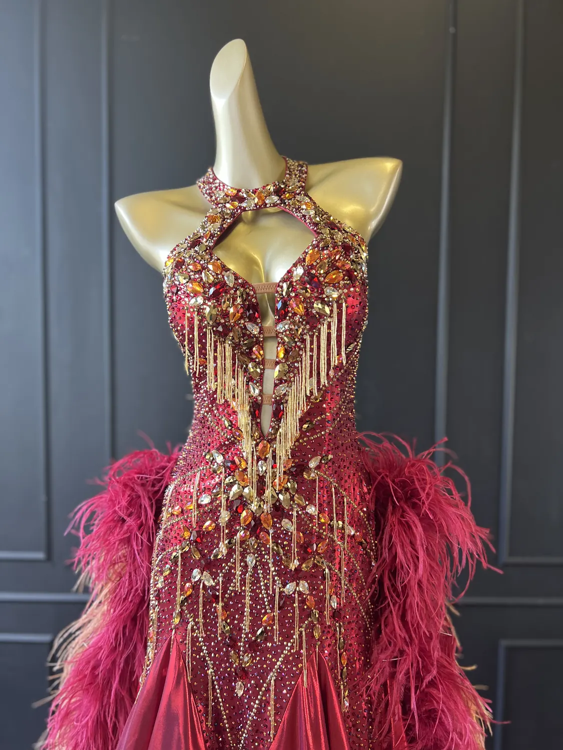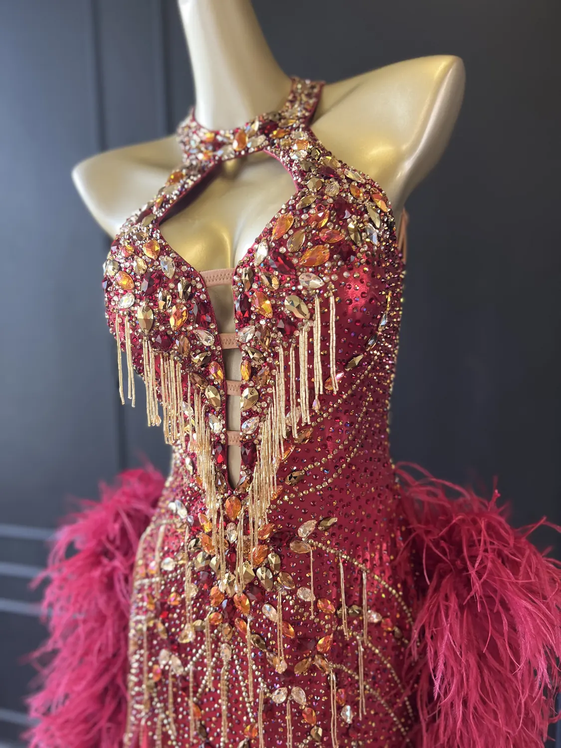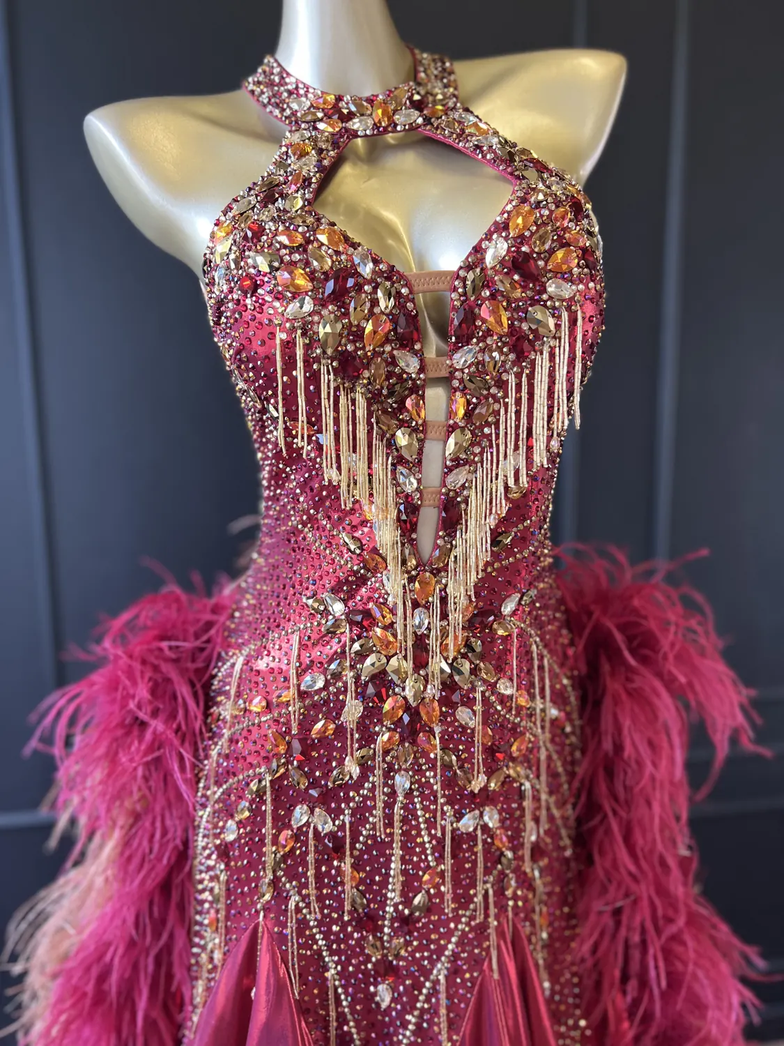 The bodice of this dress is made from metallic lycra which has limited additional stretch. The dress is also heavily stoned which further restricts the stretch. Therefore, this dress is best suited to a UK size 10 dancer. This dress has secure poppers at the gusset.