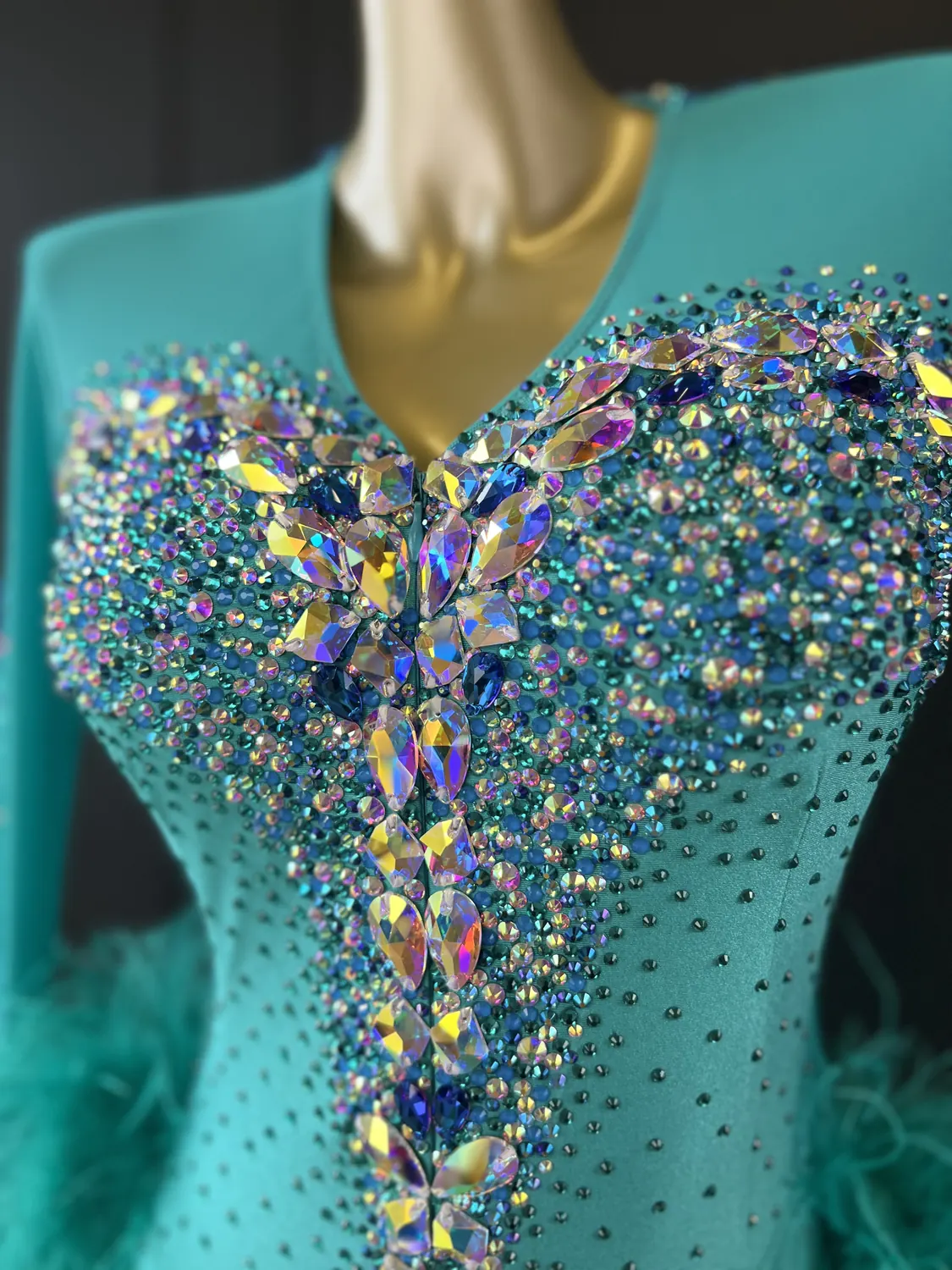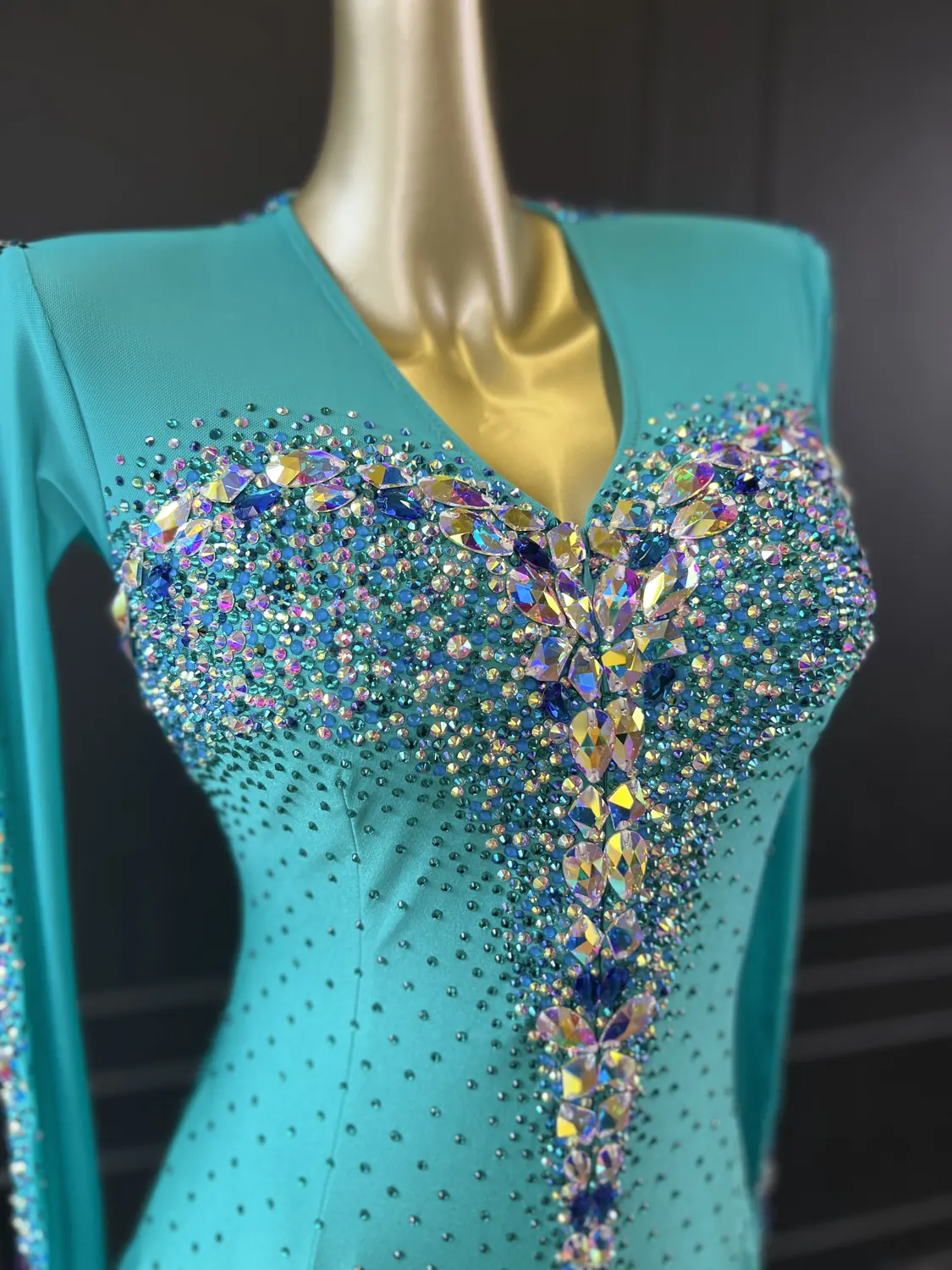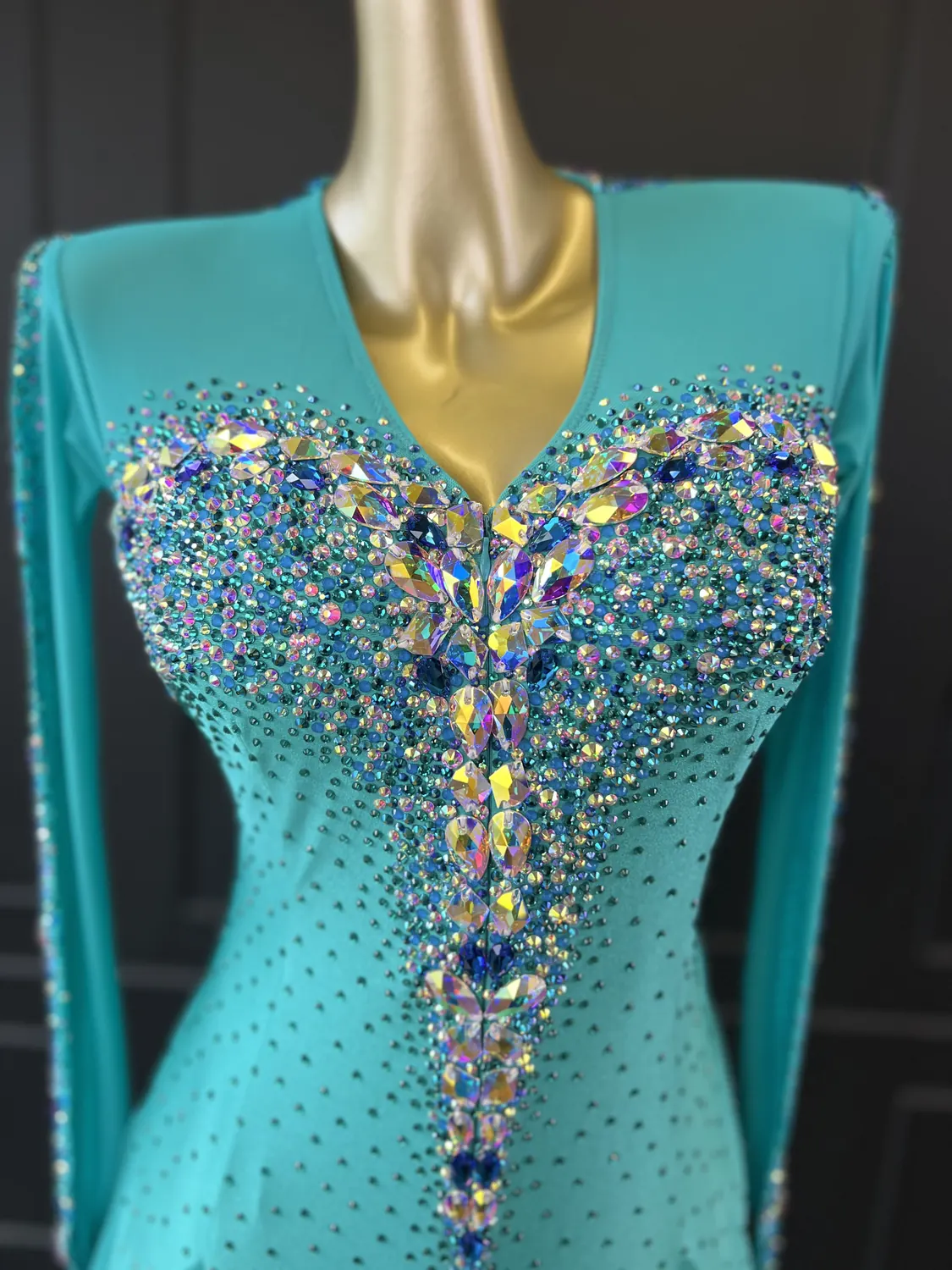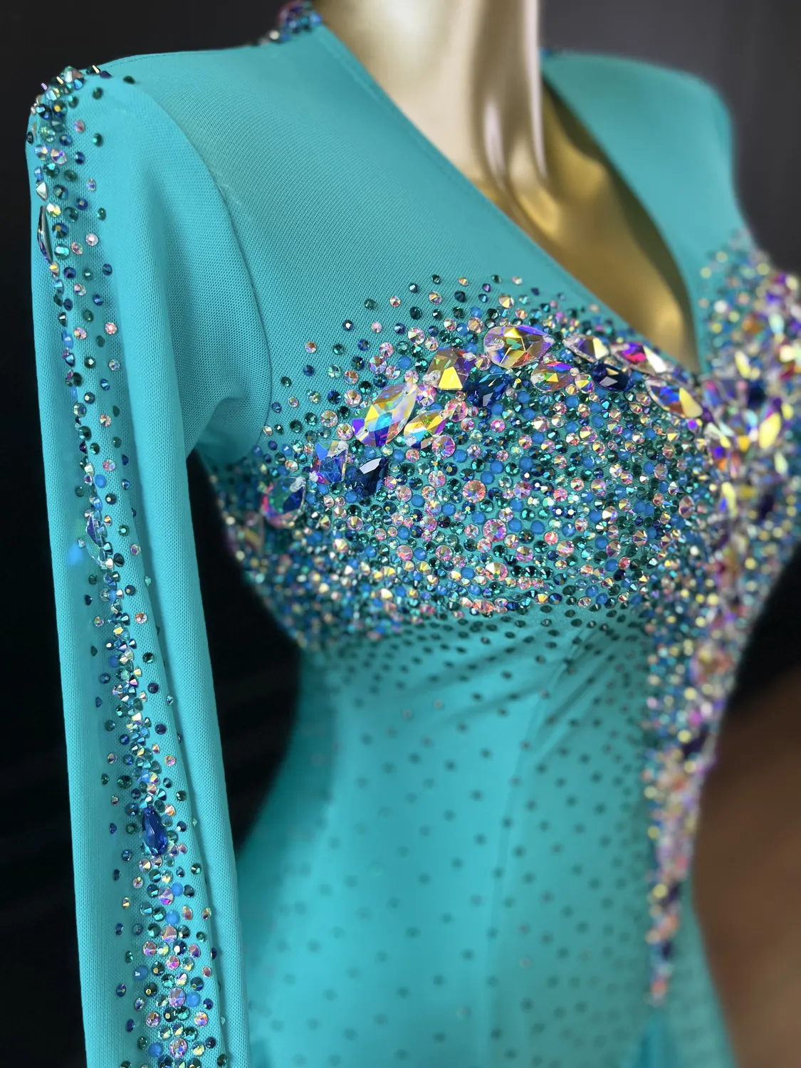 The feature stoning on this dress does not restrict the considerable stretch in the bodice, therefore it is suitable for UK size 14/16+ . This dress has secure poppers at the gusset.