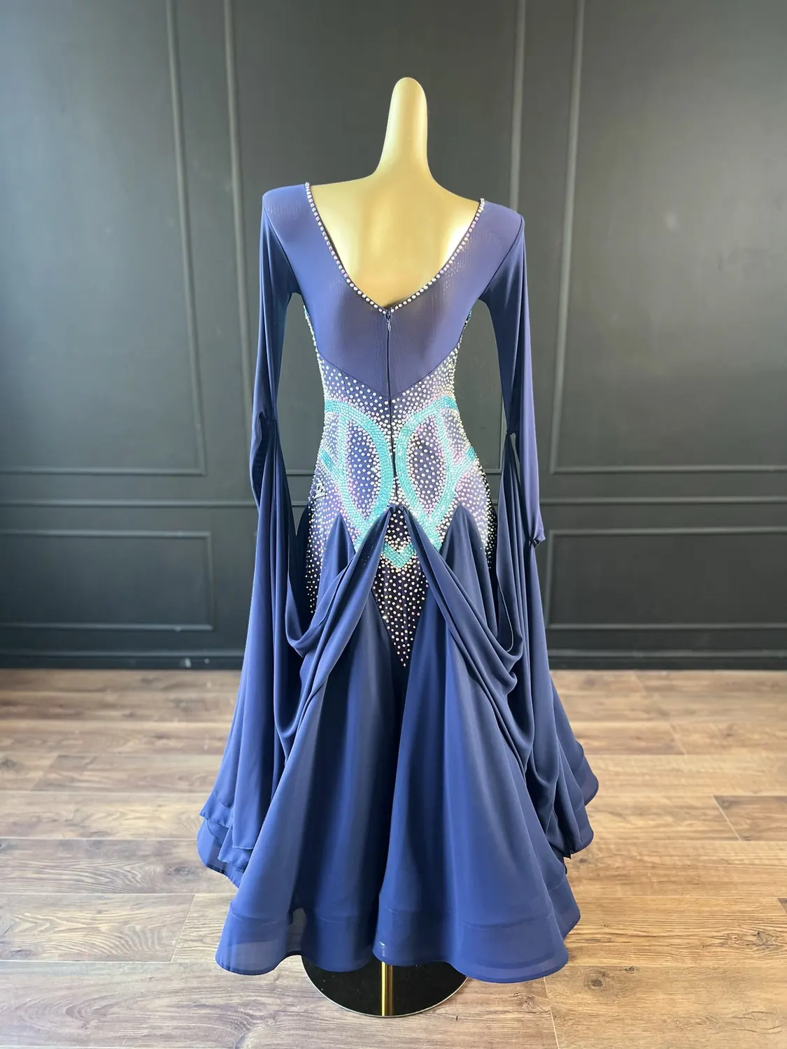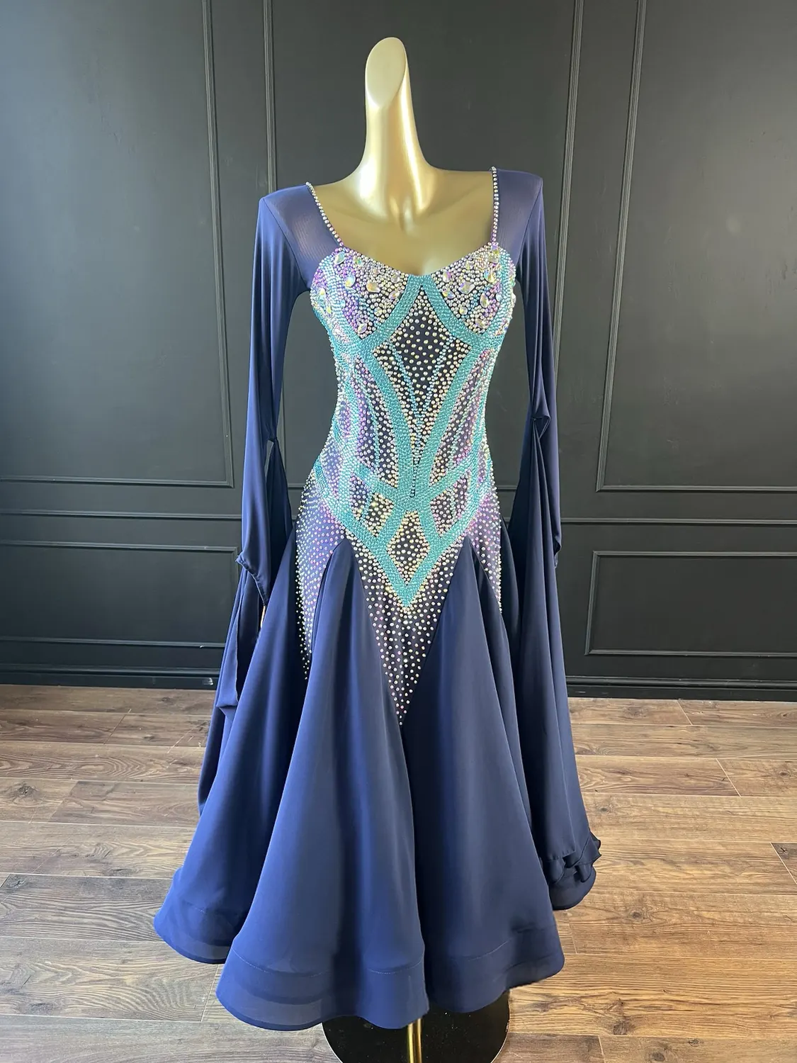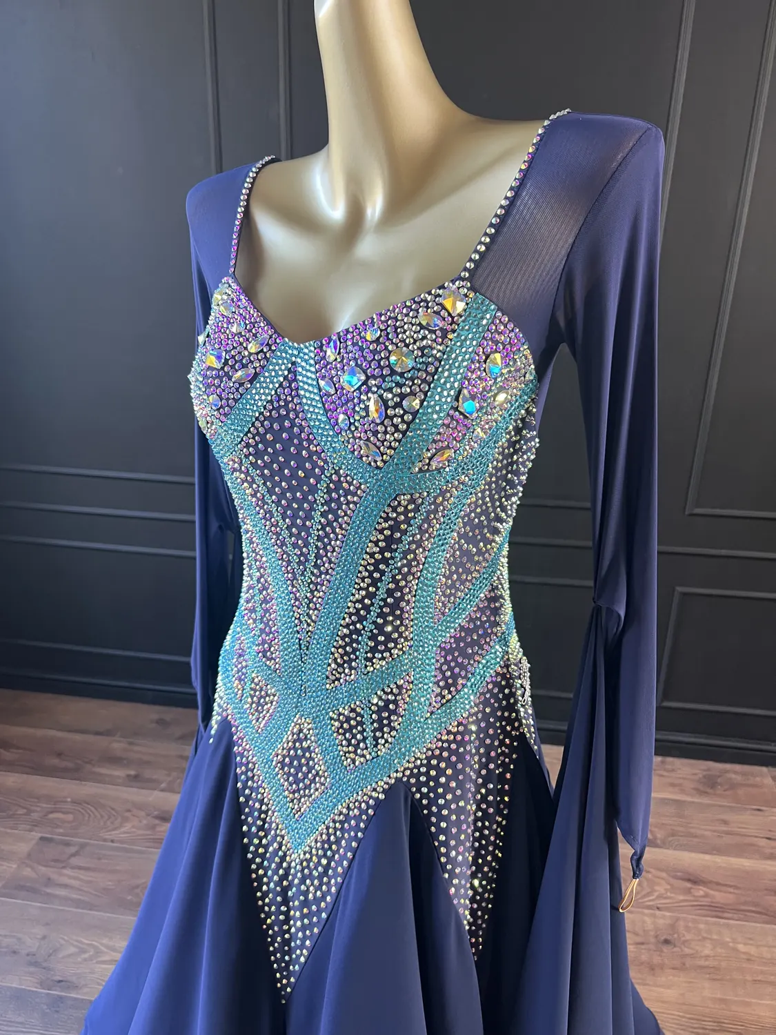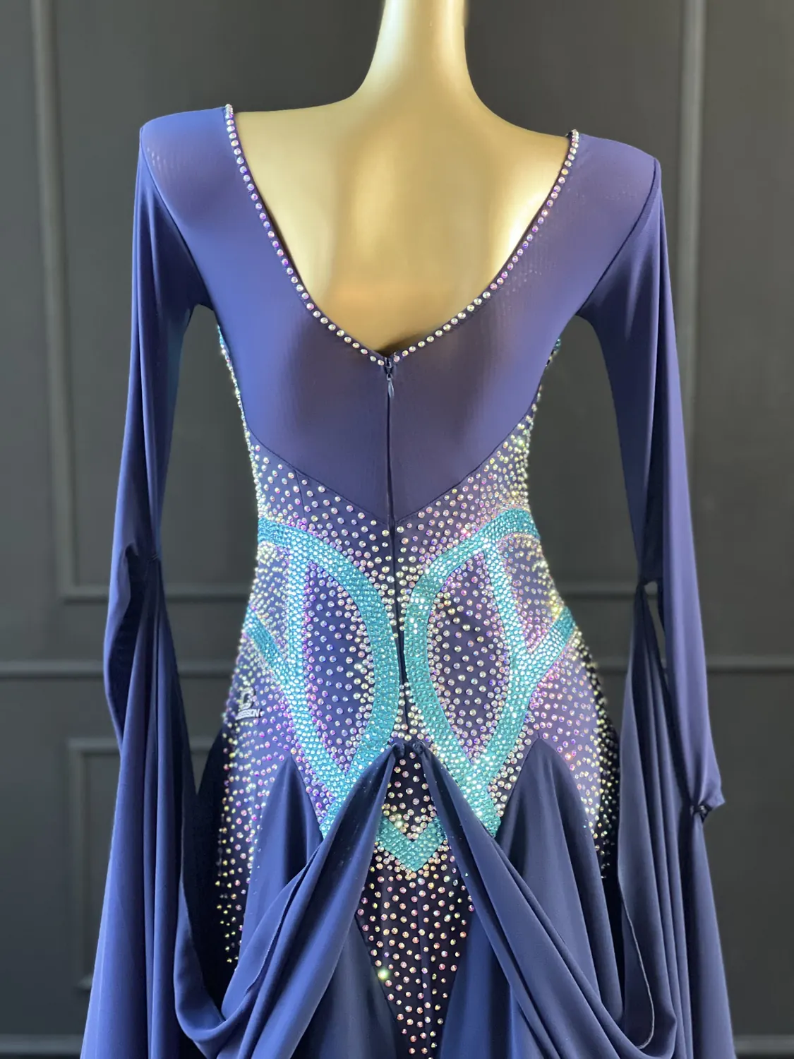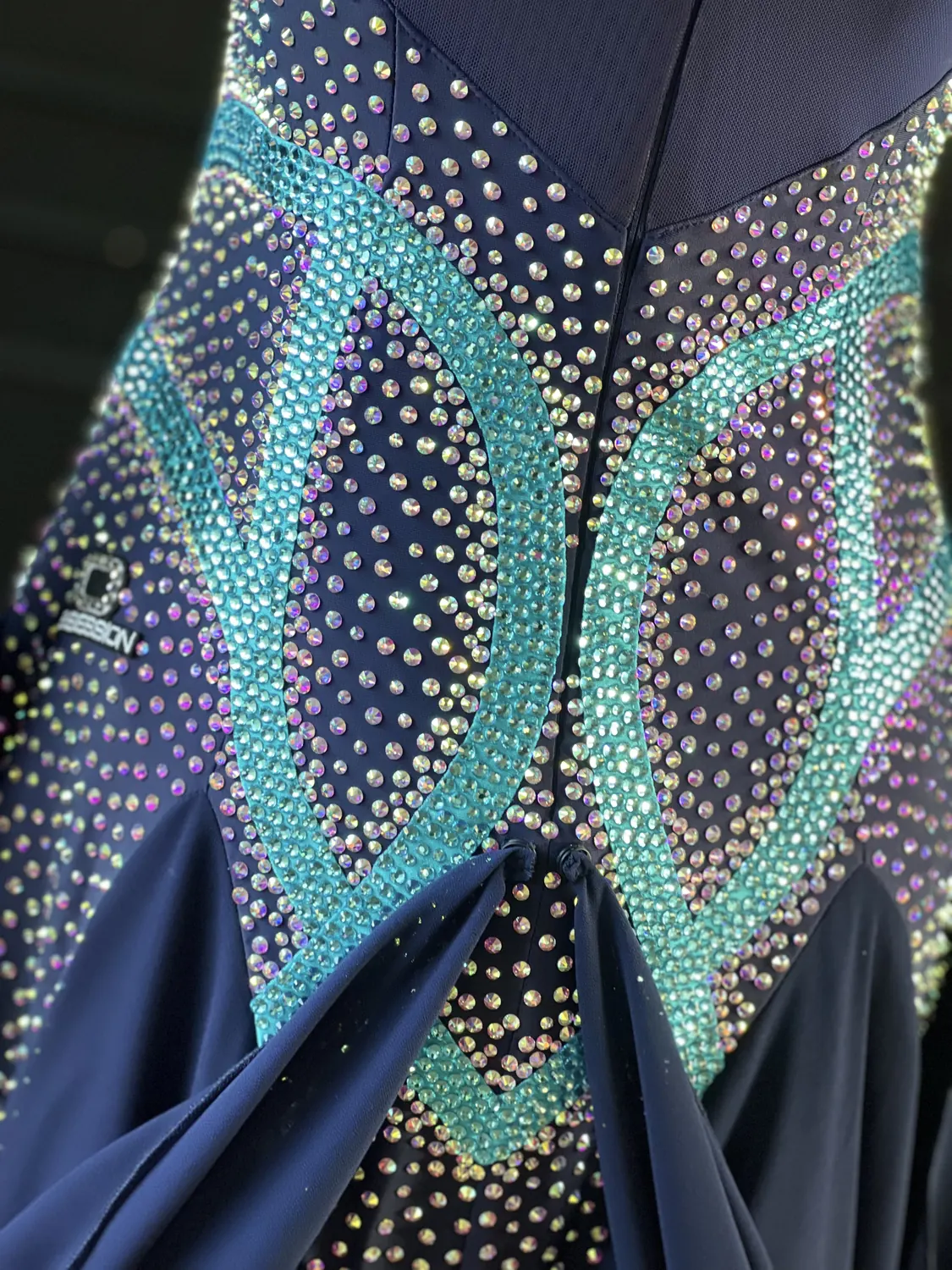 This dress is heavily stoned and has feature corset detailing which restricts the normal stretch offered by a lycra bodice. This dress is therefore most suitable for UK size 12-14 dancer with a small/medium bust. This dress has secure poppers at the gusset.