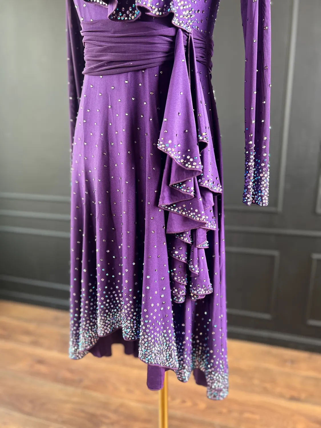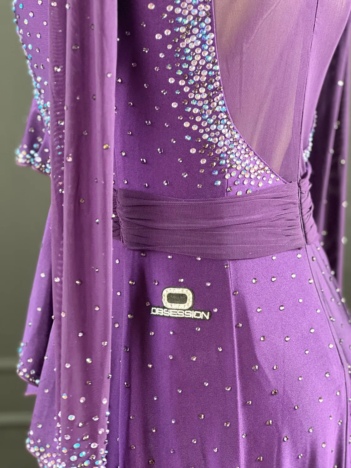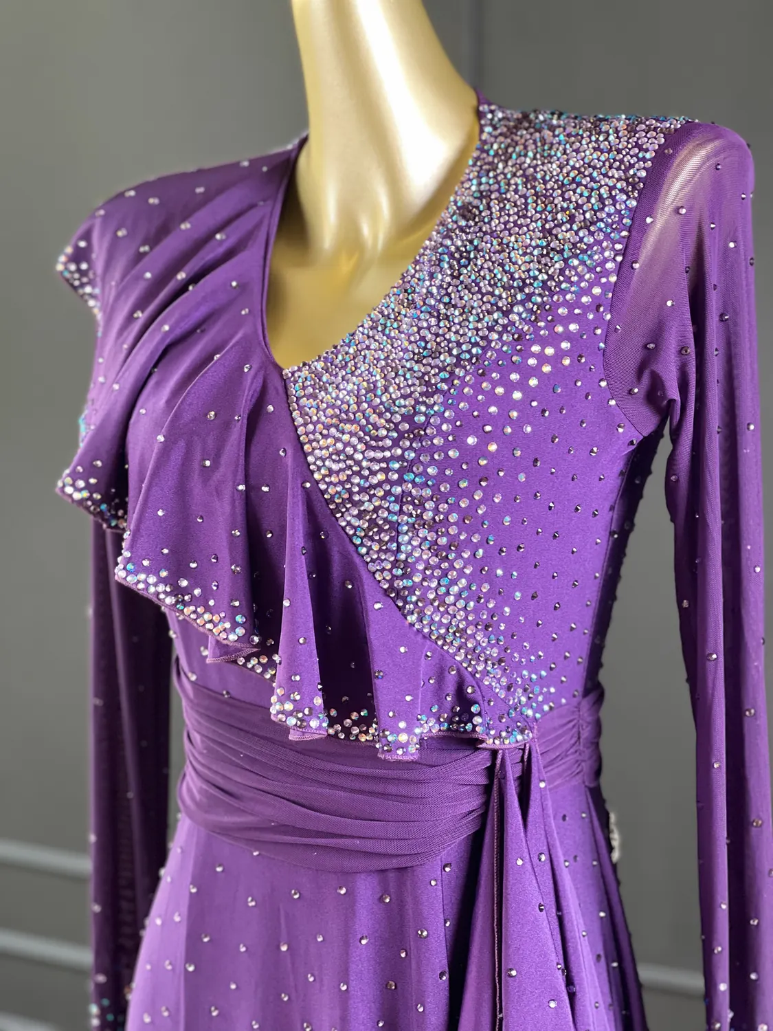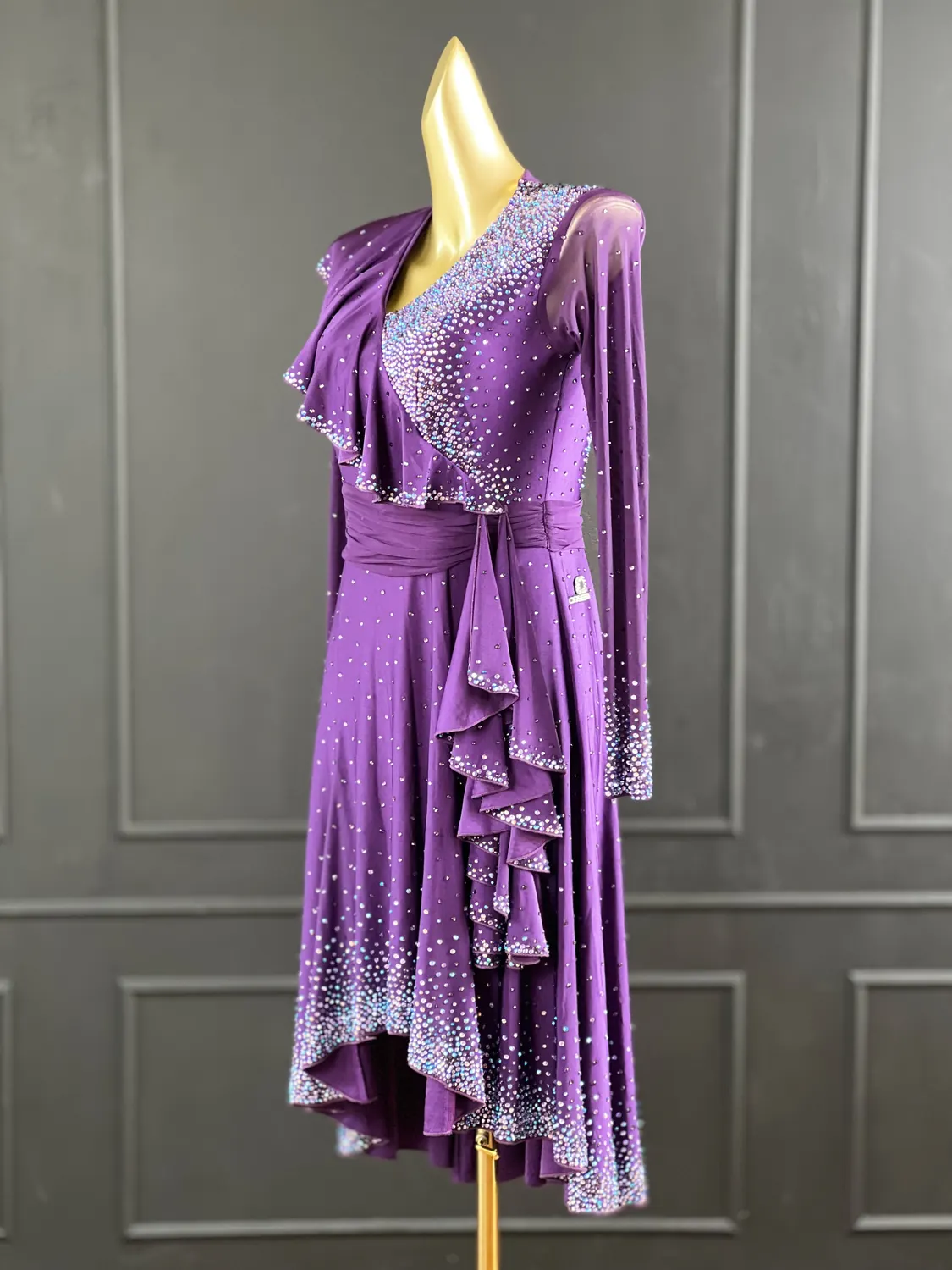 Latin competition dress in Deep Purple lycra and mesh with heavy stoning in Tanzanite, Tanzanite AB, Light Violet and Light Violet AB, stoned neckpiece and feature stoned earrings.