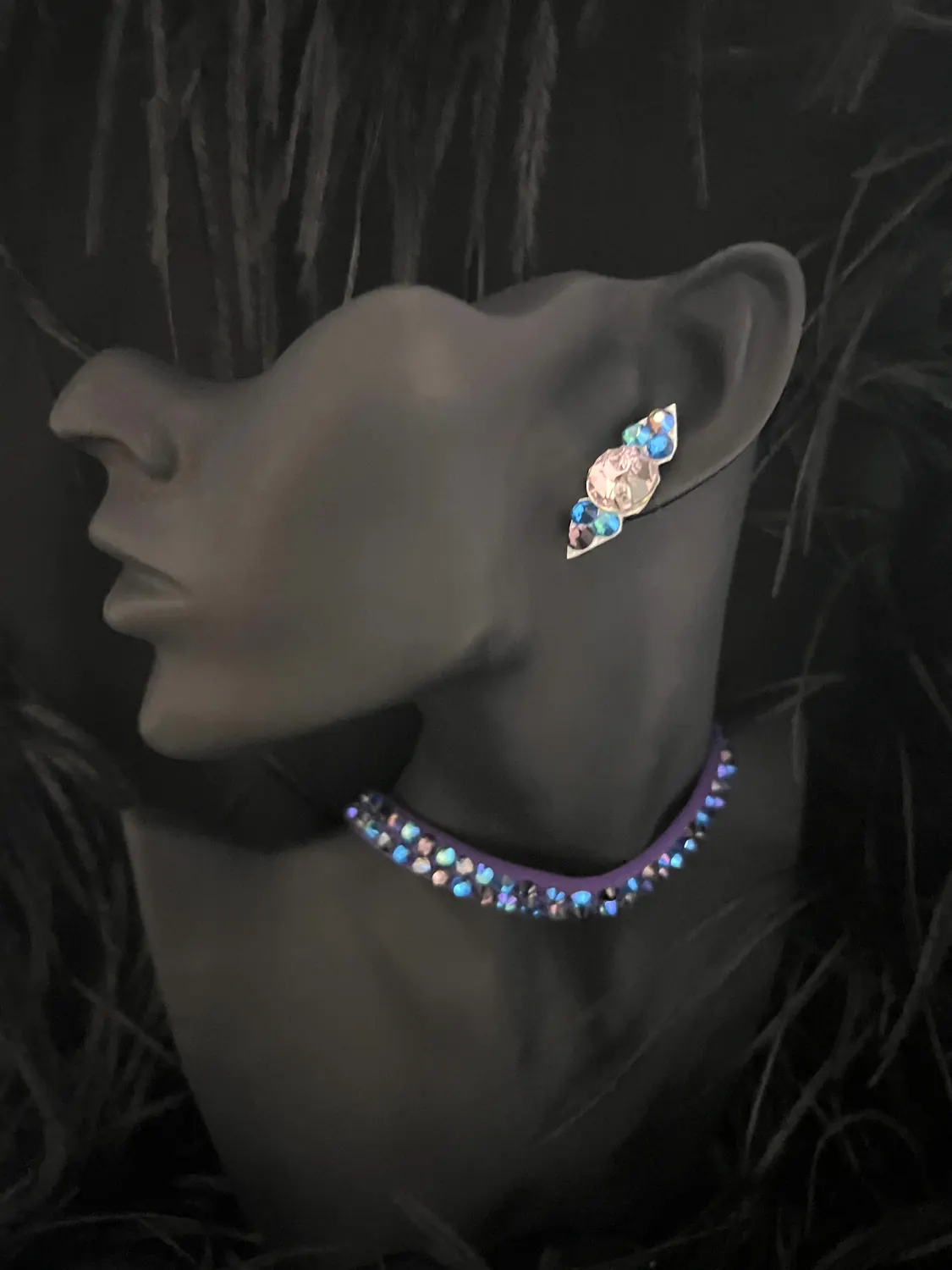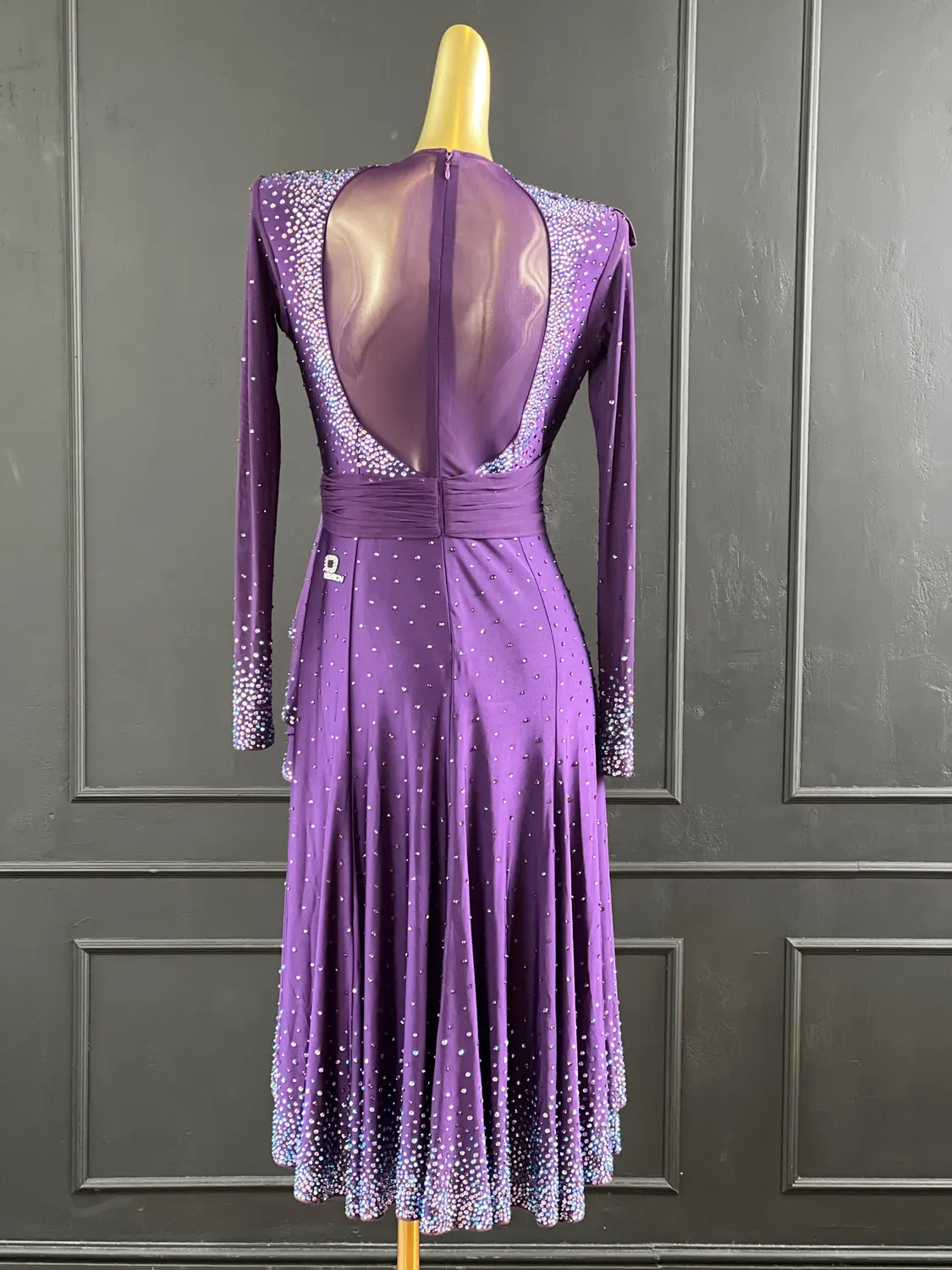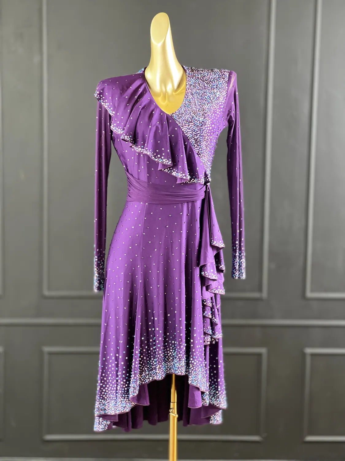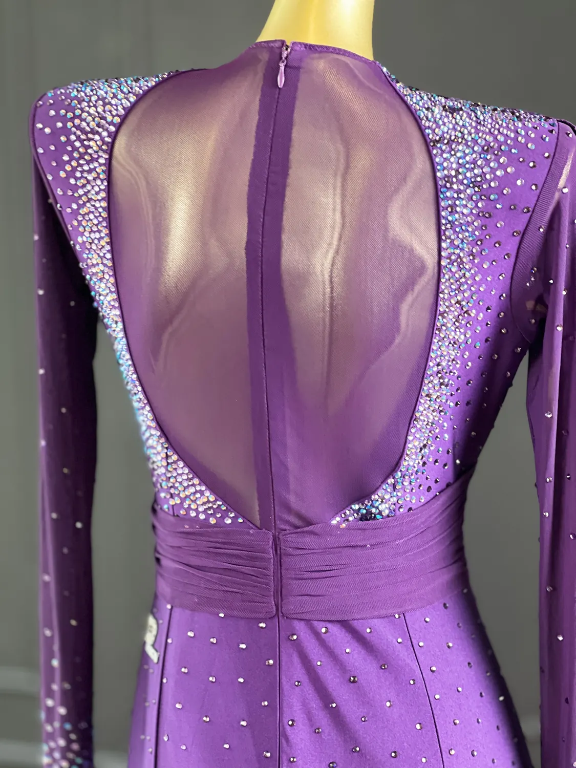 Latin competition dress in Deep Purple lycra and mesh with heavy stoning in Tanzanite, Tanzanite AB, Light Violet and Light Violet AB, stoned neckpiece and feature stoned earrings.