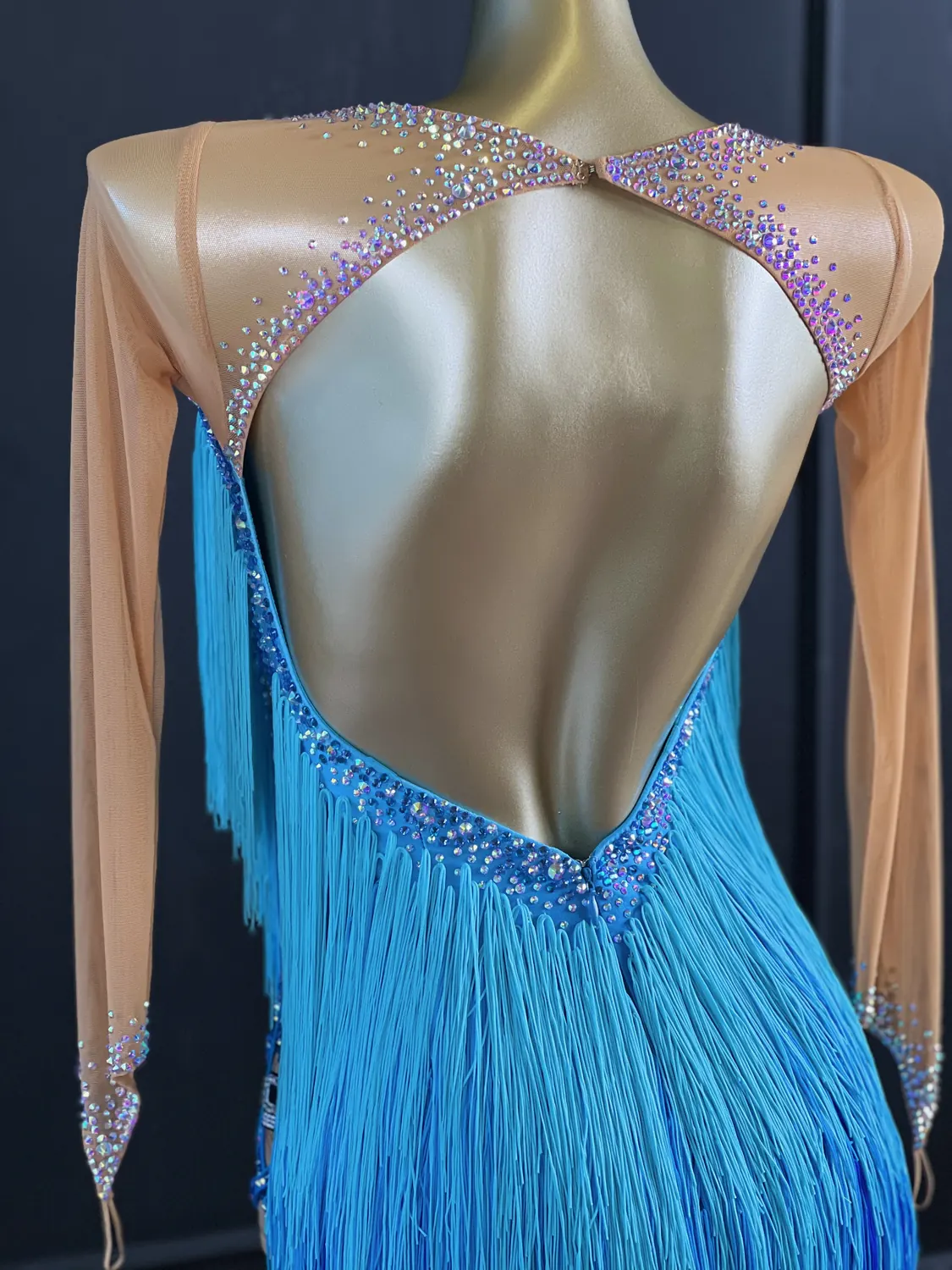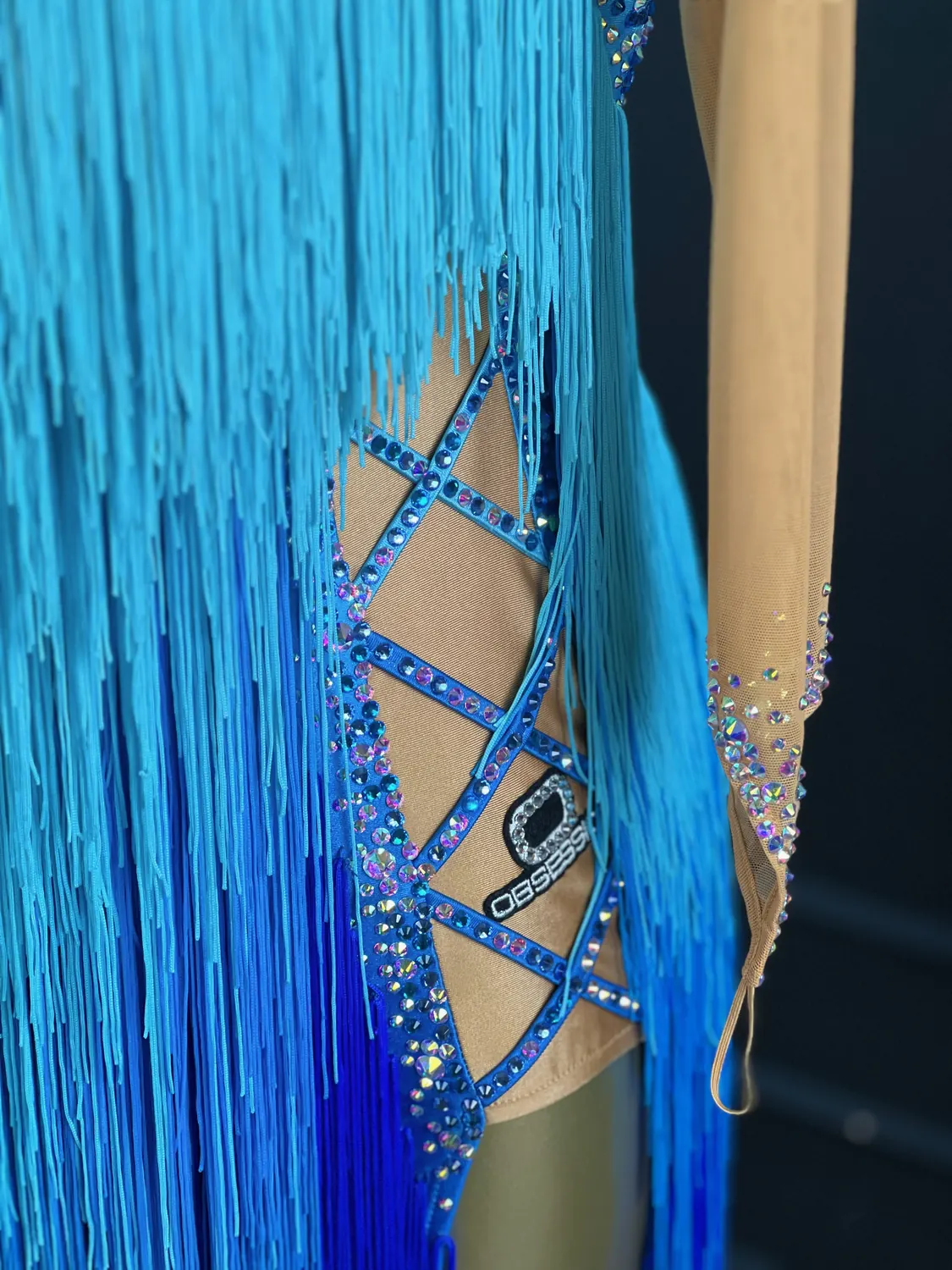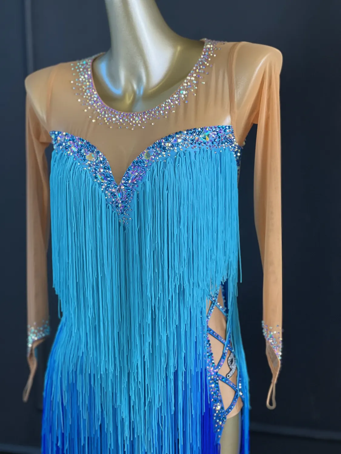Latin competition dress in Egyptian blue lycra with Nutmeg (tan) mesh, 3 shades of blue fringing in an ombré design, stoning in Crystal AB, Light Sapphire and Capri Blue, wide stoned choker and stoned hoop earrings.