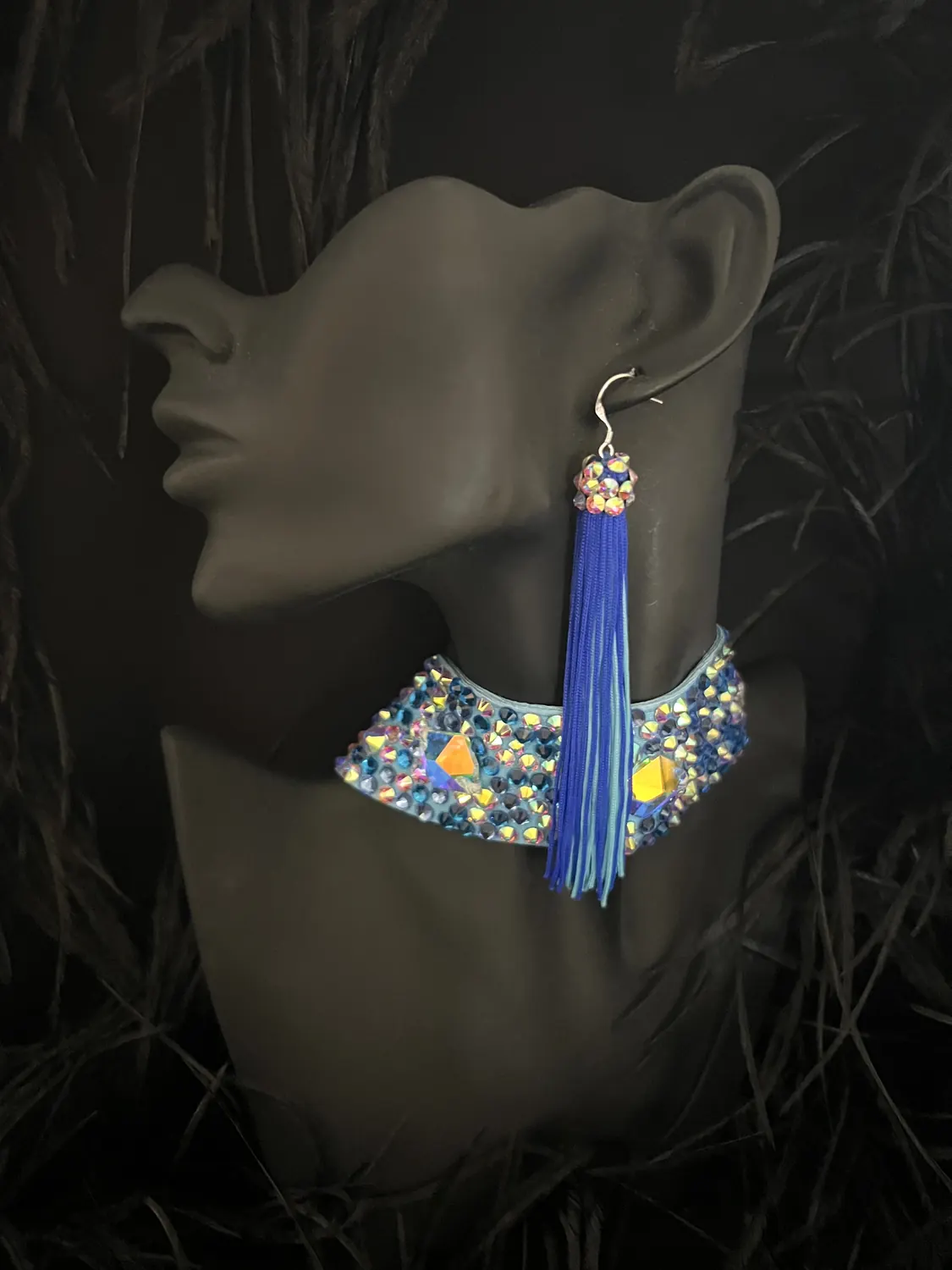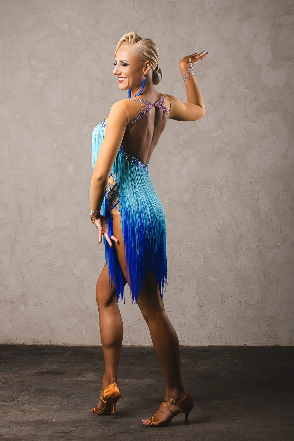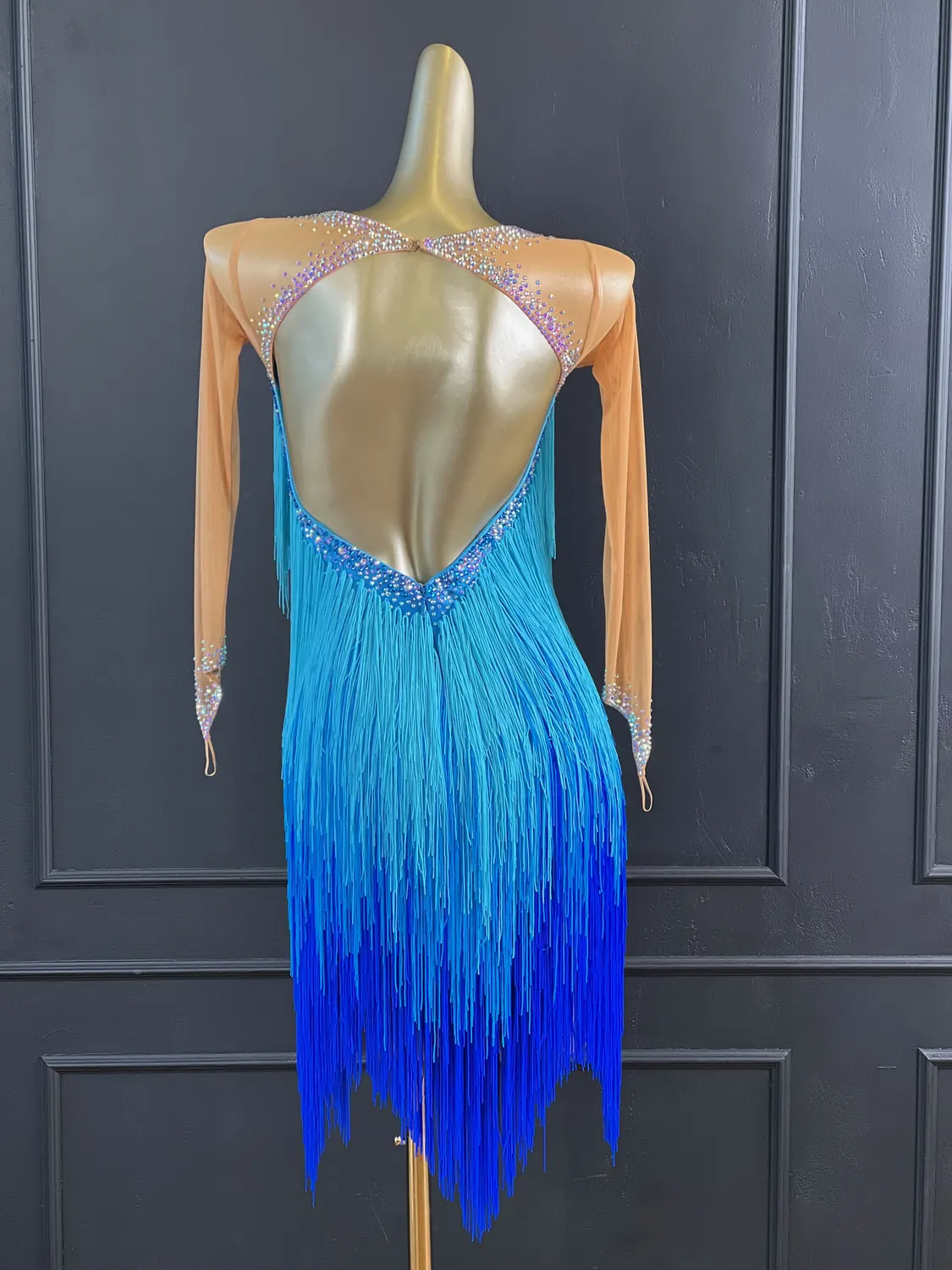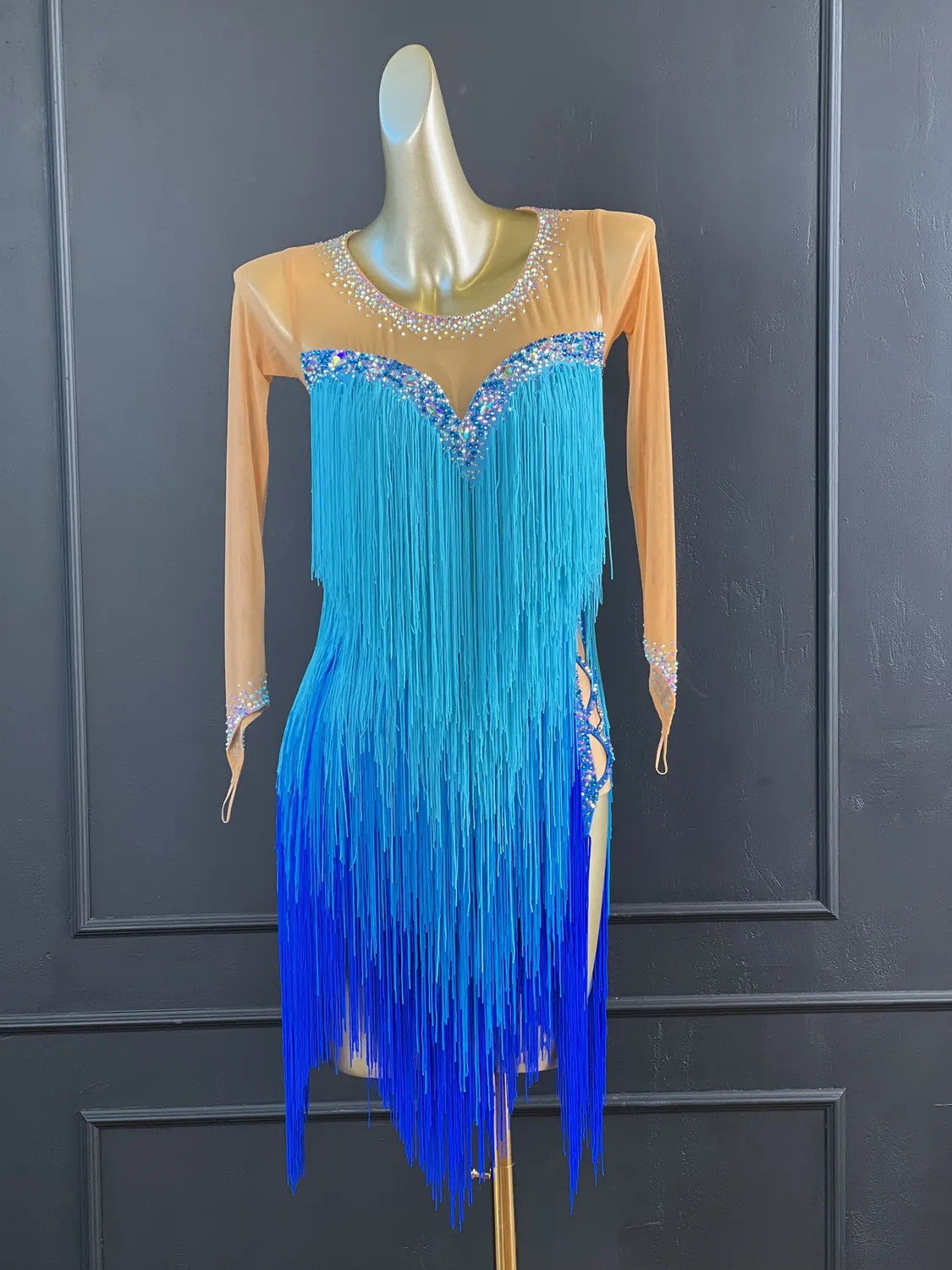 Latin competition dress in Egyptian blue lycra with Nutmeg (tan) mesh, 3 shades of blue fringing in an ombré design, stoning in Crystal AB, Light Sapphire and Capri Blue, wide stoned choker and stoned hoop earrings.