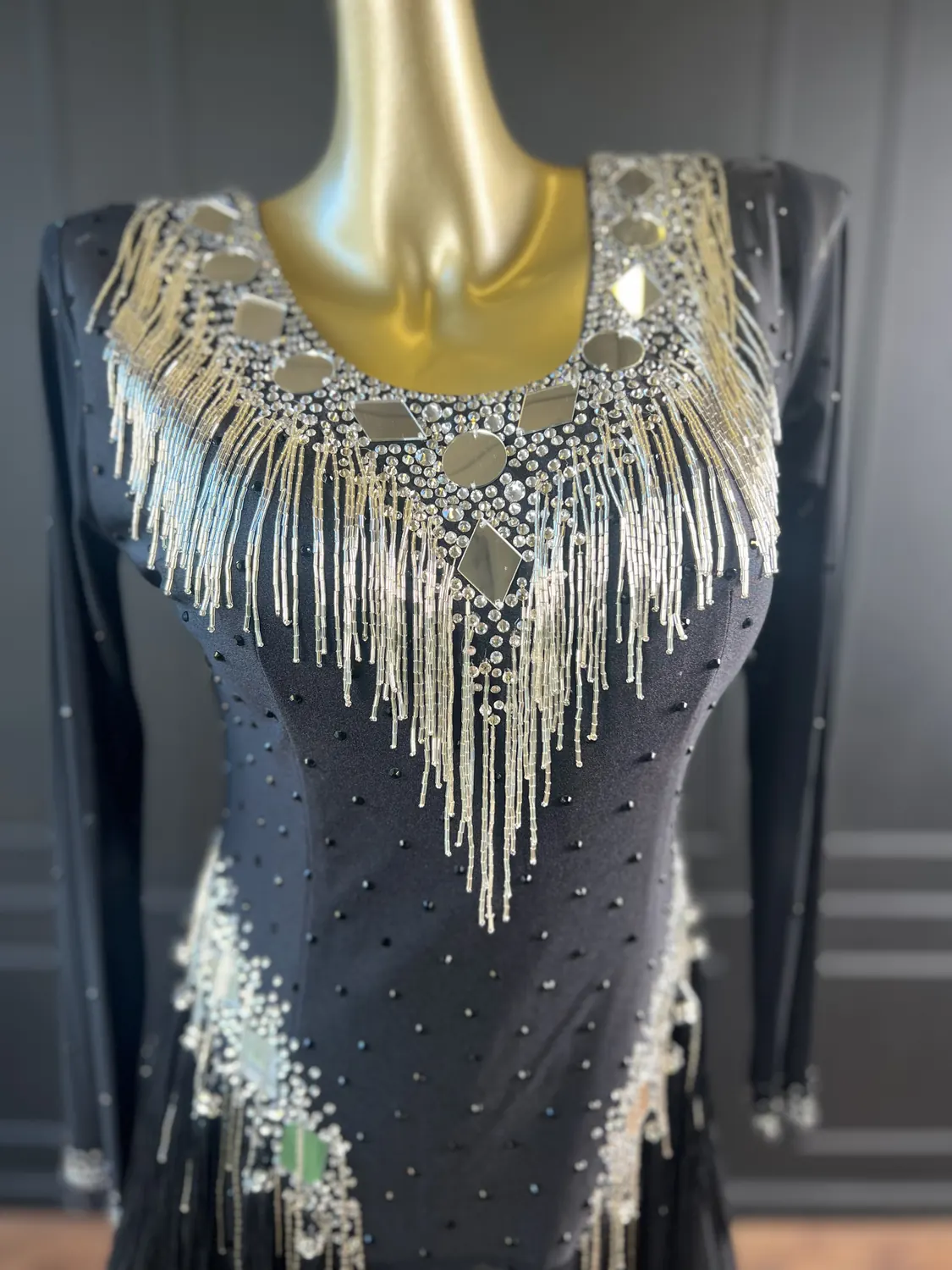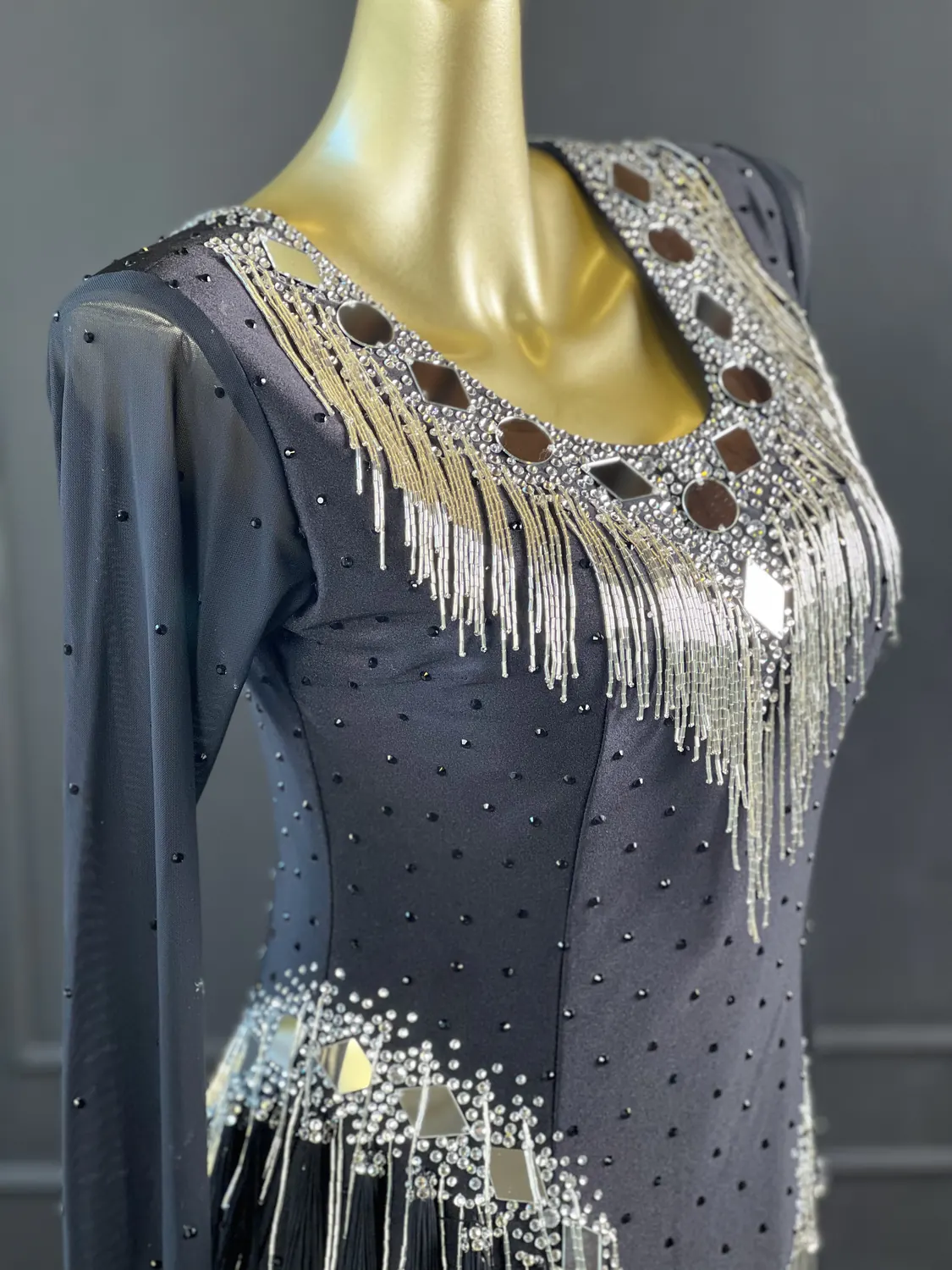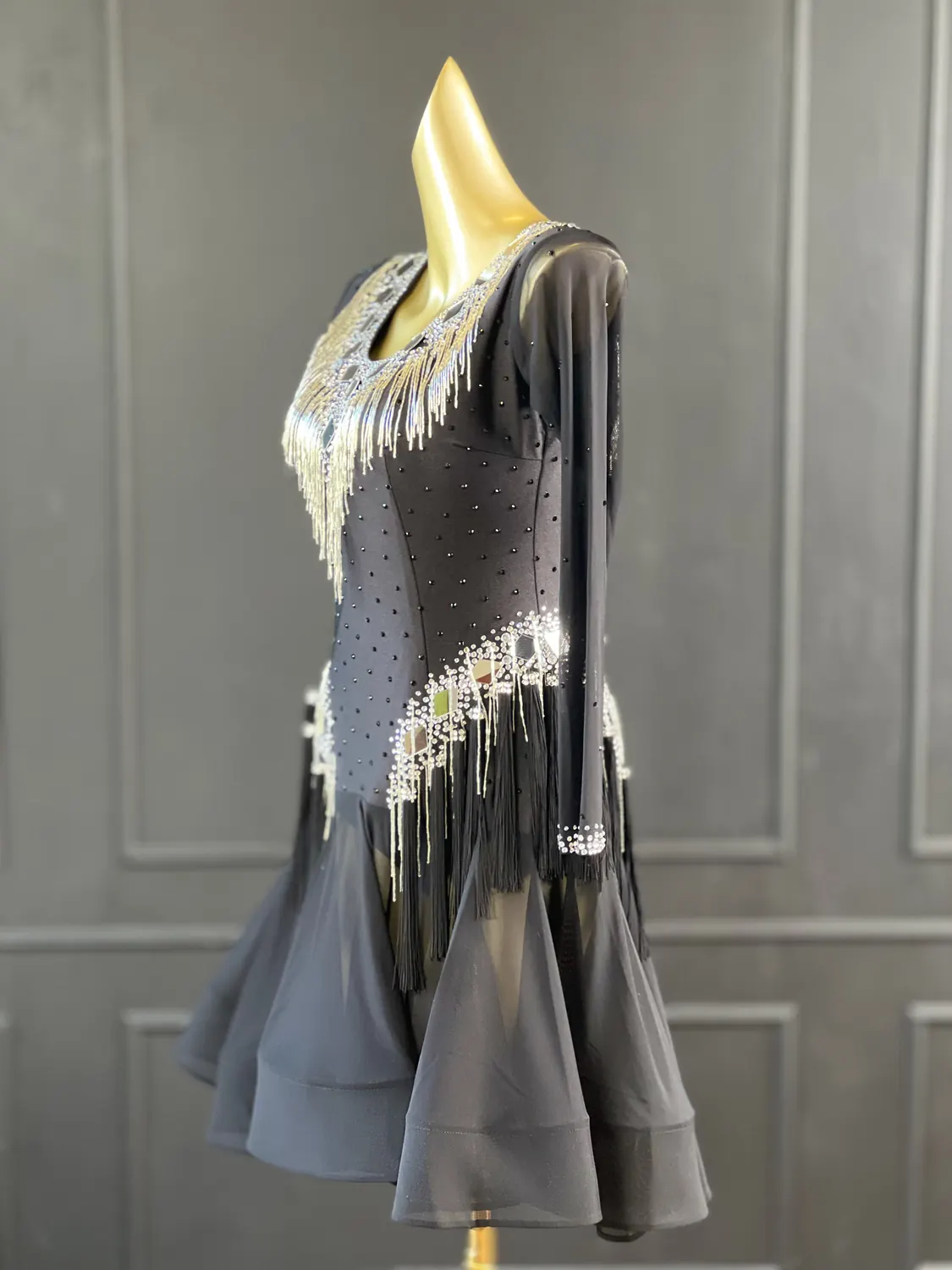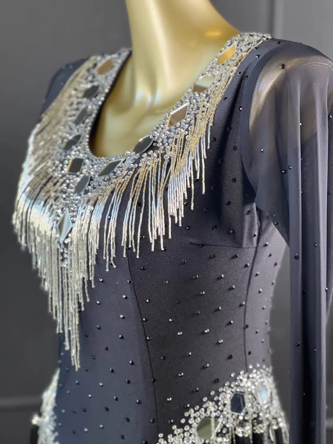 Latin competition dress in Jet Black lycra and mesh, heavily stoned in Crystal with silver bugle bead tassels, silver mirrors and stoned fringing bunches at the hips, stoned neckpiece and feature stoned earrings.