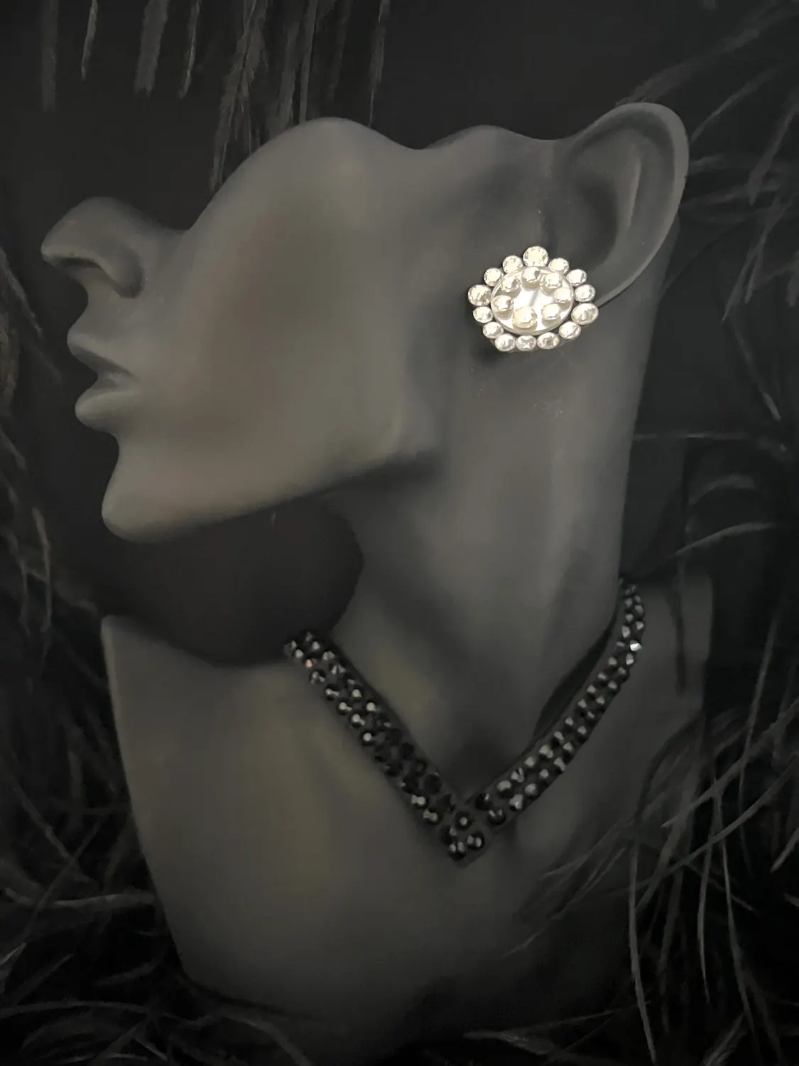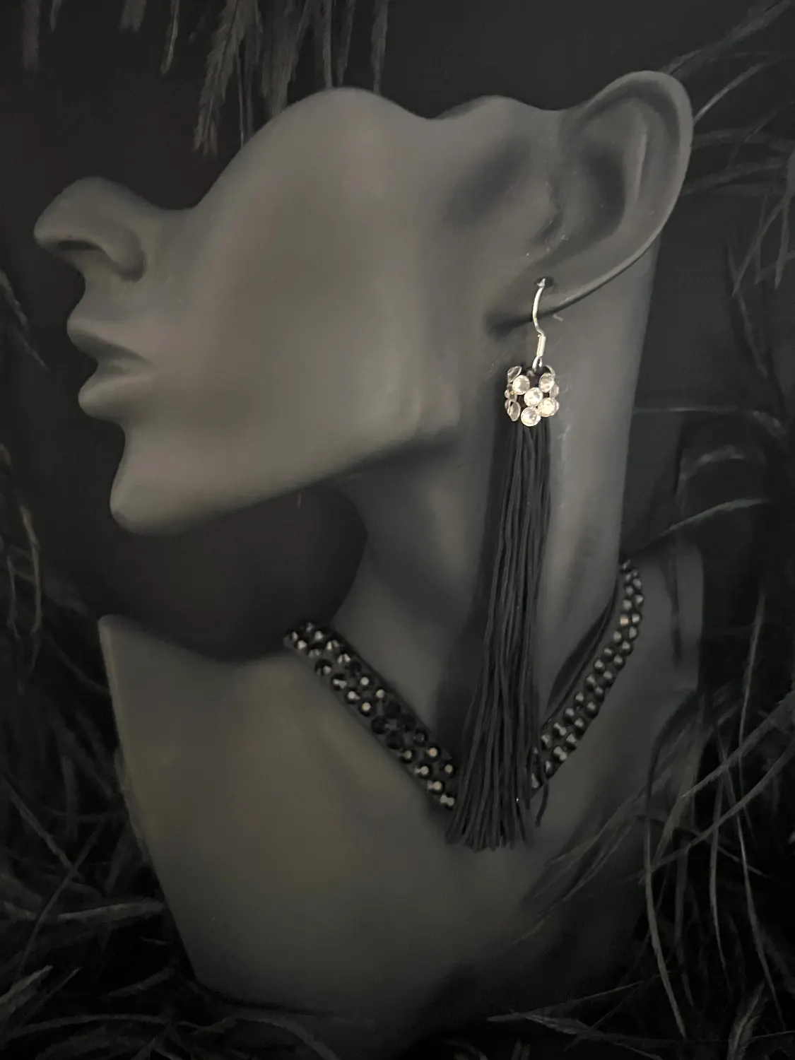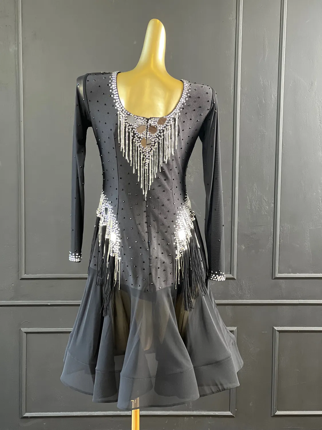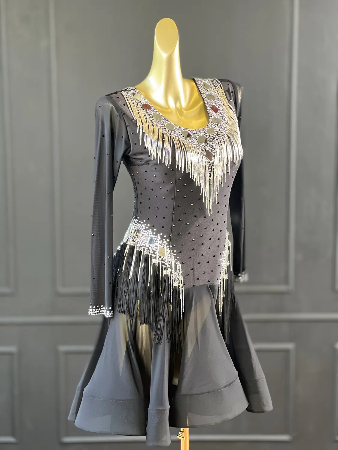 Latin competition dress in Jet Black lycra and mesh, heavily stoned in Crystal with silver bugle bead tassels, silver mirrors and stoned fringing bunches at the hips, stoned neckpiece and feature stoned earrings.