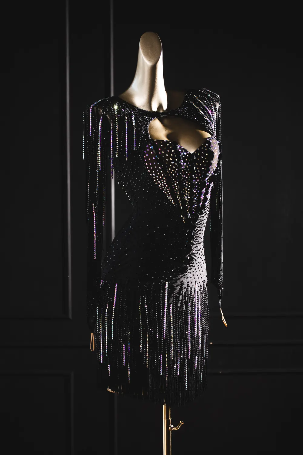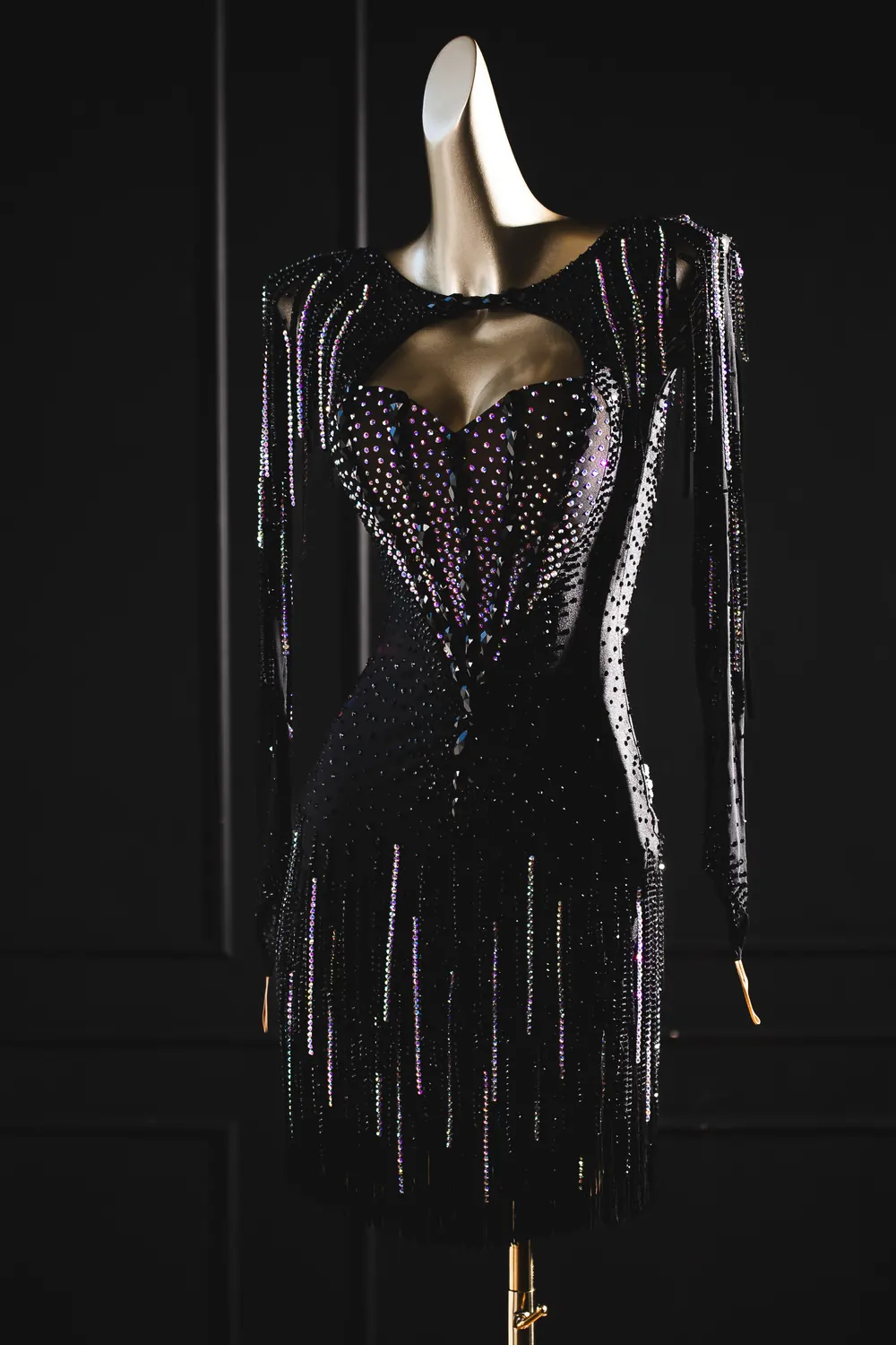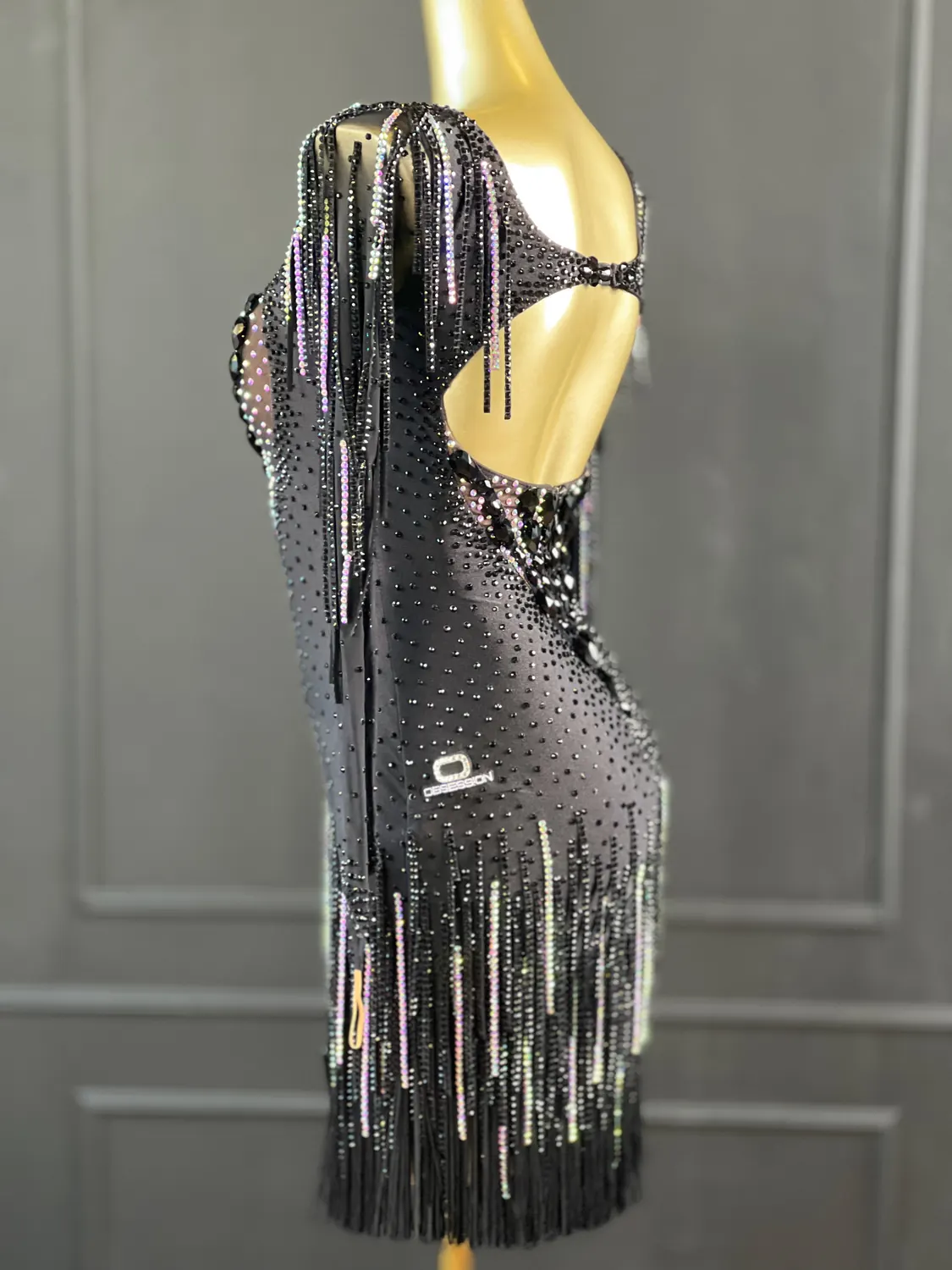 Latin competition dress in Jet Black lycra with a tan lycra panel covered in black mesh at the bust, heavy stoning in Jet and Crystal AB, stoned lycra strips and stoned hoop or fringing earrings.