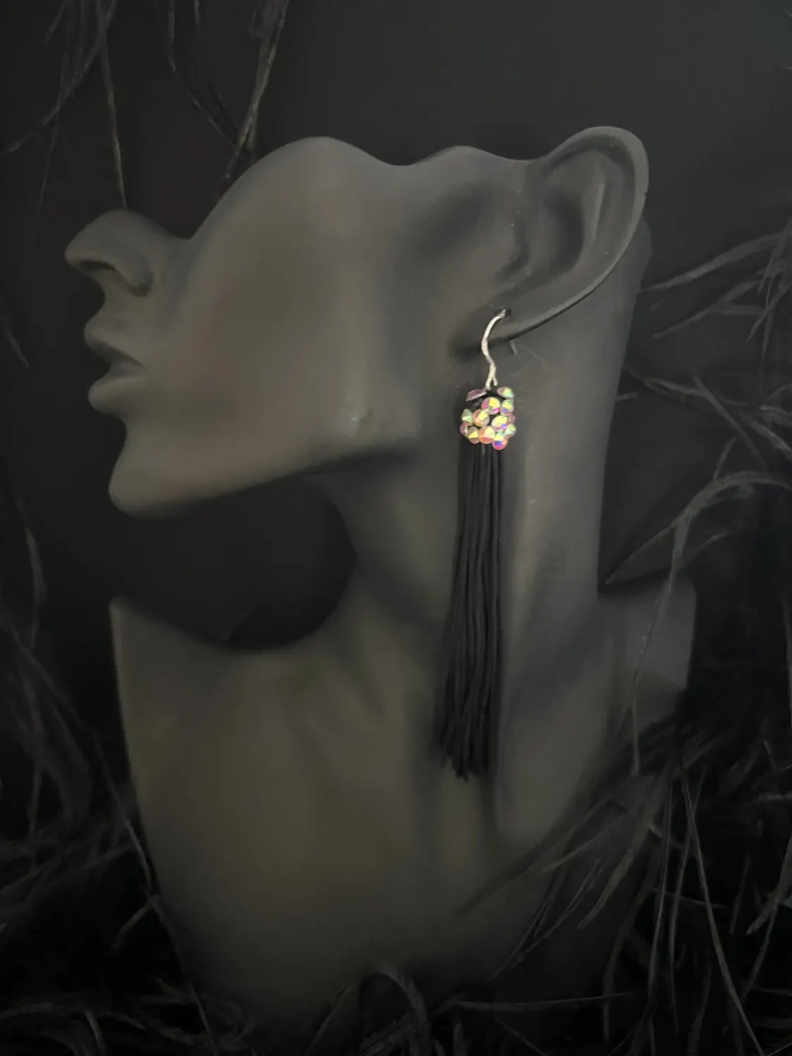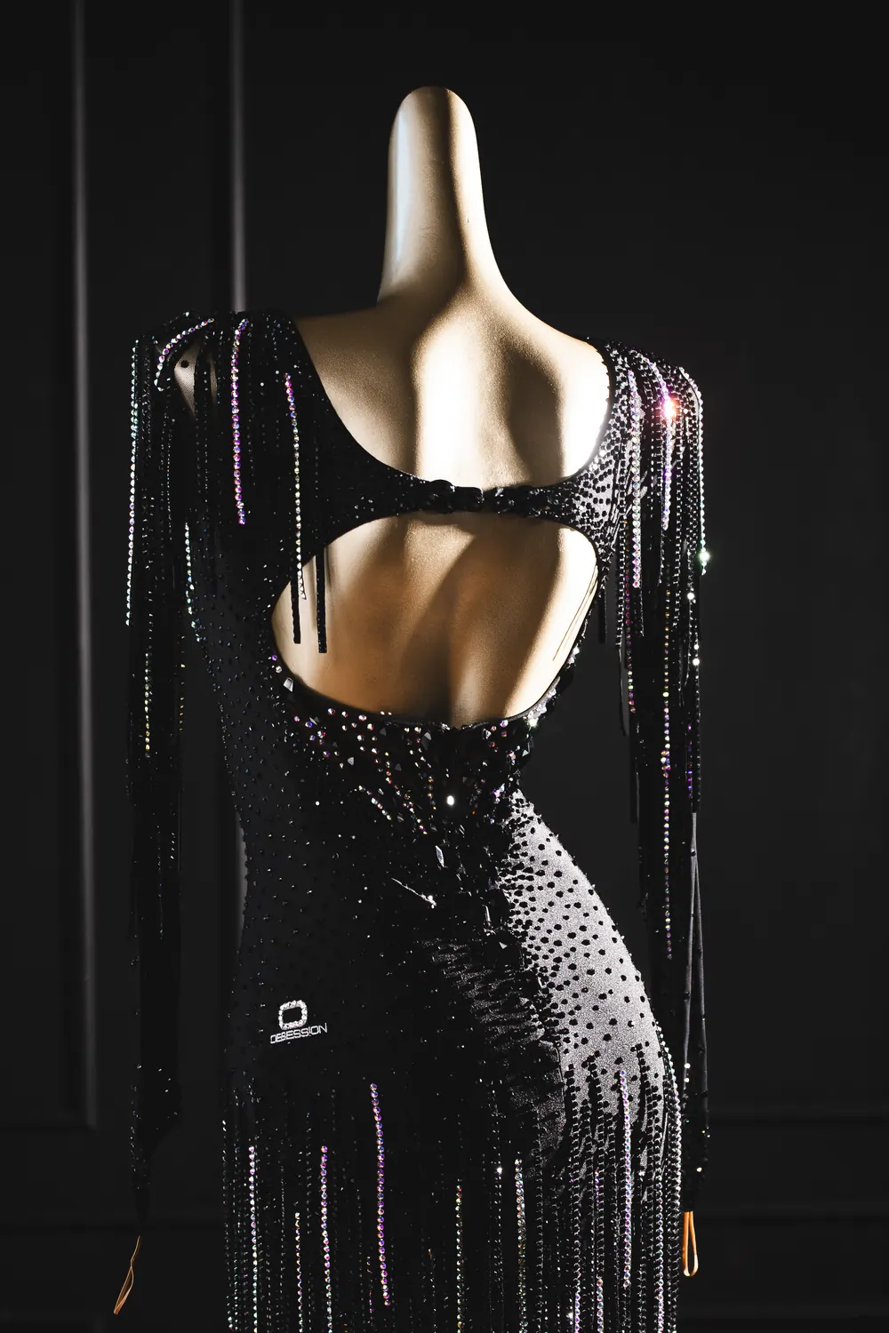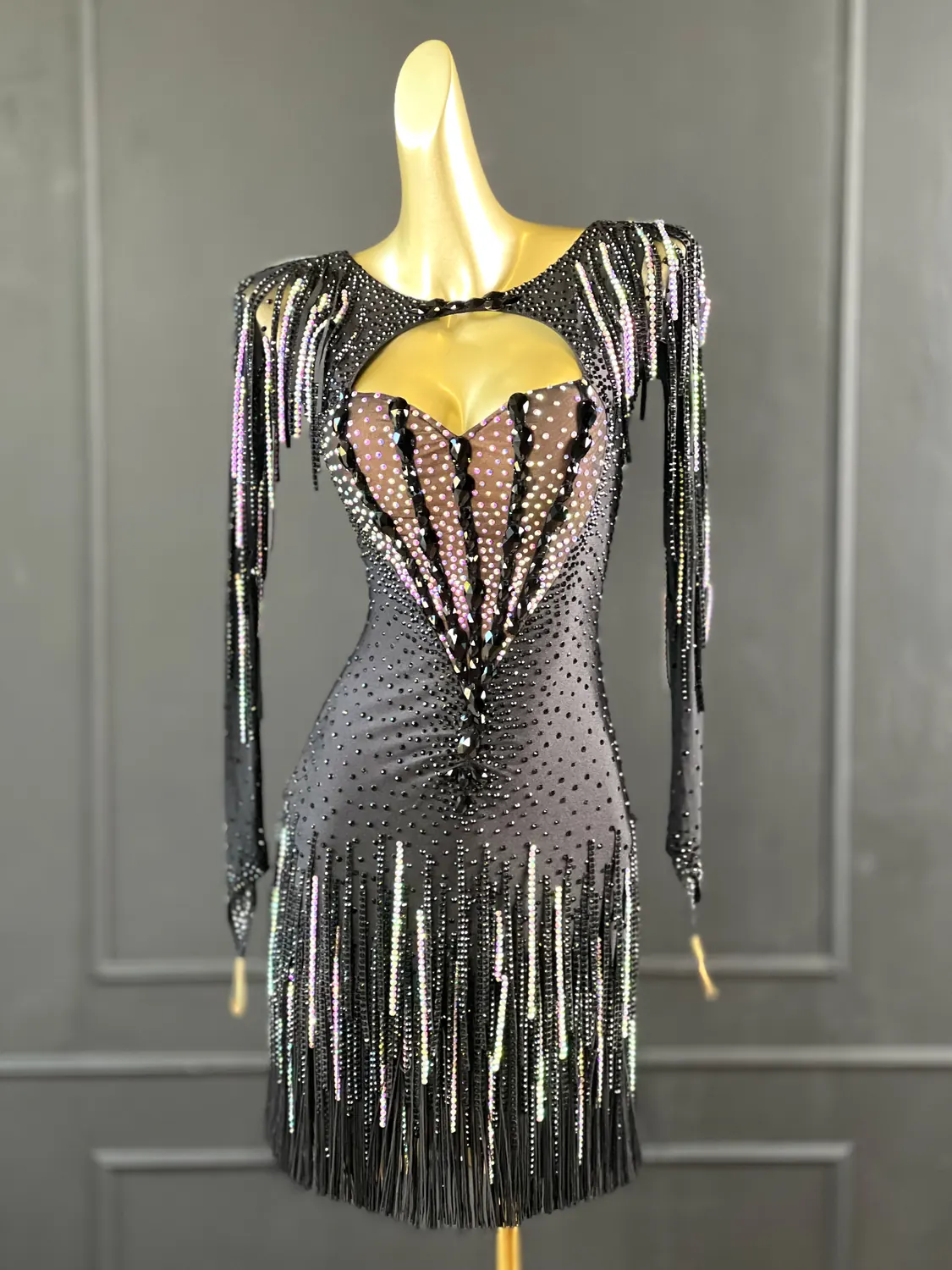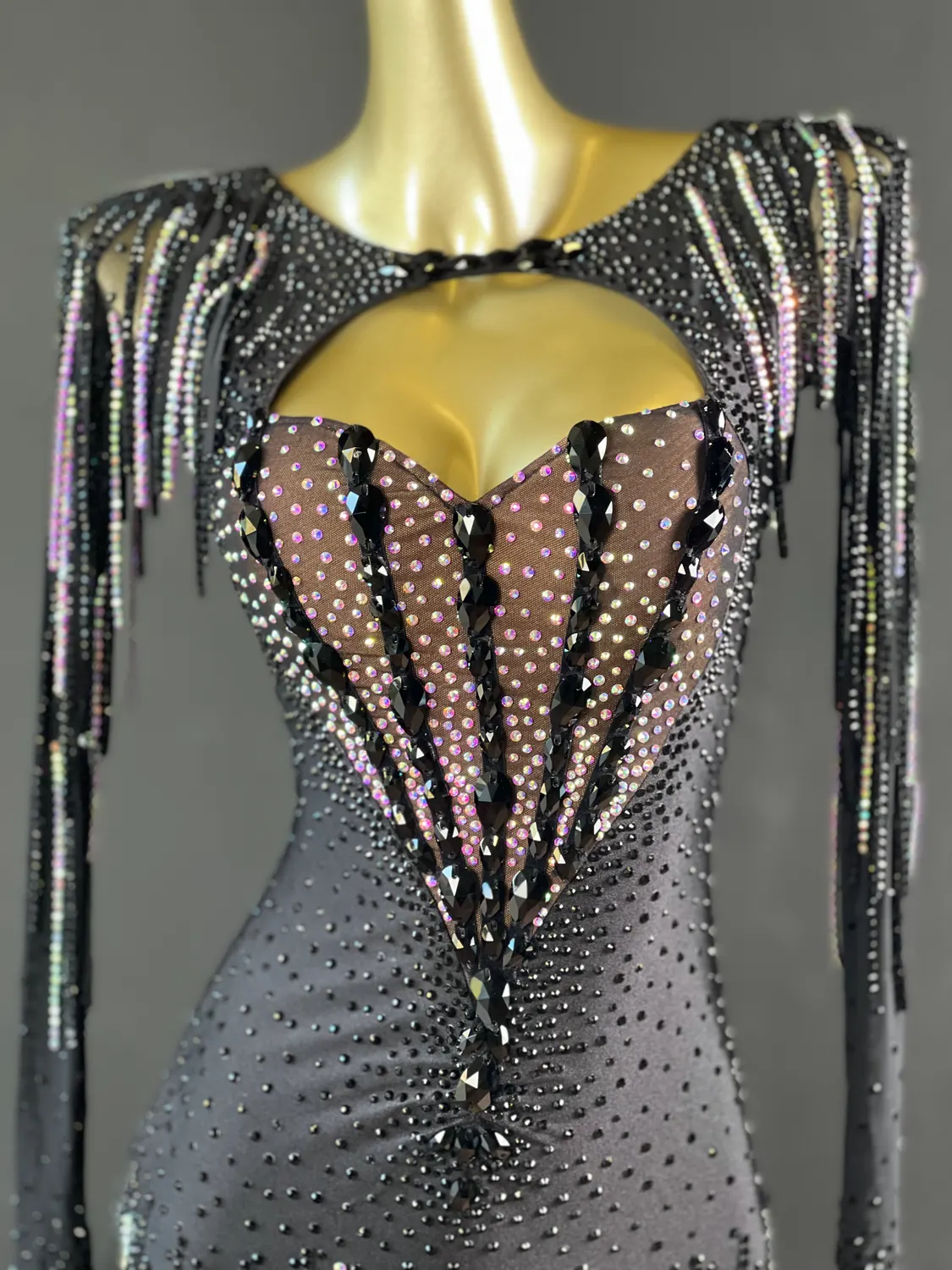 Latin competition dress in Jet Black lycra with a tan lycra panel covered in black mesh at the bust, heavy stoning in Jet and Crystal AB, stoned lycra strips and stoned hoop or fringing earrings.