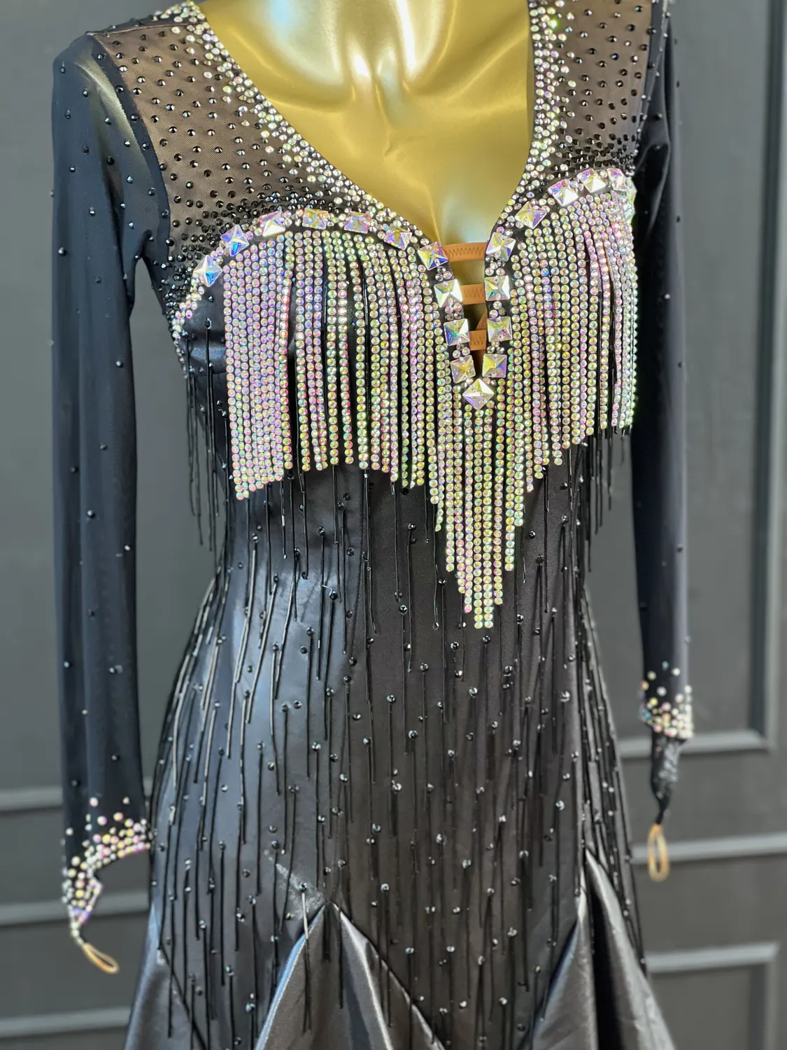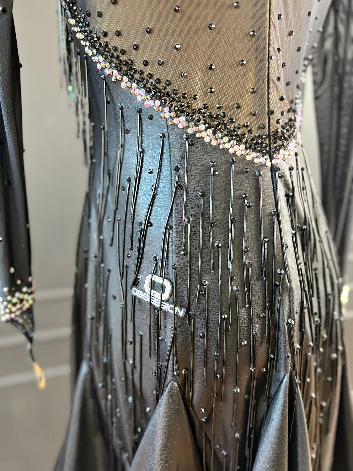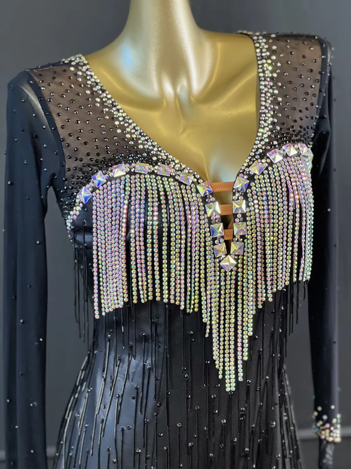 Latin competition dress in black metallic lycra and black mesh, tan lycra covered with black mesh, heavy stoning in Crystal AB and Jet with stoned lycra strips, bugle bead tassels, stoned neckpiece and stoned feature earrings.