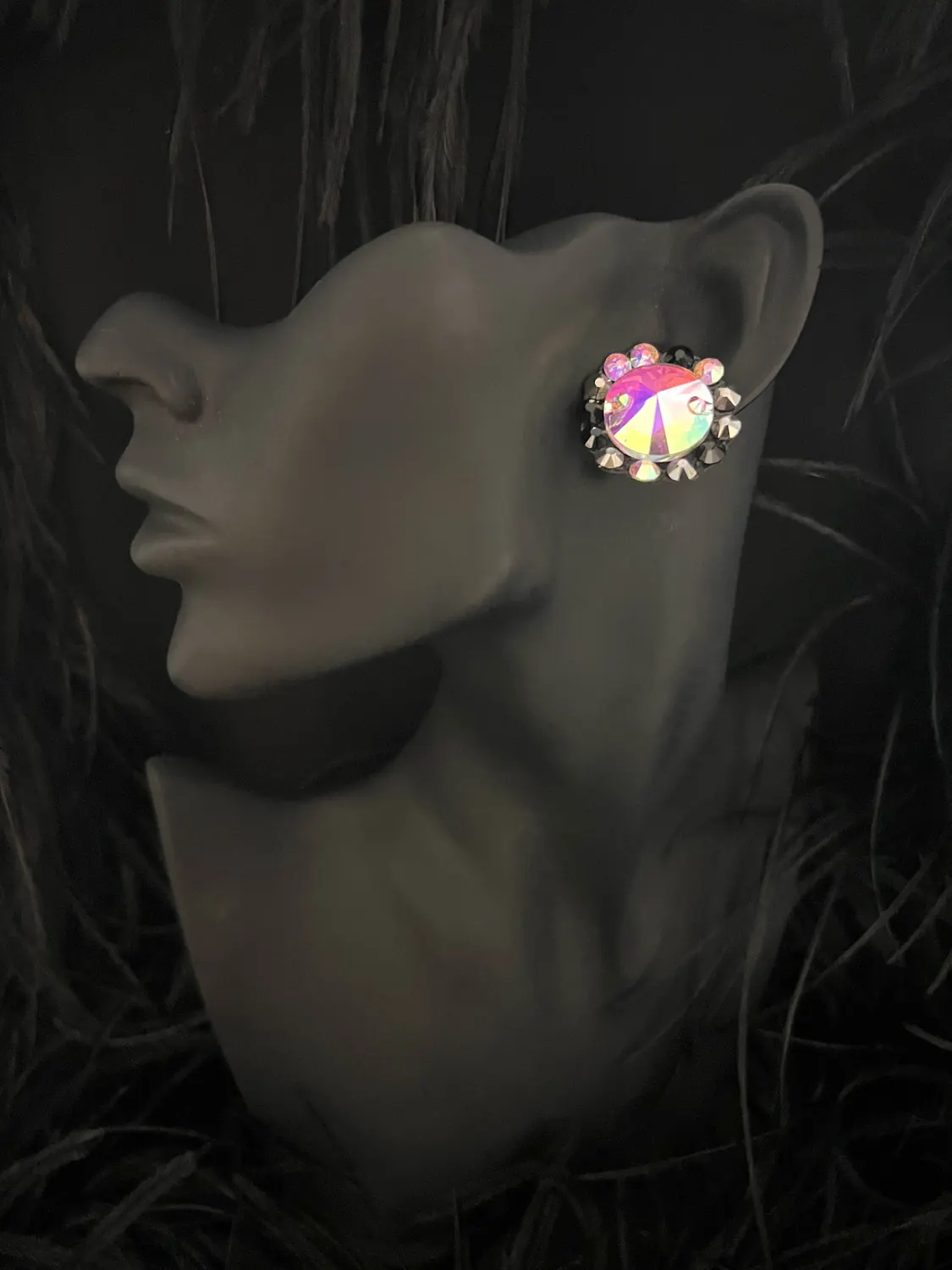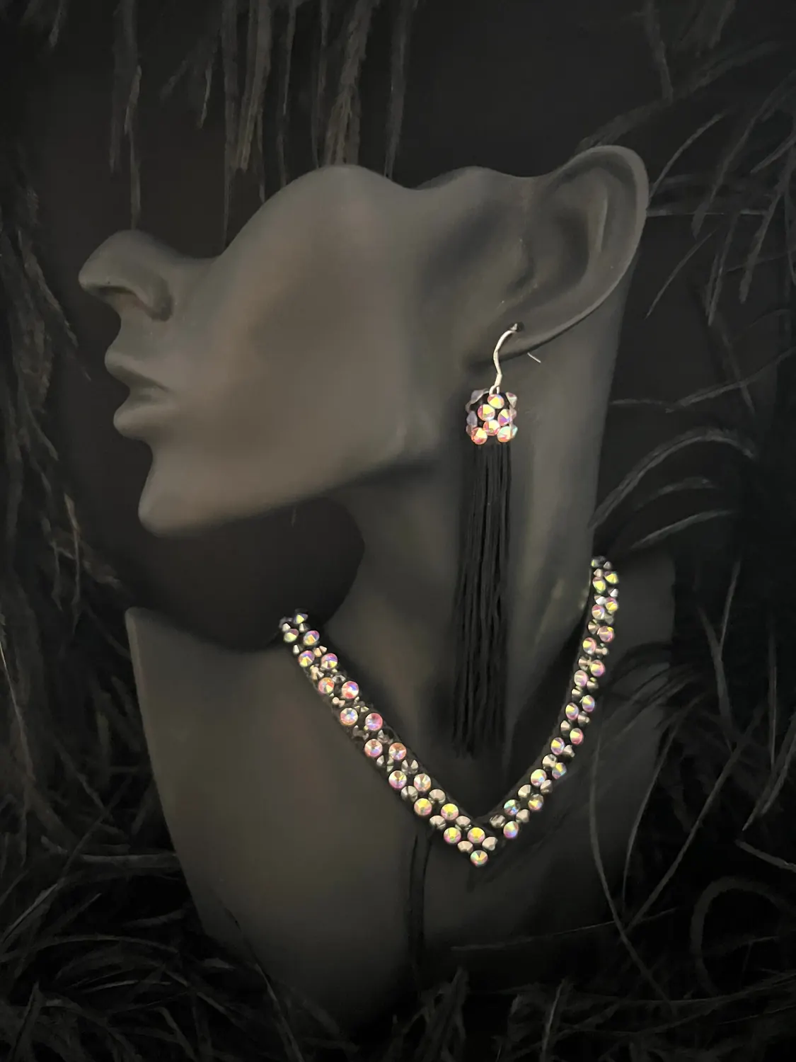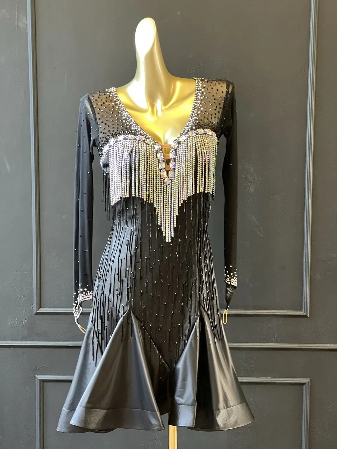 Latin competition dress in black metallic lycra and black mesh, tan lycra covered with black mesh, heavy stoning in Crystal AB and Jet with stoned lycra strips, bugle bead tassels, stoned neckpiece and stoned feature earrings.