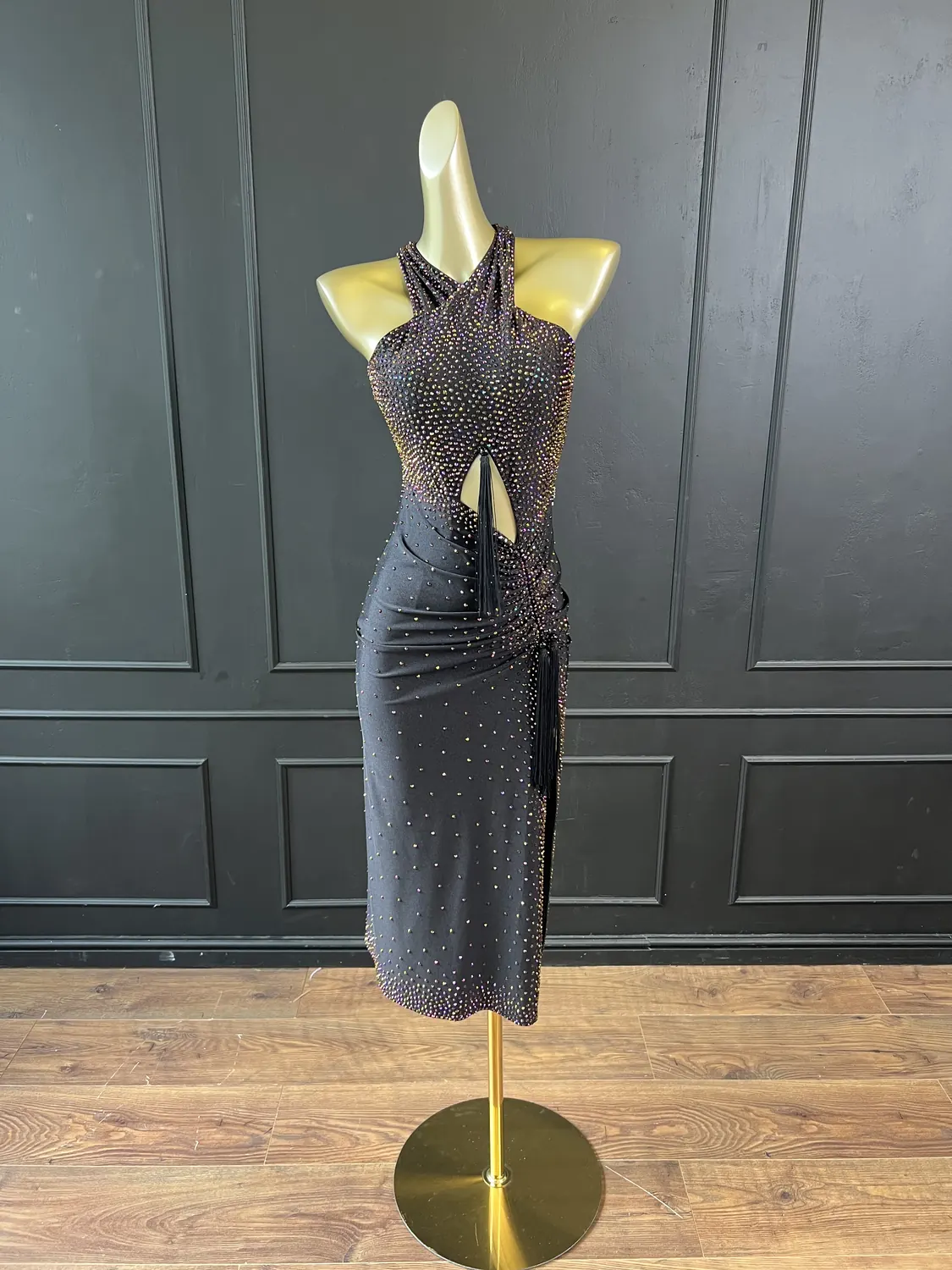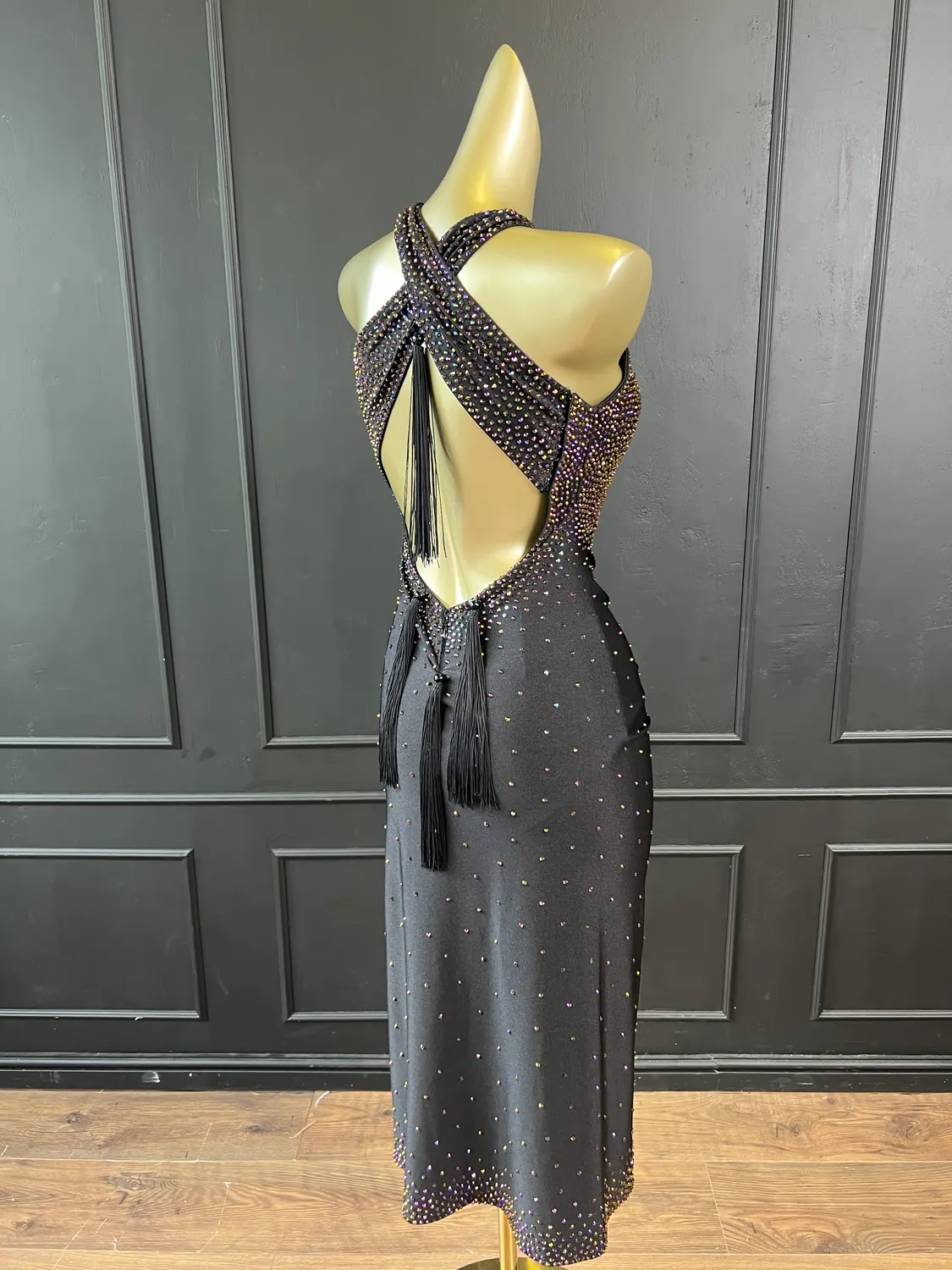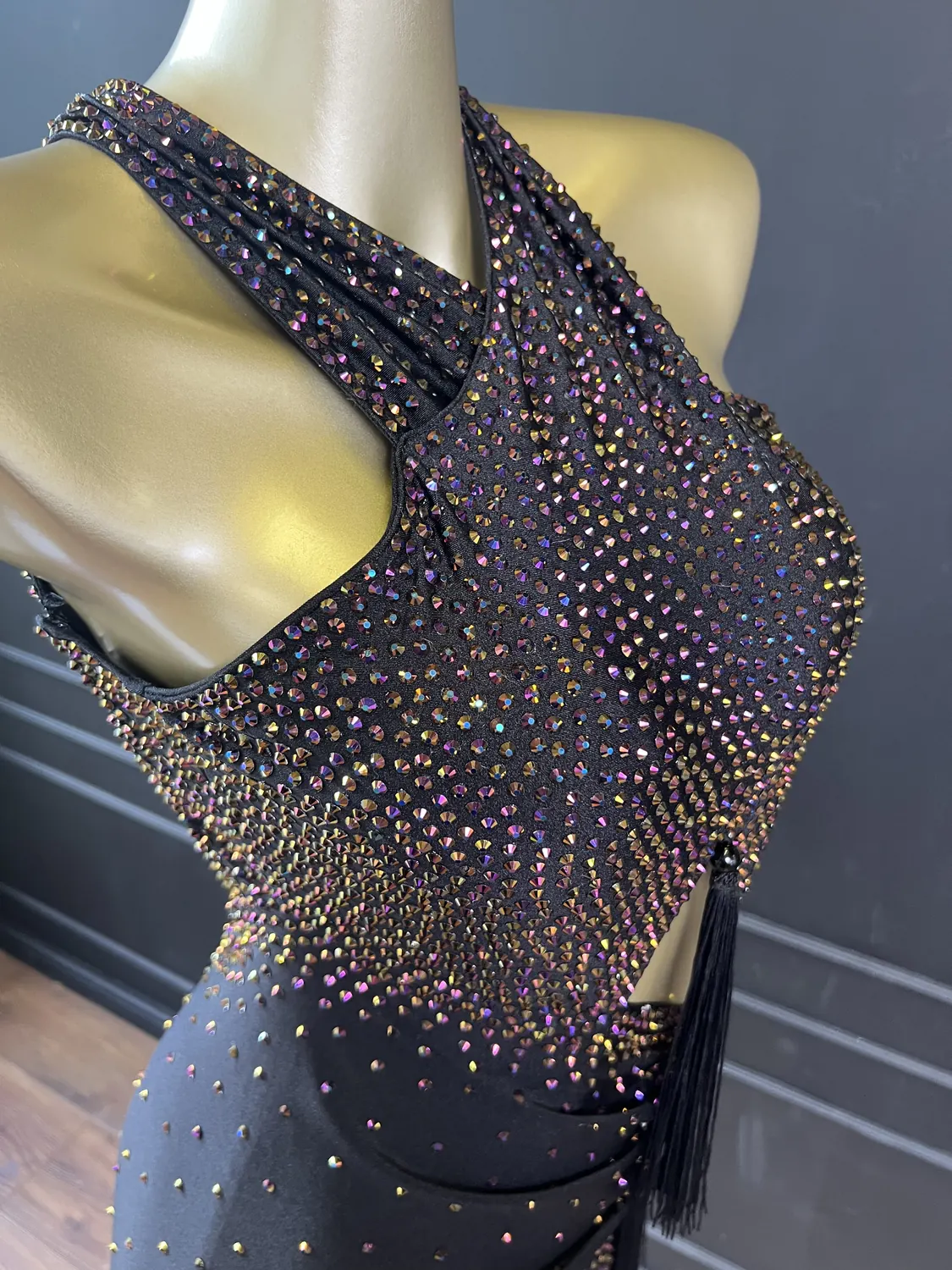 Latin competition dress in Jet black lycra with heavy stoning in Iridescent Purple, a high split, black fringe tassels and stoned fringe earrings.
