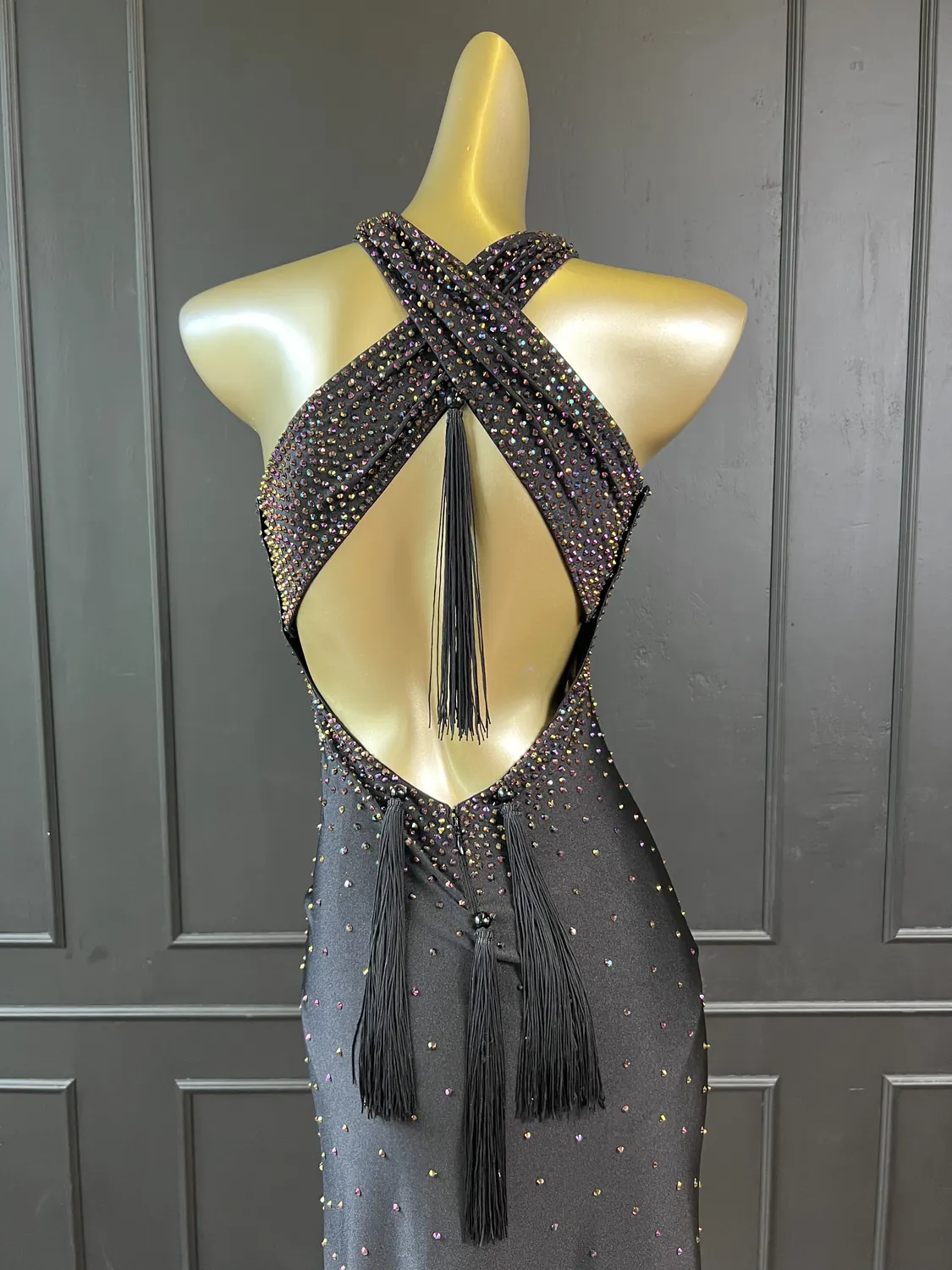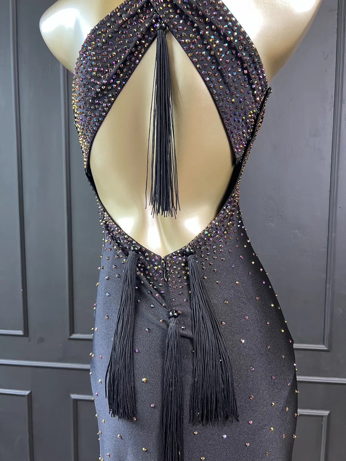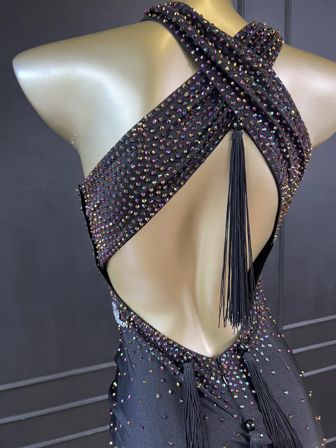 Latin competition dress in Jet black lycra with heavy stoning in Iridescent Purple, a high split, black fringe tassels and stoned fringe earrings.