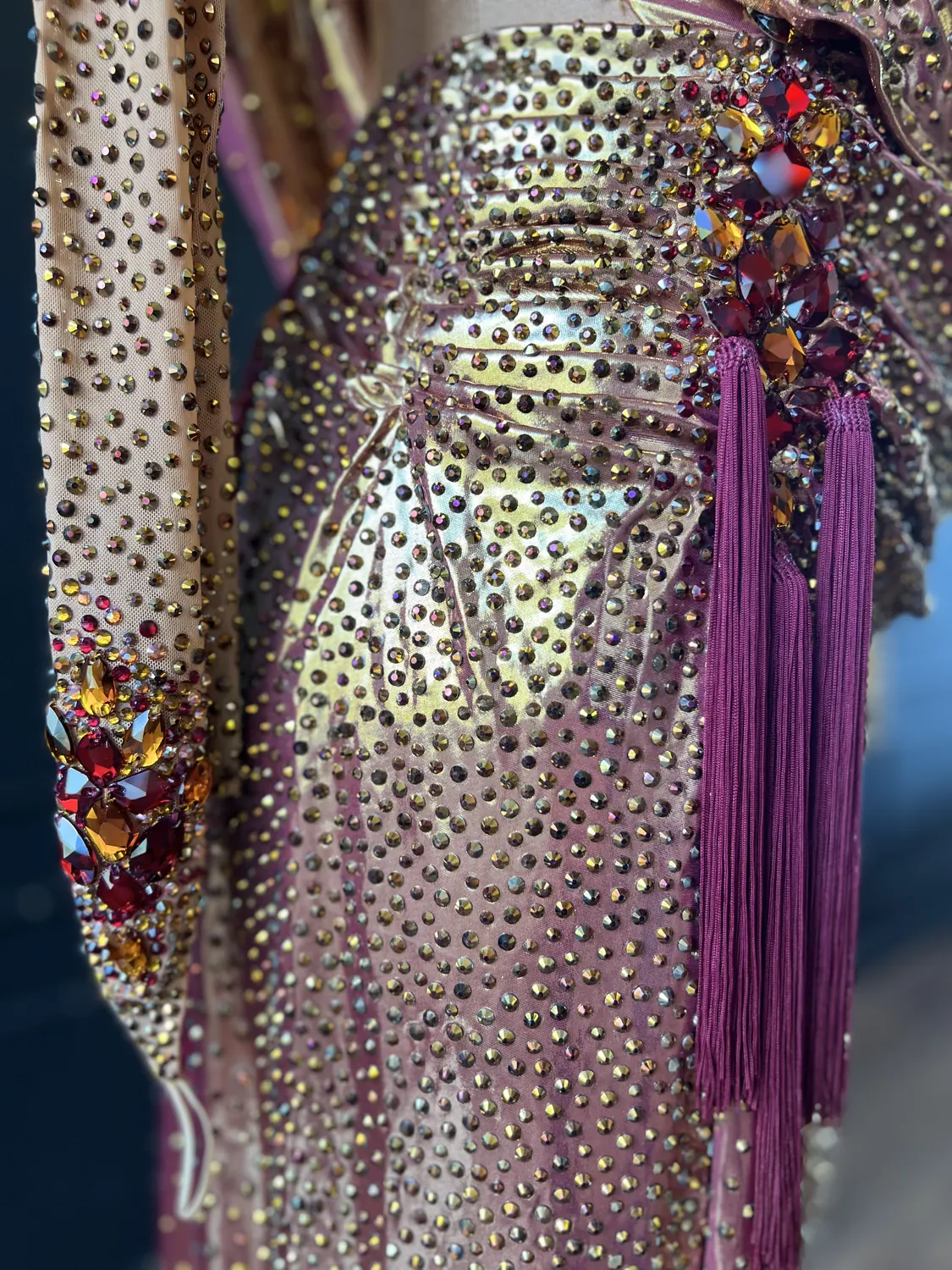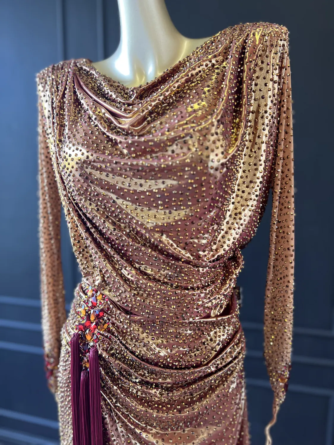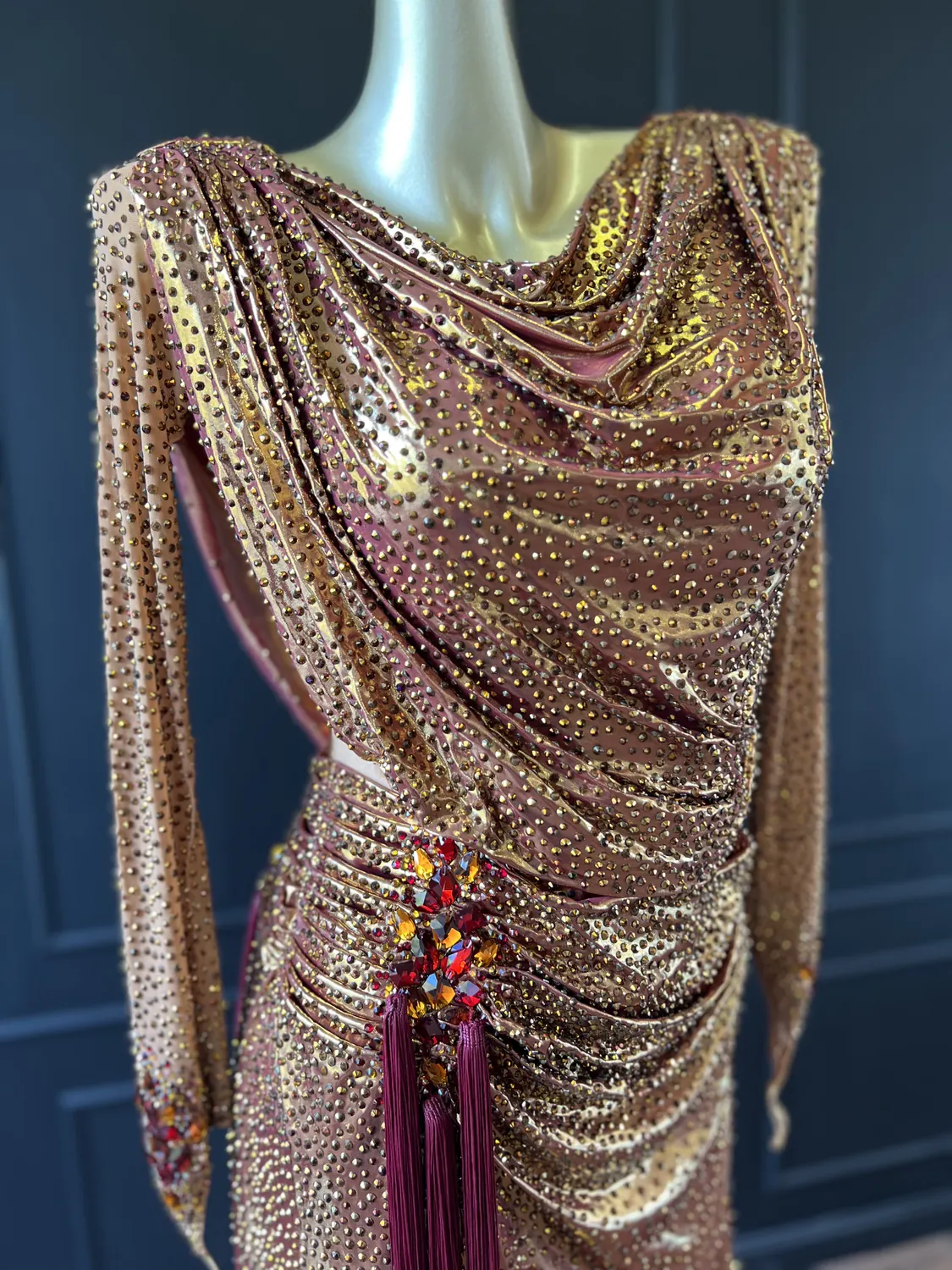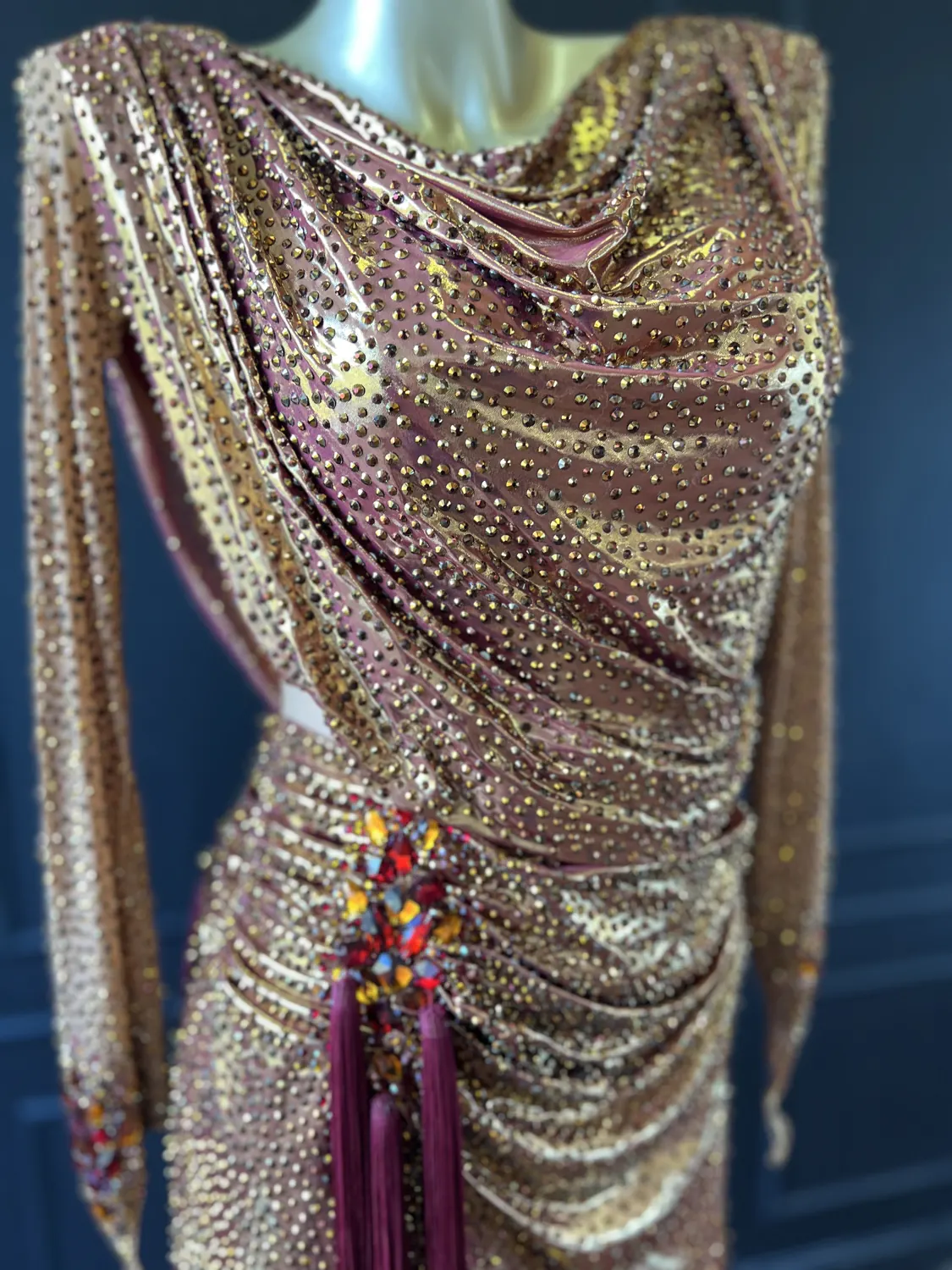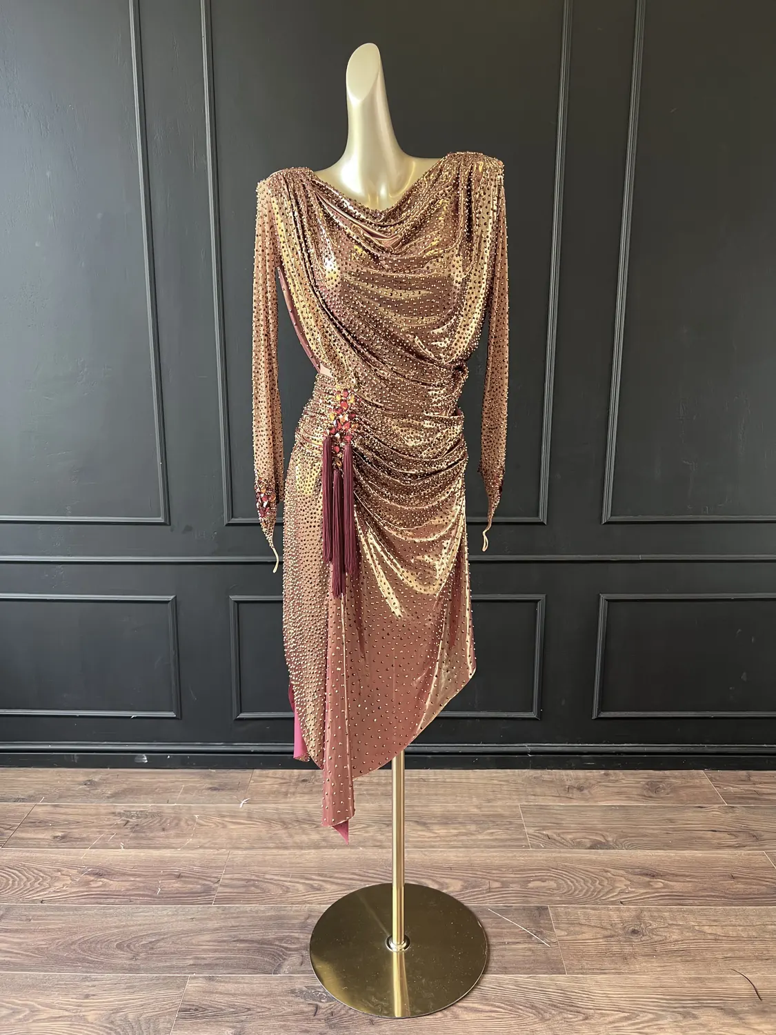 There is limited stretch in metallic lycra, therefore this dress may be best suited to a size UK 12 dancer.