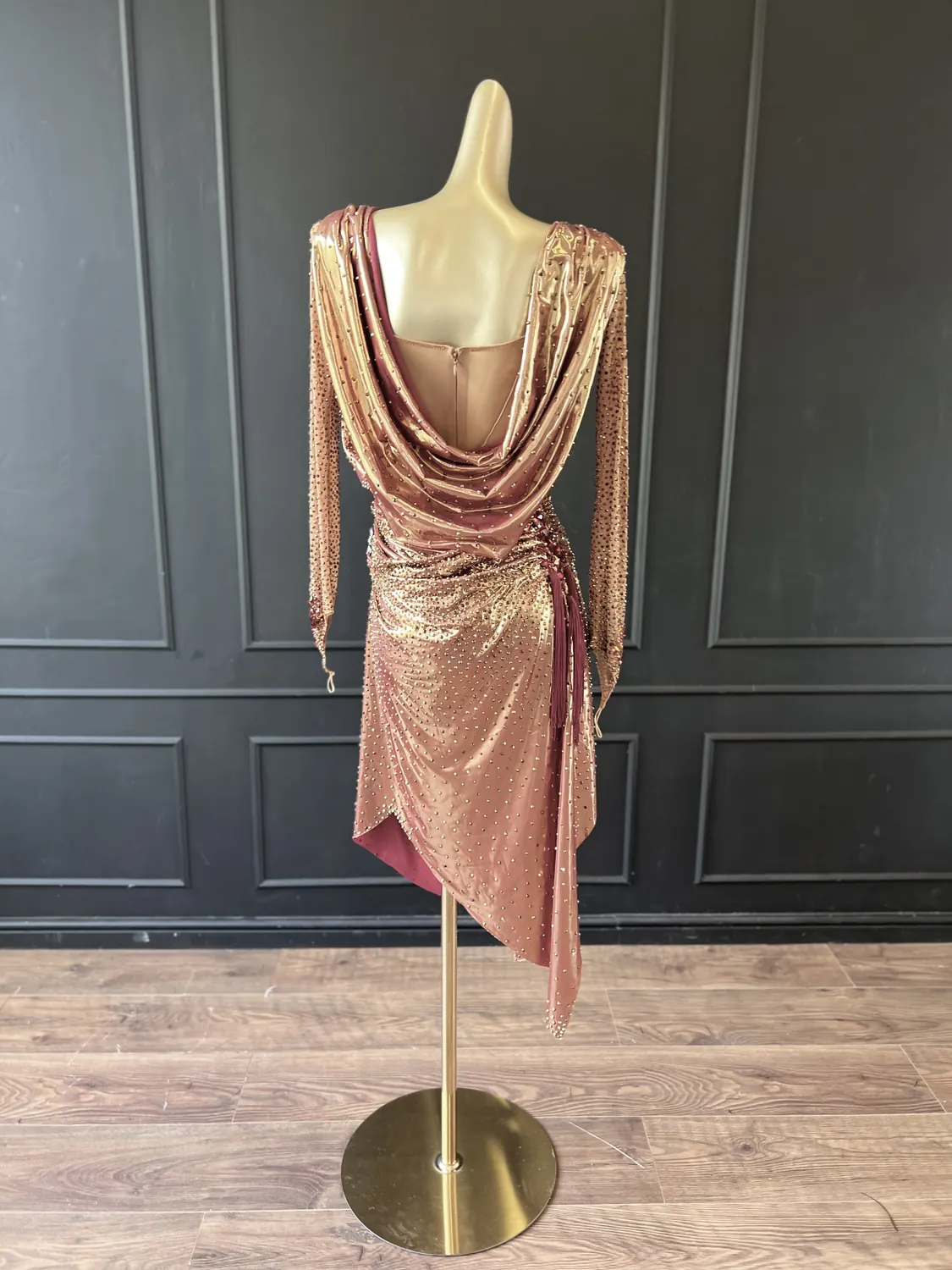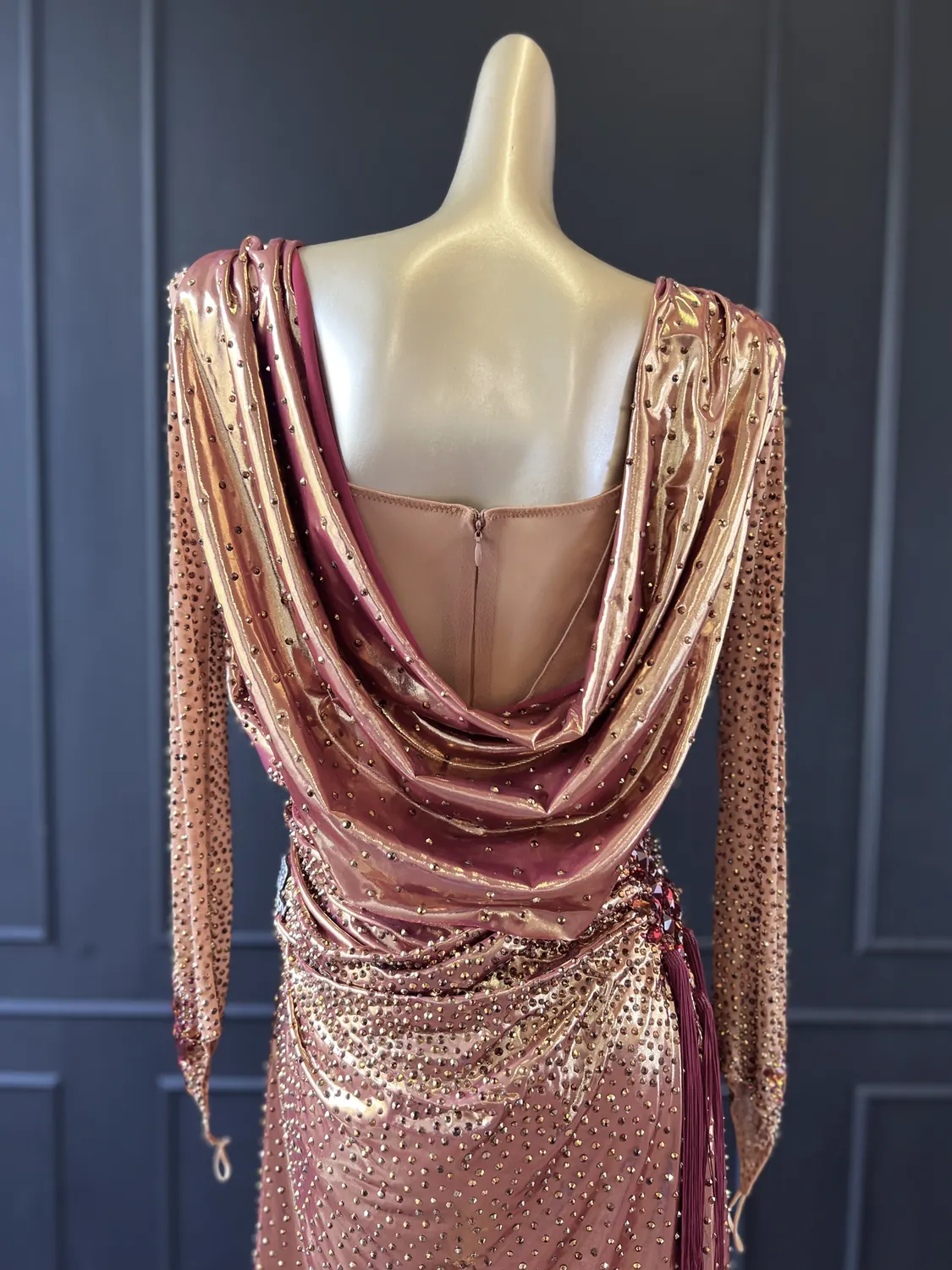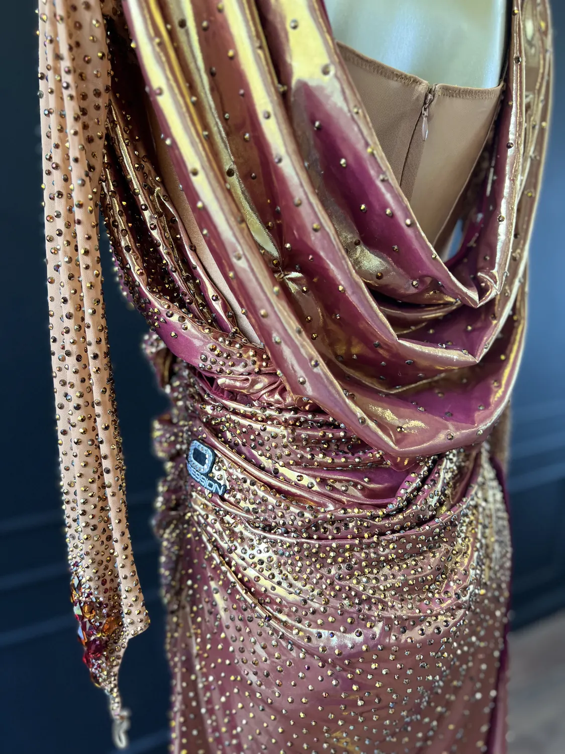 Long skirt length 46”, short skirt length 33.5" (from shoulder seam to hem of dress). Please note that this dress has a raw hem to retain the fluidity of the metallic lycra and create the waterfall effect skirt.