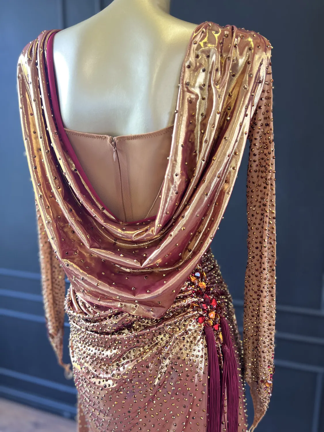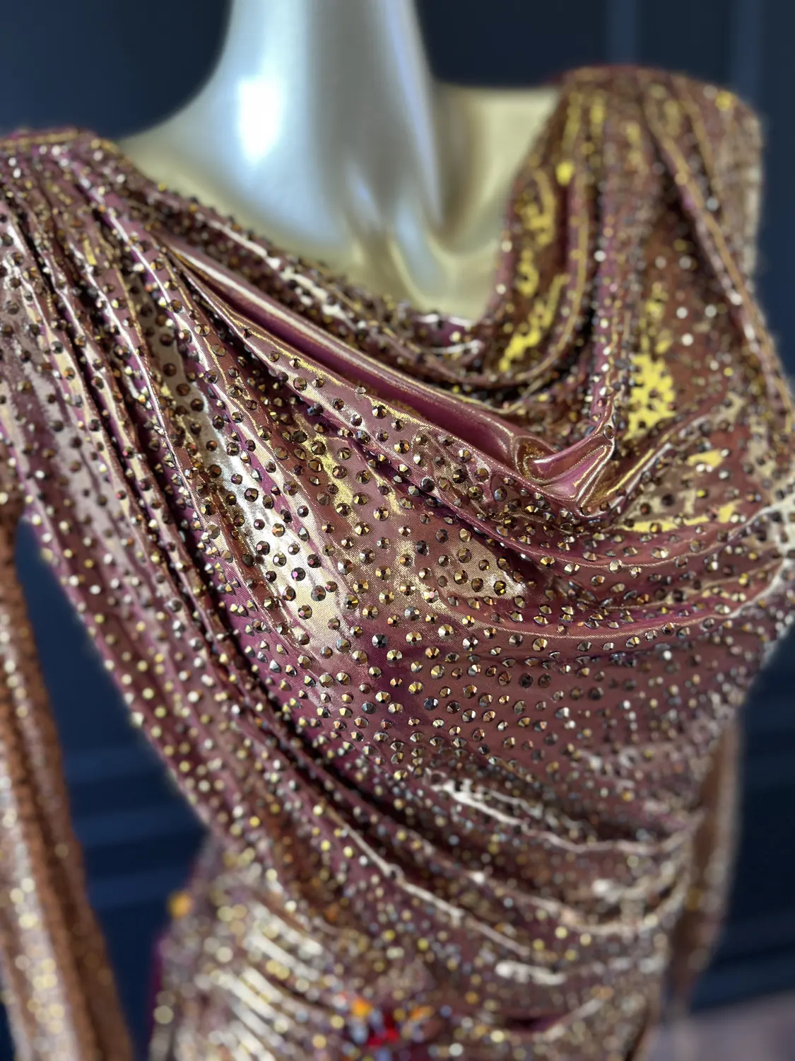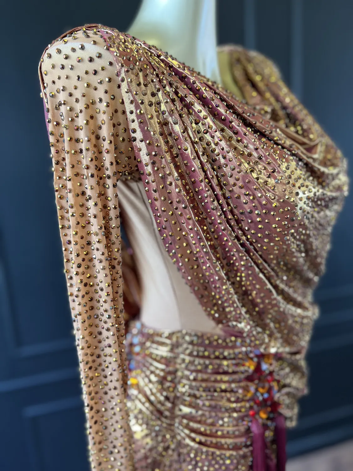 Long skirt length 46”, short skirt length 33.5" (from shoulder seam to hem of dress). Please note that this dress has a raw hem to retain the fluidity of the metallic lycra and create the waterfall effect skirt.