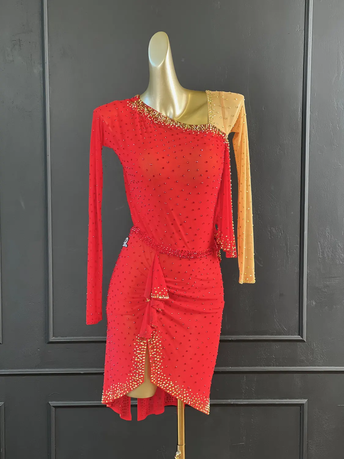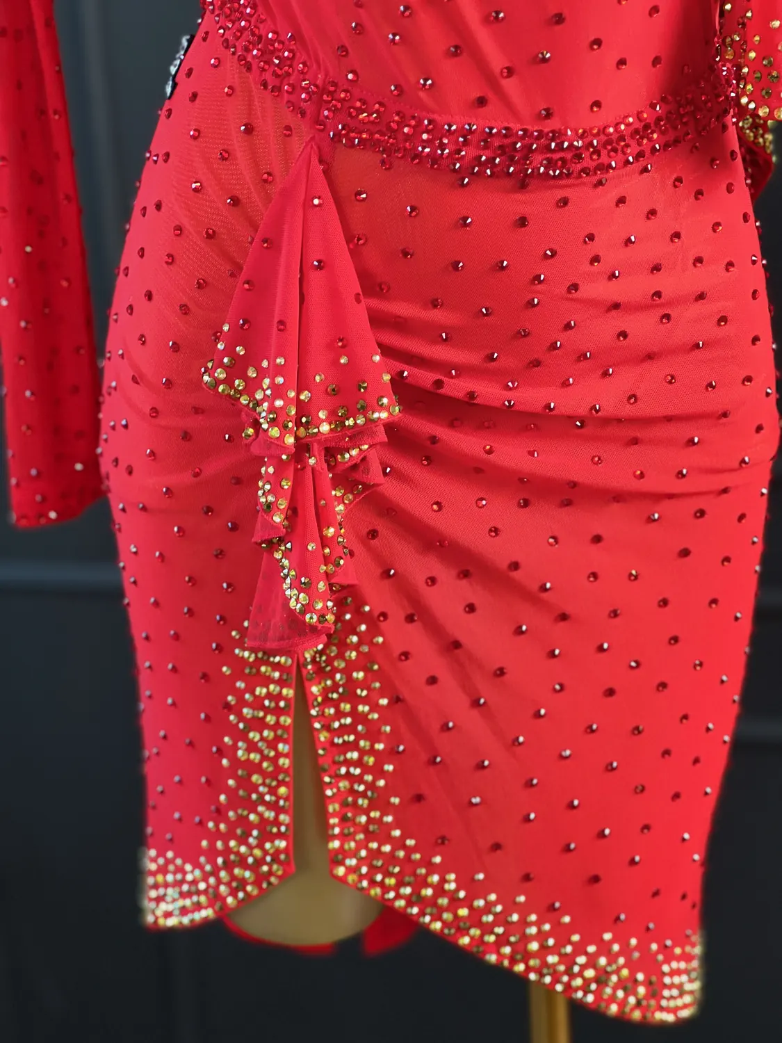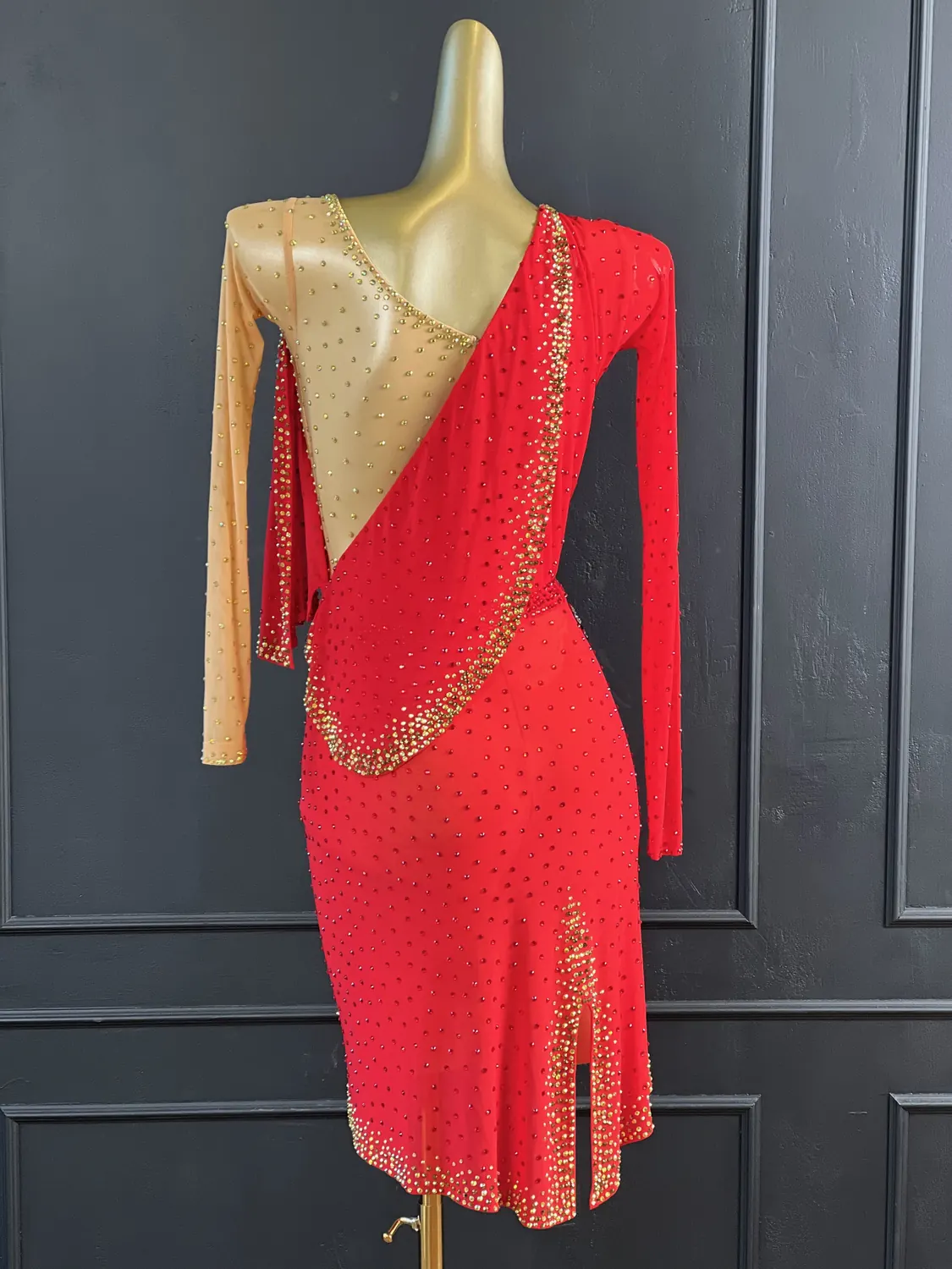 This dress is heavily stoned therefore there is limited additional stretch in the lycra. This dress is true to size UK 10-12.