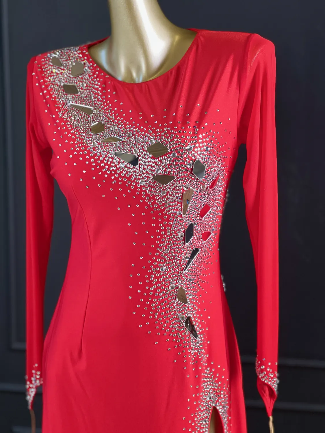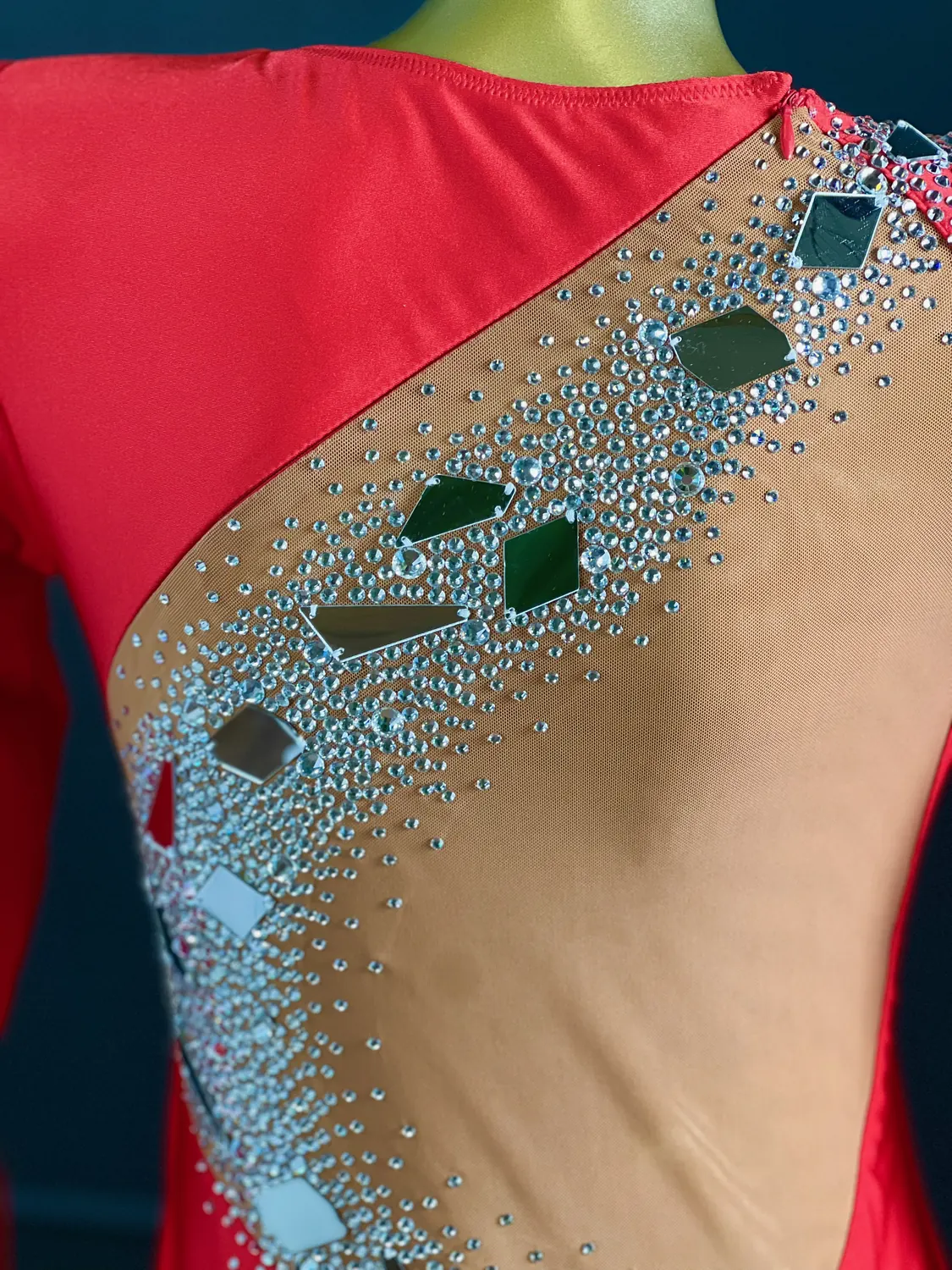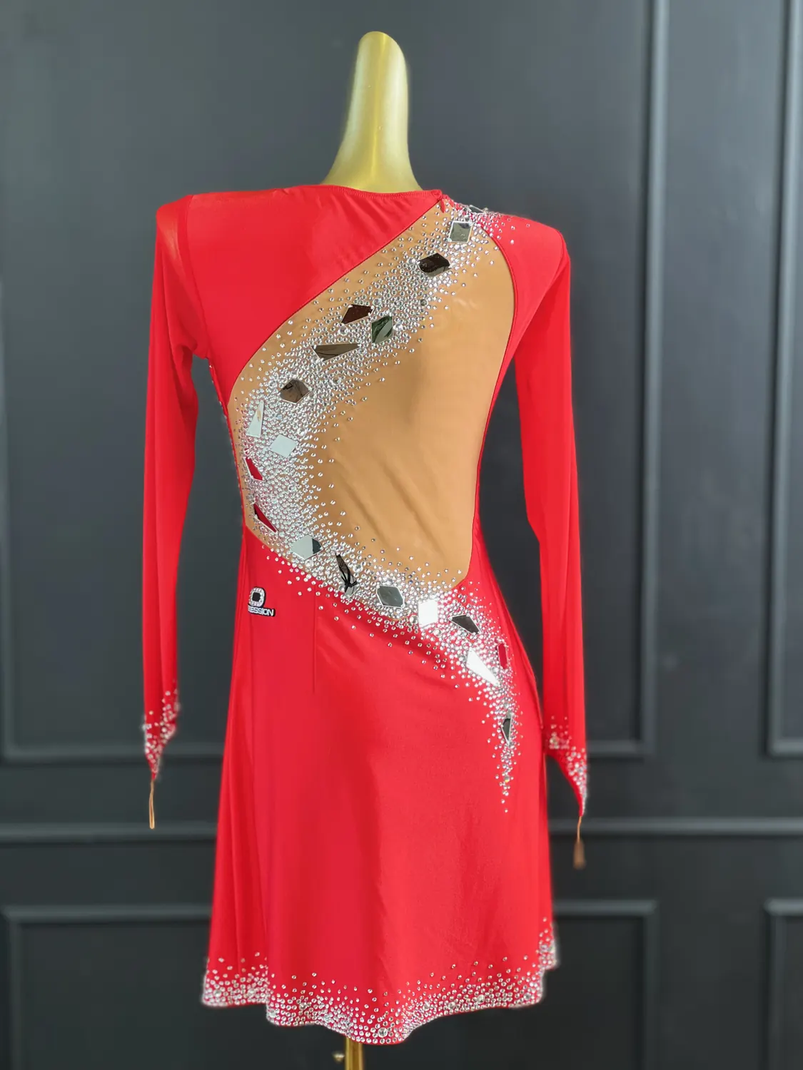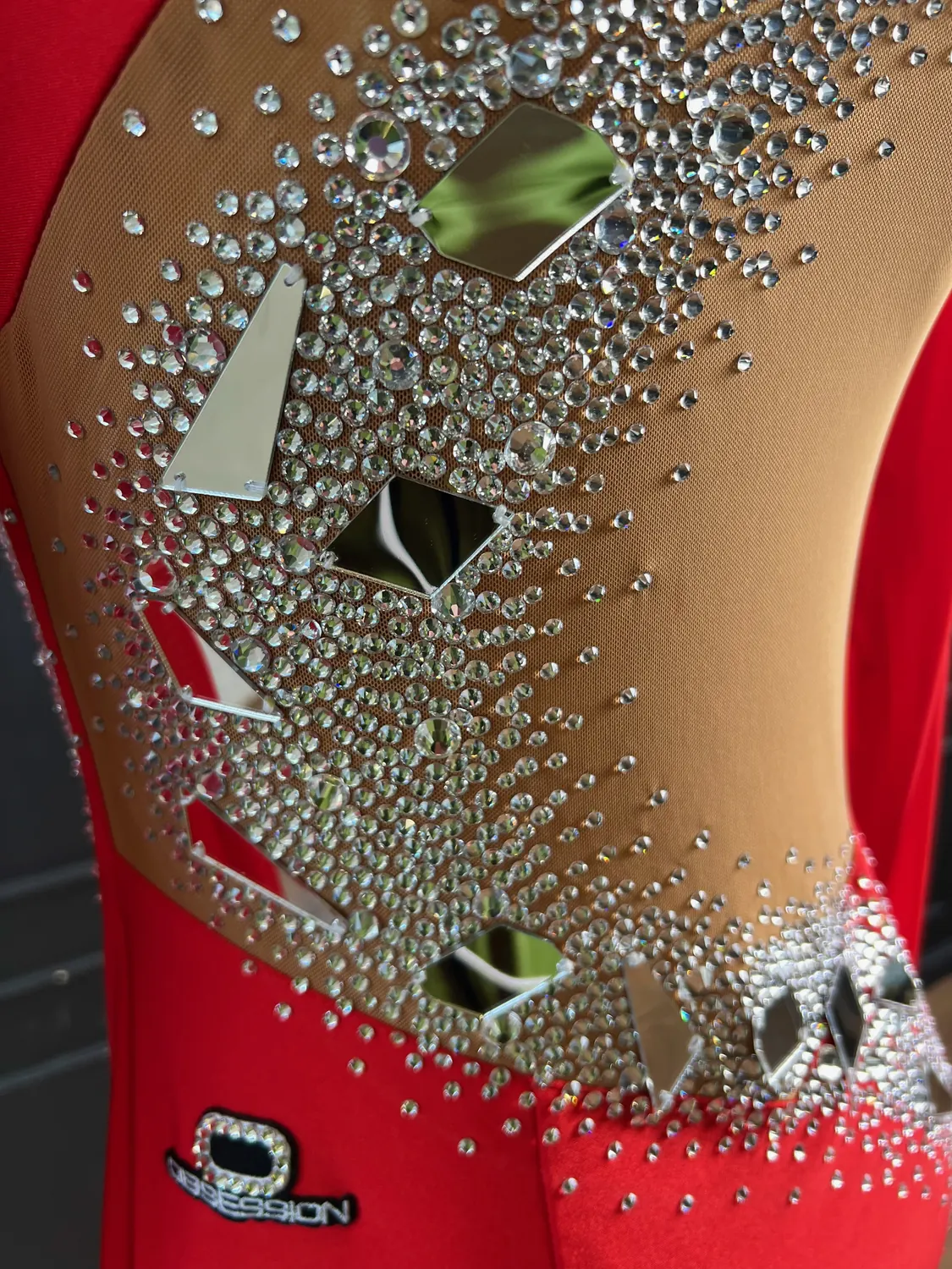 Latin competition dress in Scarlet lycra and mesh with Nutmeg (tan) mesh back, stoned in Crystal with silver mirrors with feature mirrored and stoned earrings.