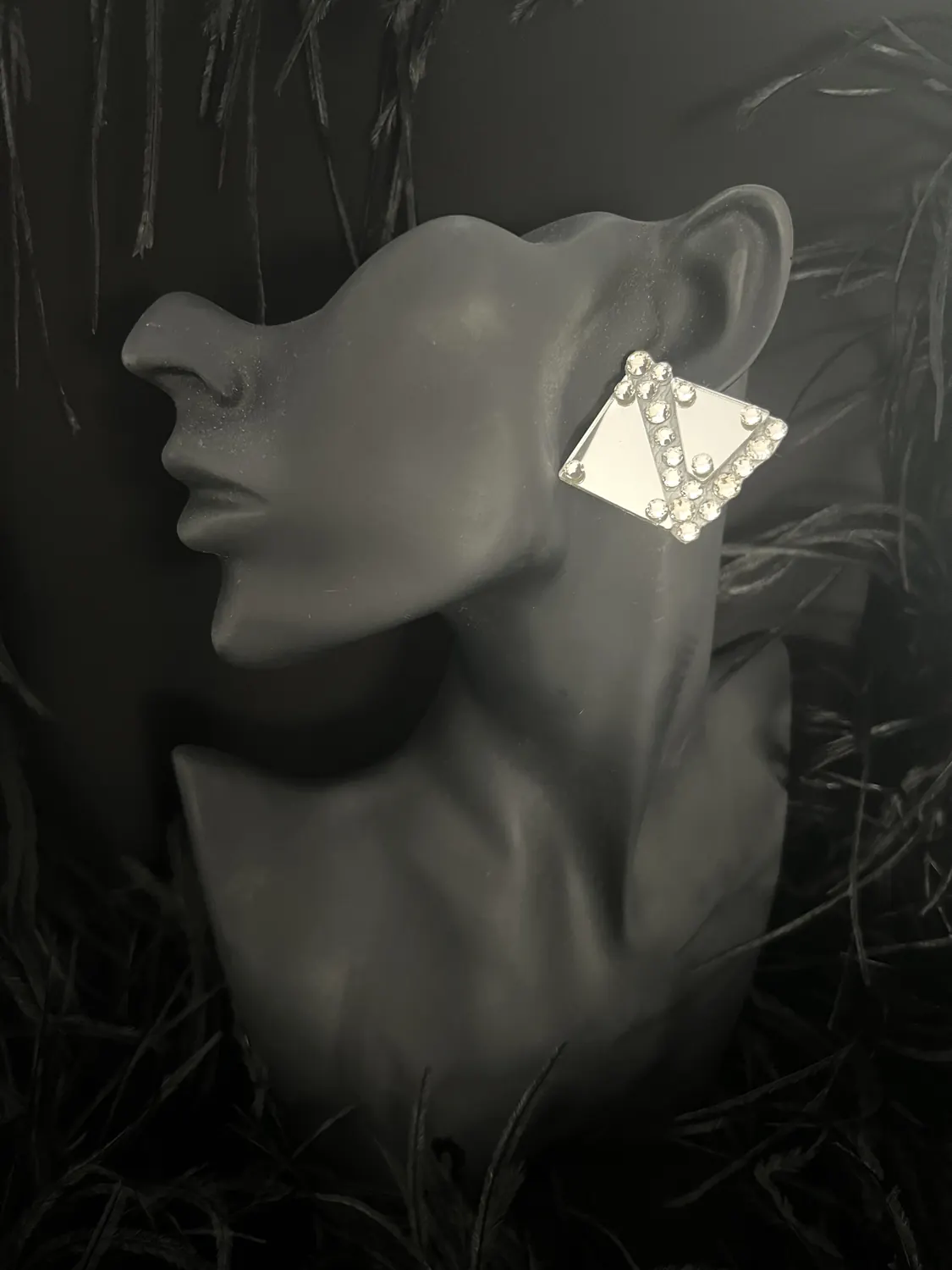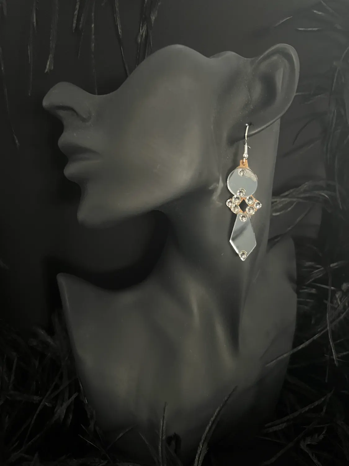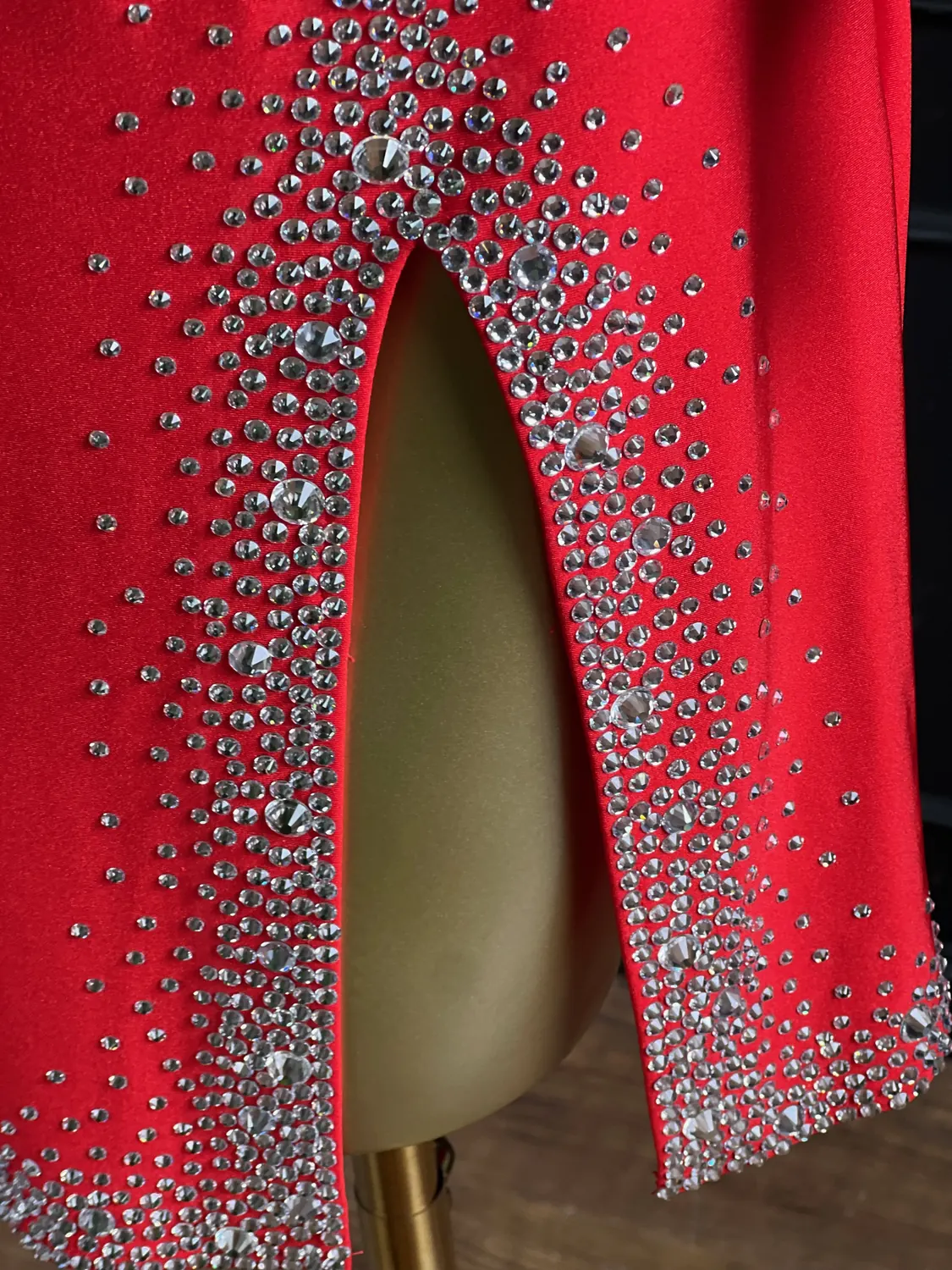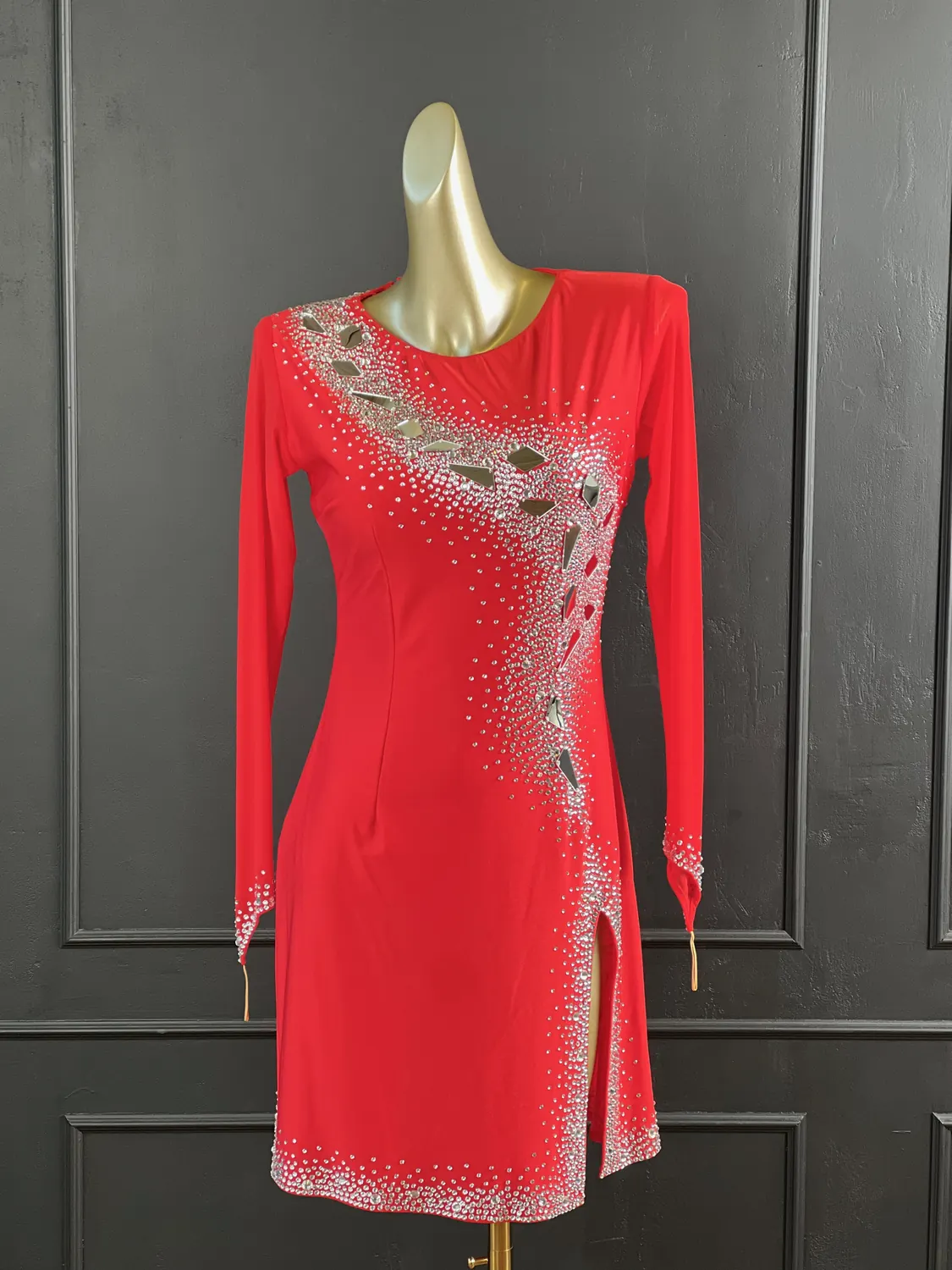 Latin competition dress in Scarlet lycra and mesh with Nutmeg (tan) mesh back, stoned in Crystal with silver mirrors with feature mirrored and stoned earrings.