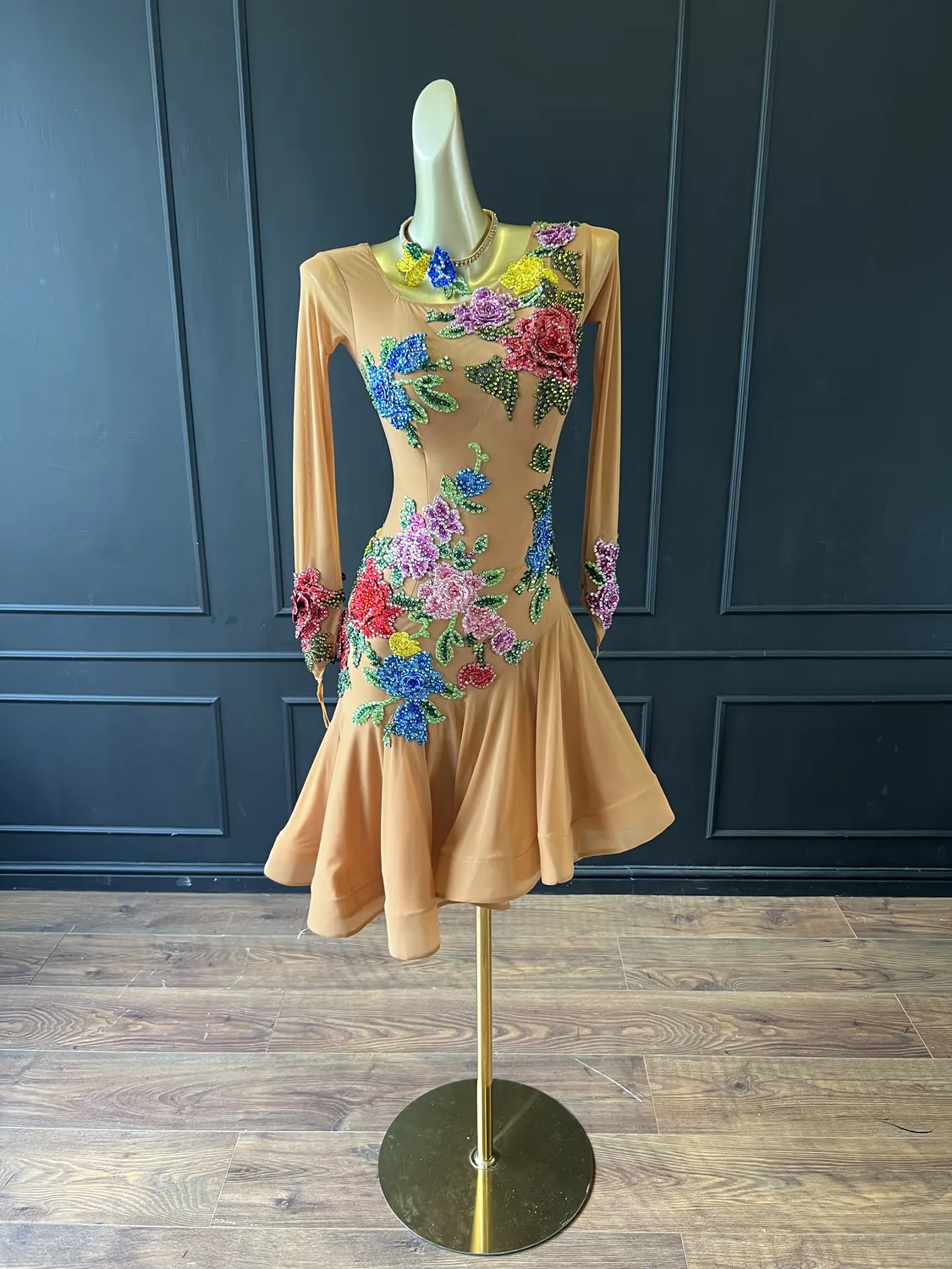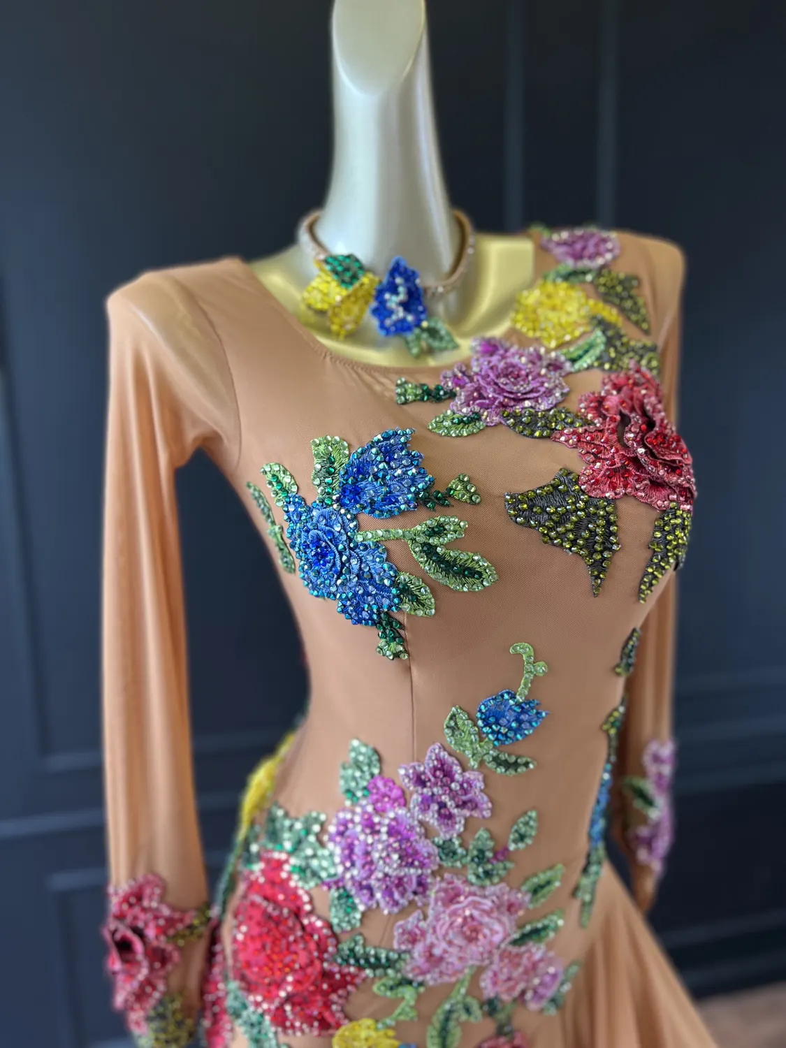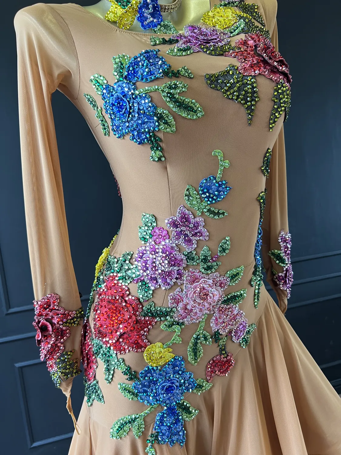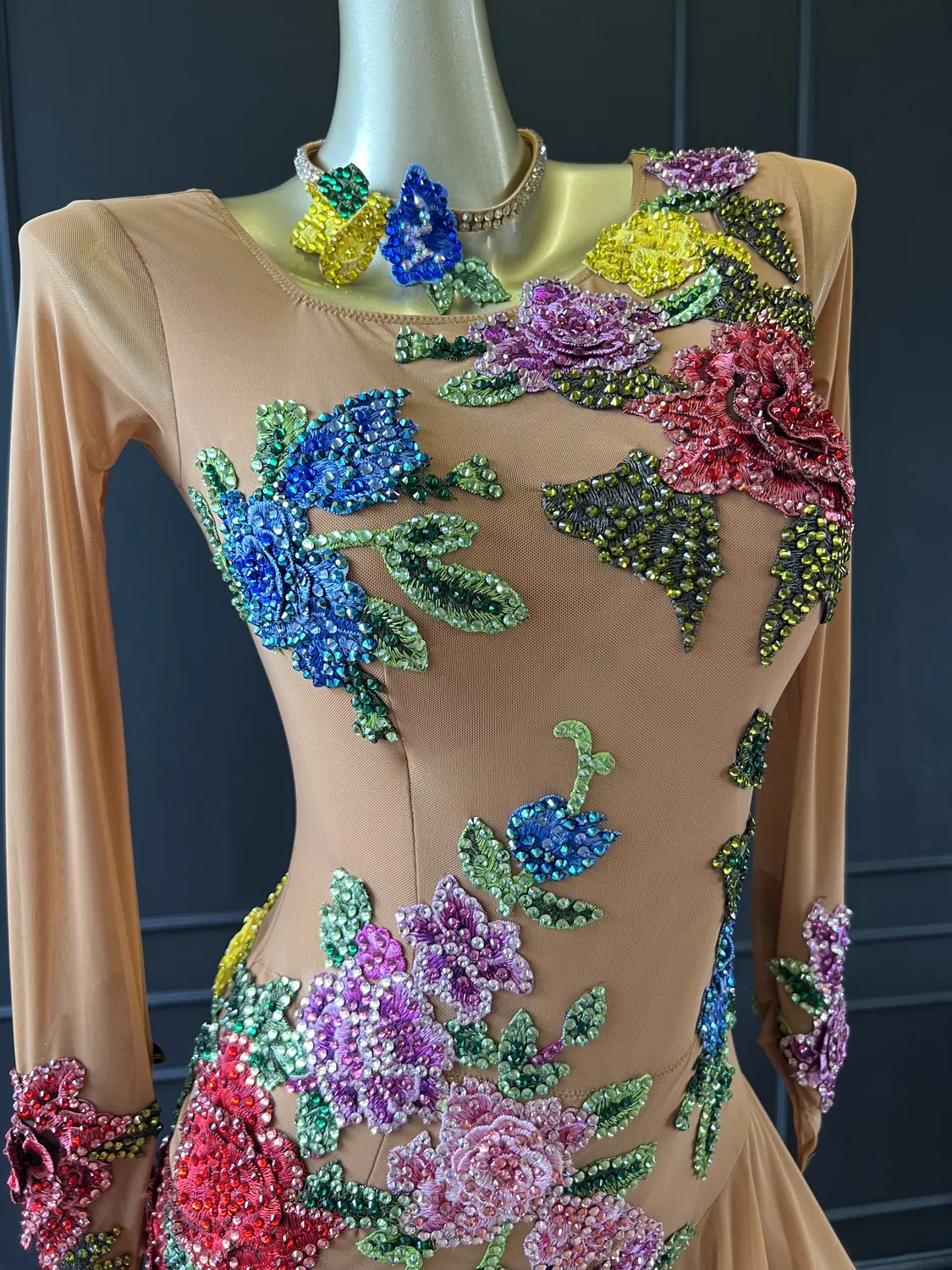 Latin competition dress in tan mesh with stoned, multicoloured appliqué flowers and a full skirt with crinoline edge, stoned feature neckpiece and stoned earrings.