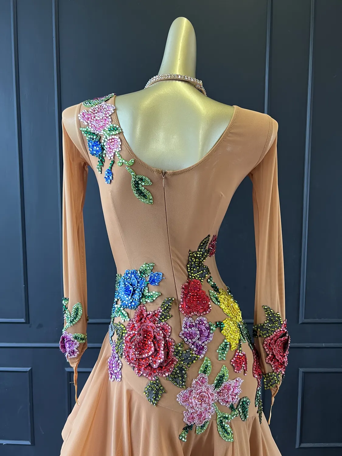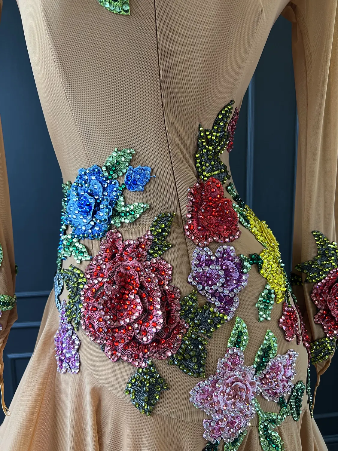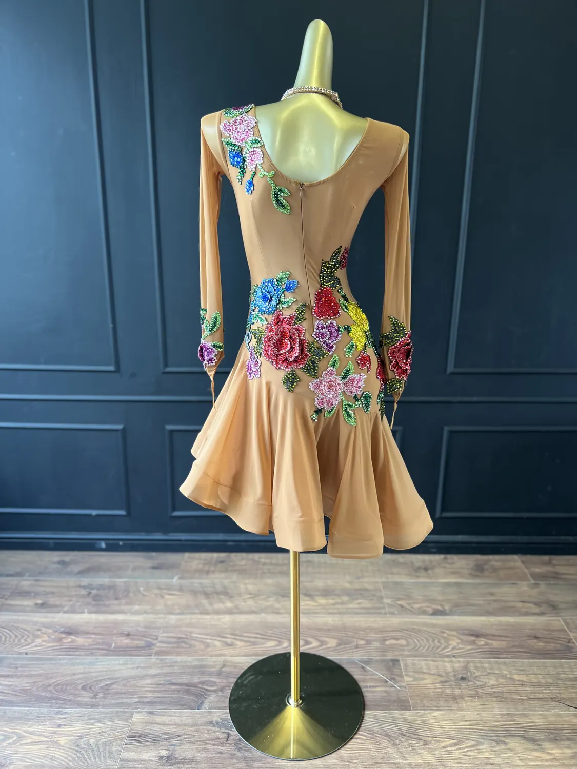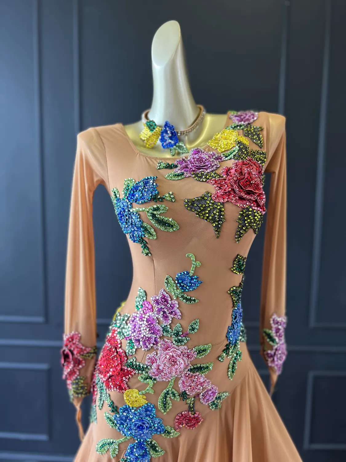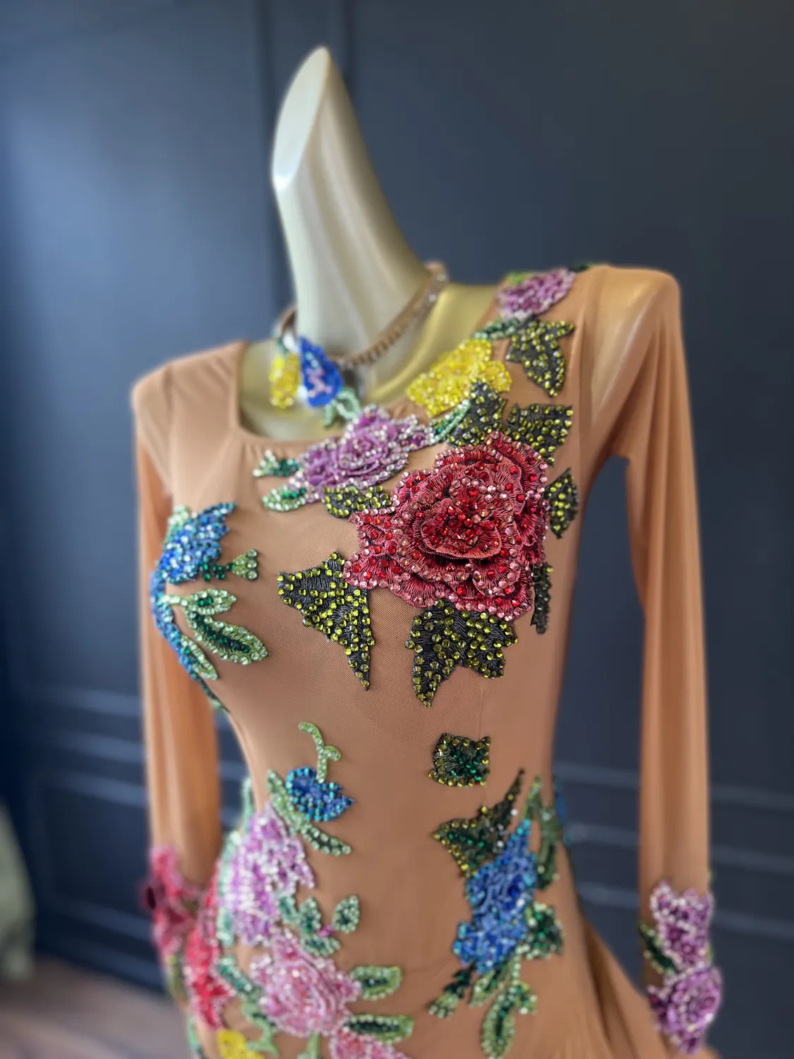 Latin competition dress in tan mesh with stoned, multicoloured appliqué flowers and a full skirt with crinoline edge, stoned feature neckpiece and stoned earrings.