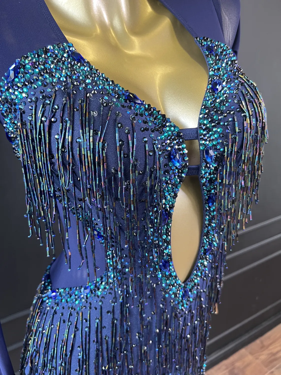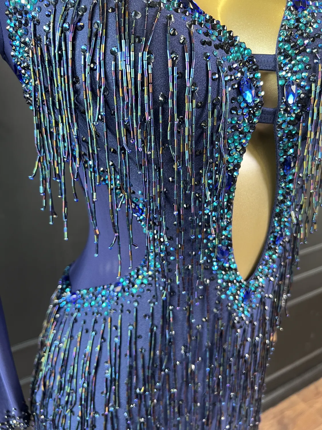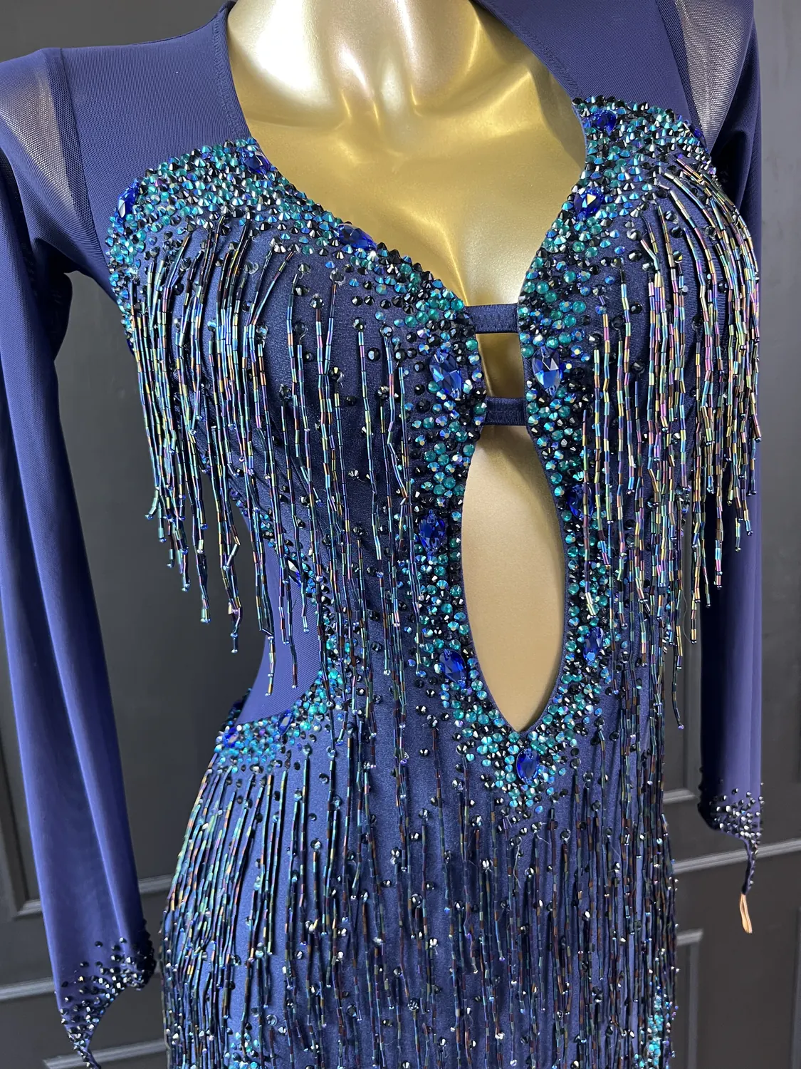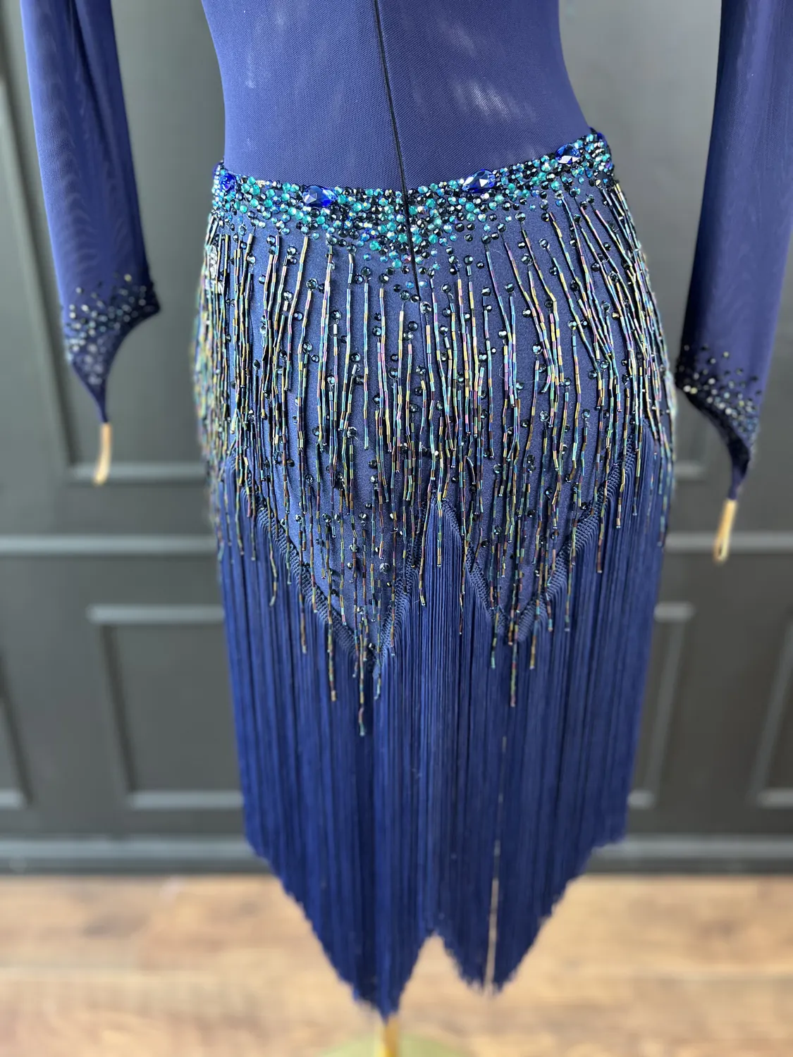 Though this dress is heavily embellished, there is considerable stretch in the lycra allowing for a UK size 10-12 size range.