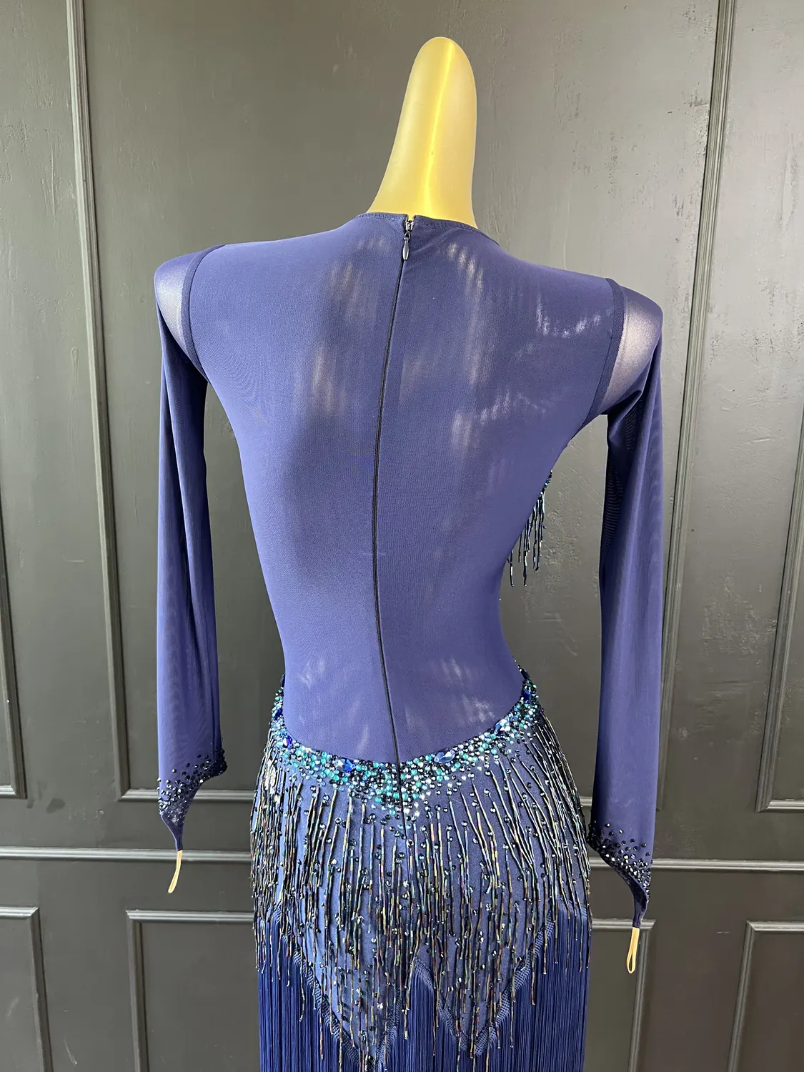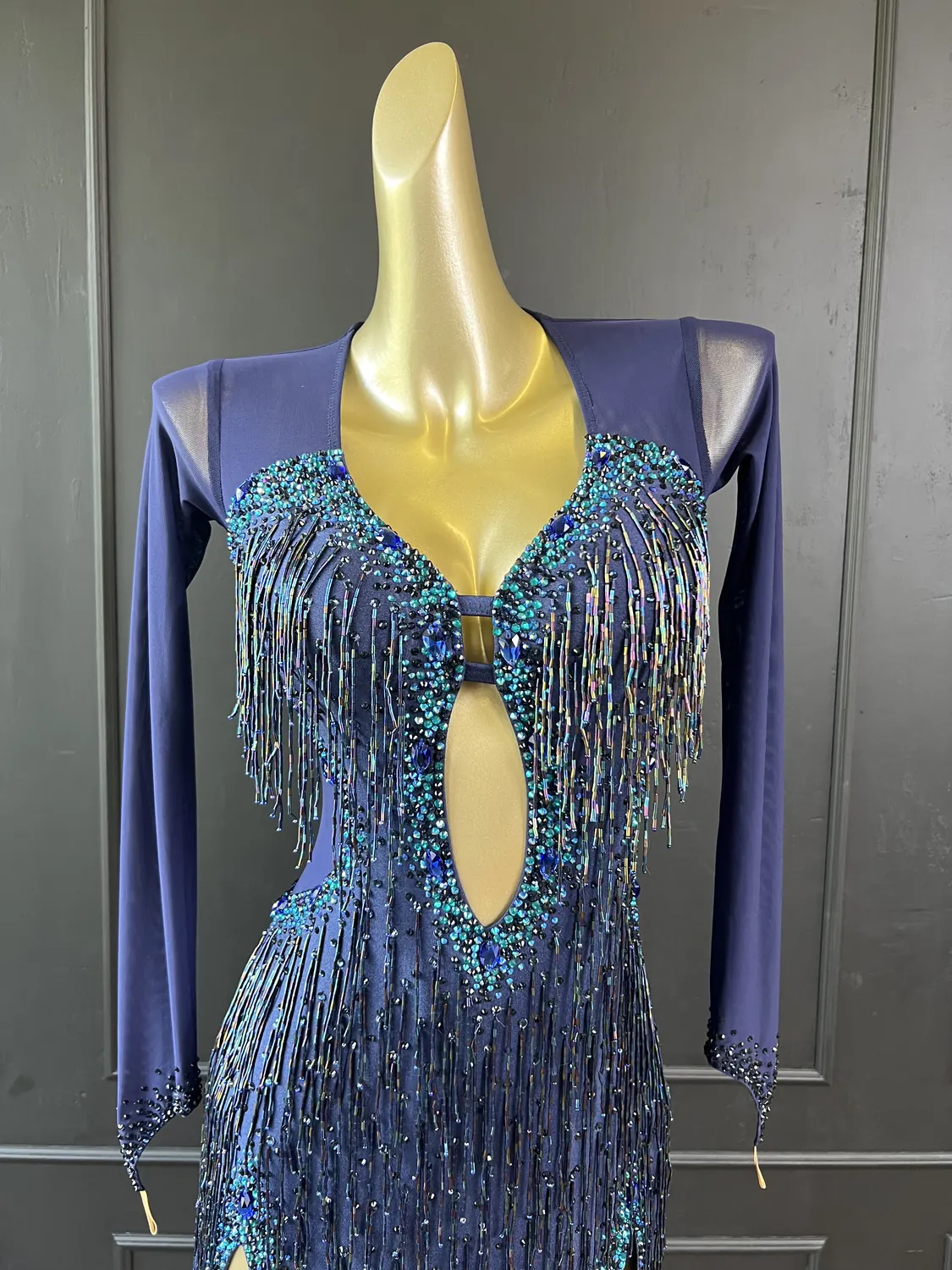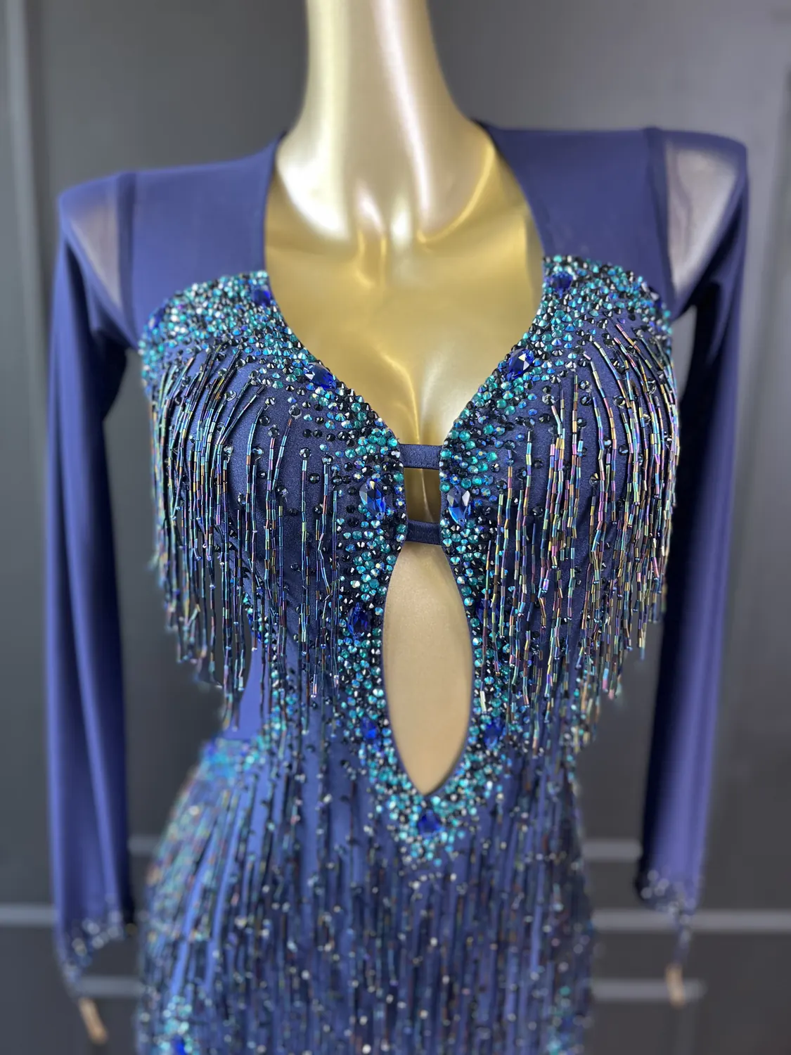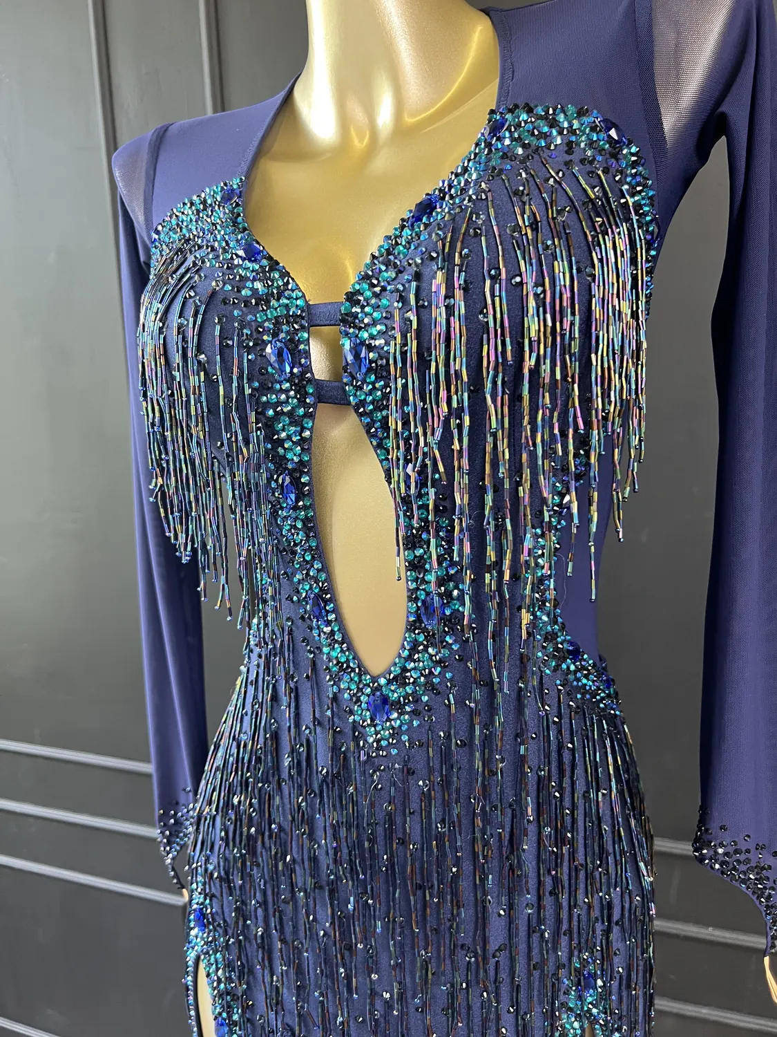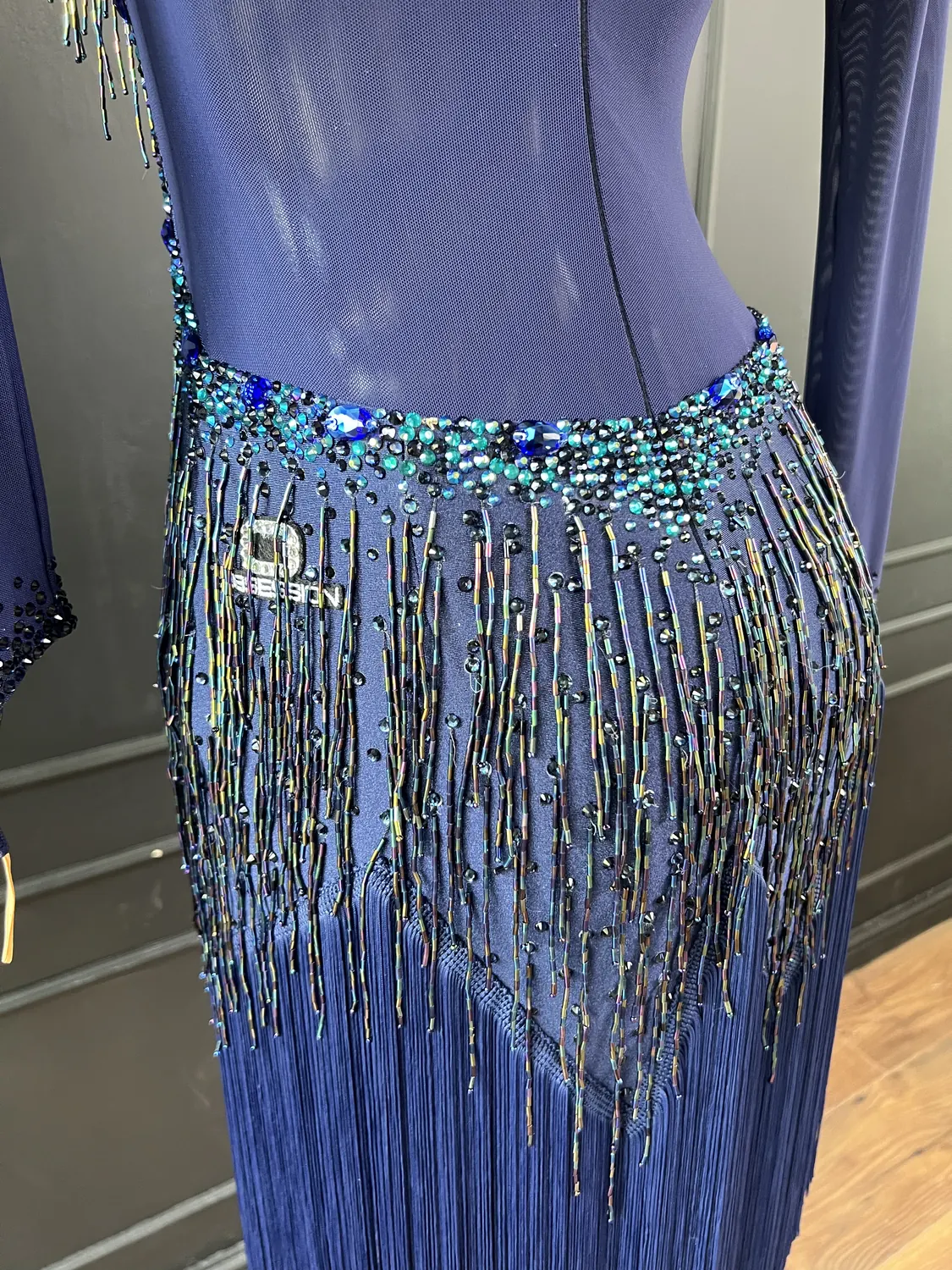 Though this dress is heavily embellished, there is considerable stretch in the lycra allowing for a UK size 10-12 size range.