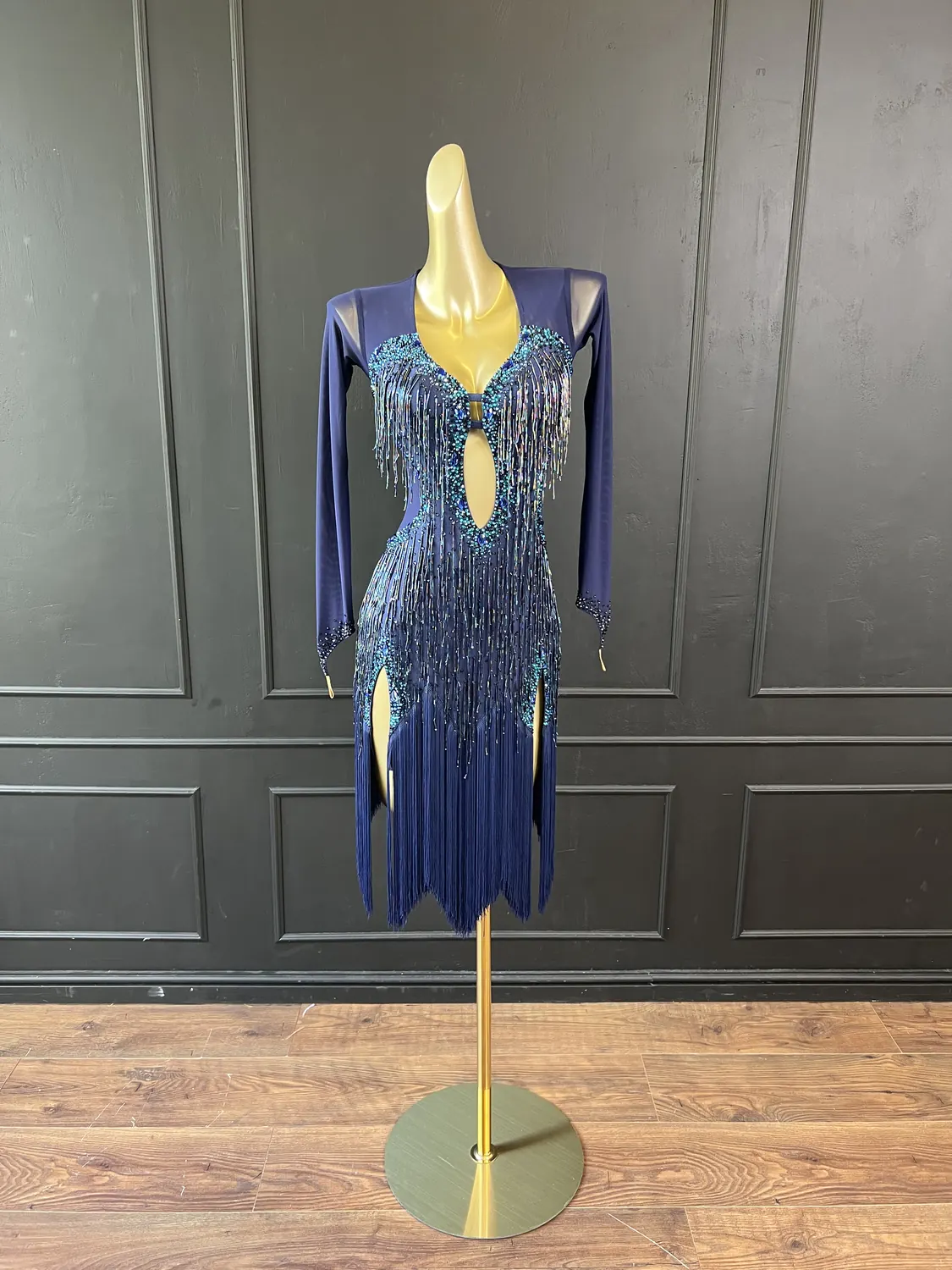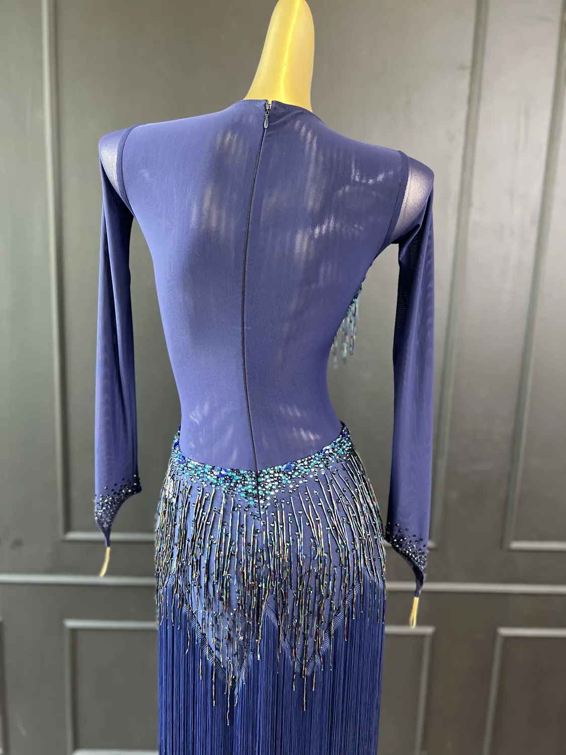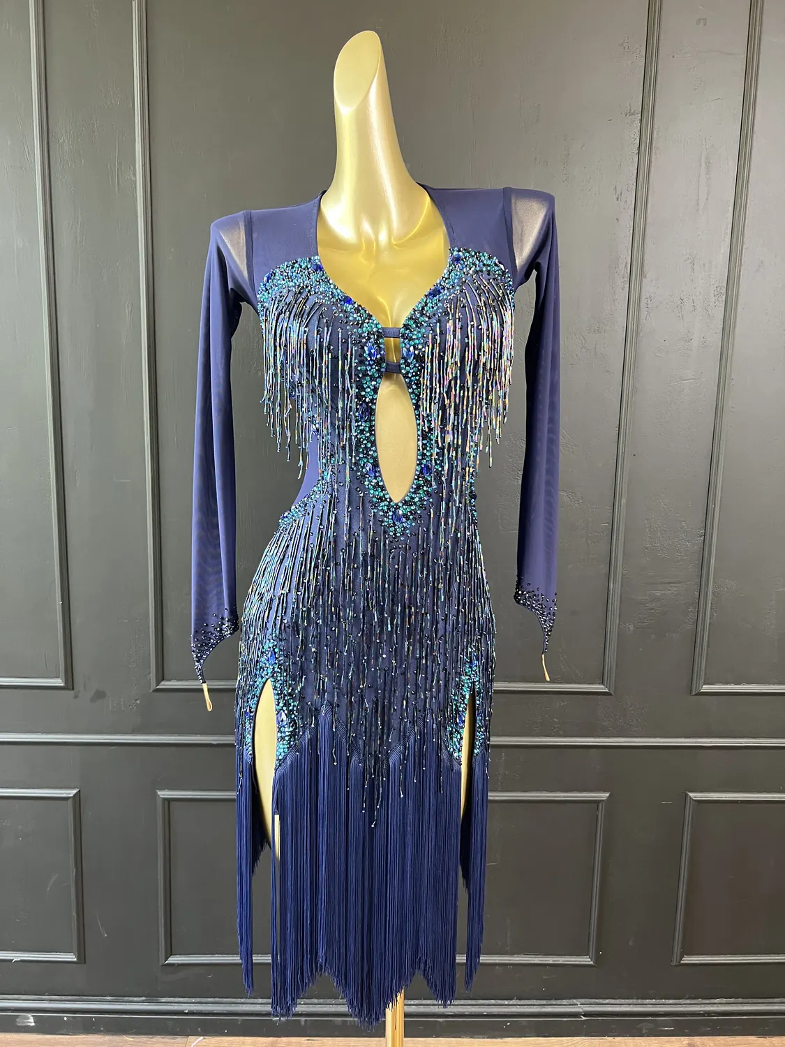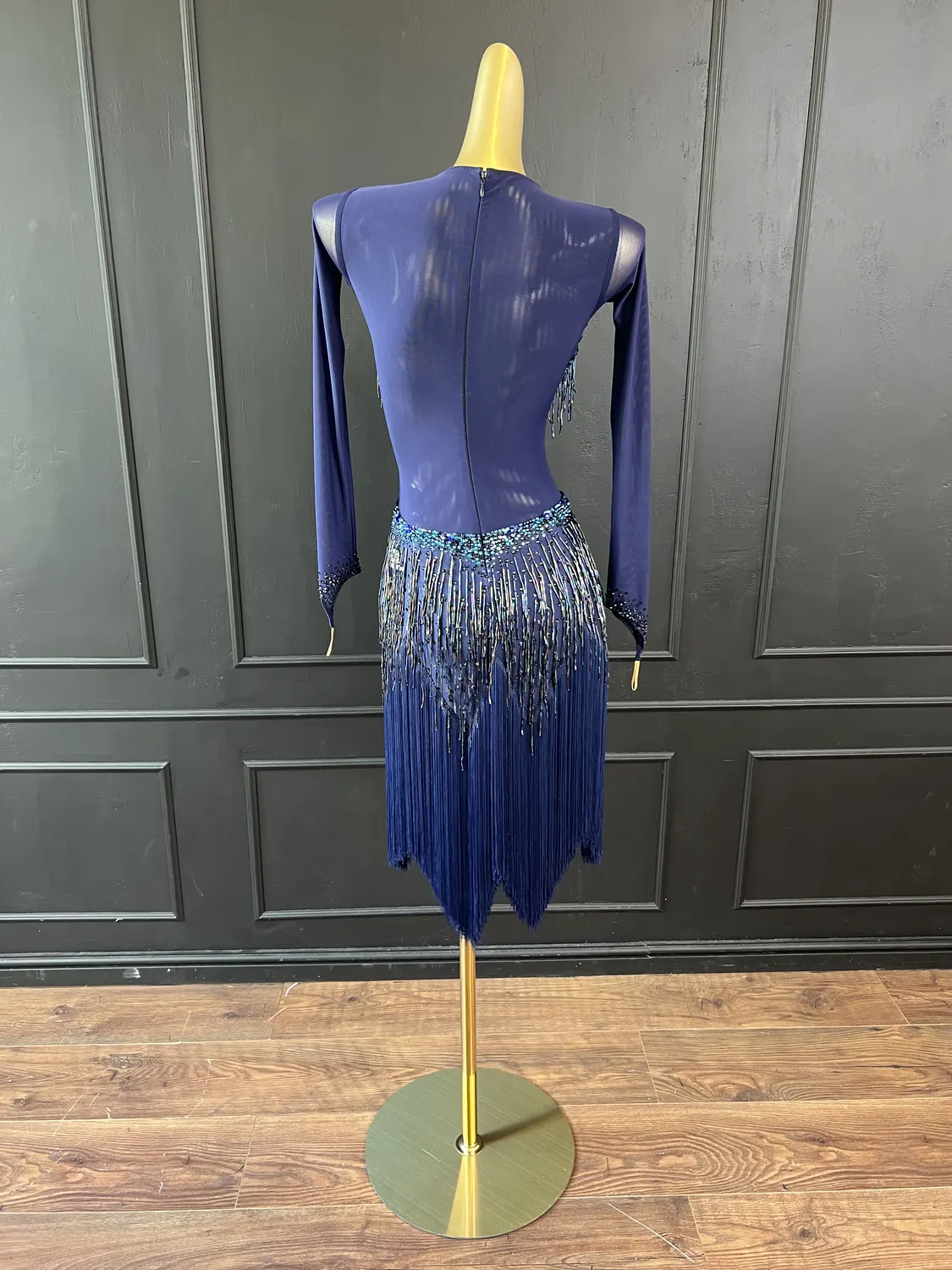 Though this dress is heavily embellished, there is considerable stretch in the lycra allowing for a UK size 10-12 size range.