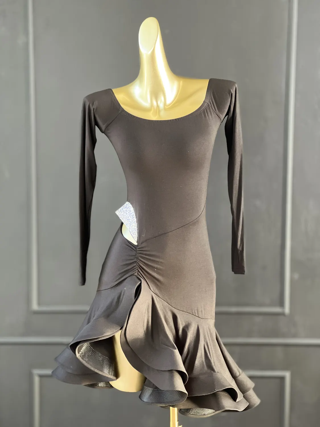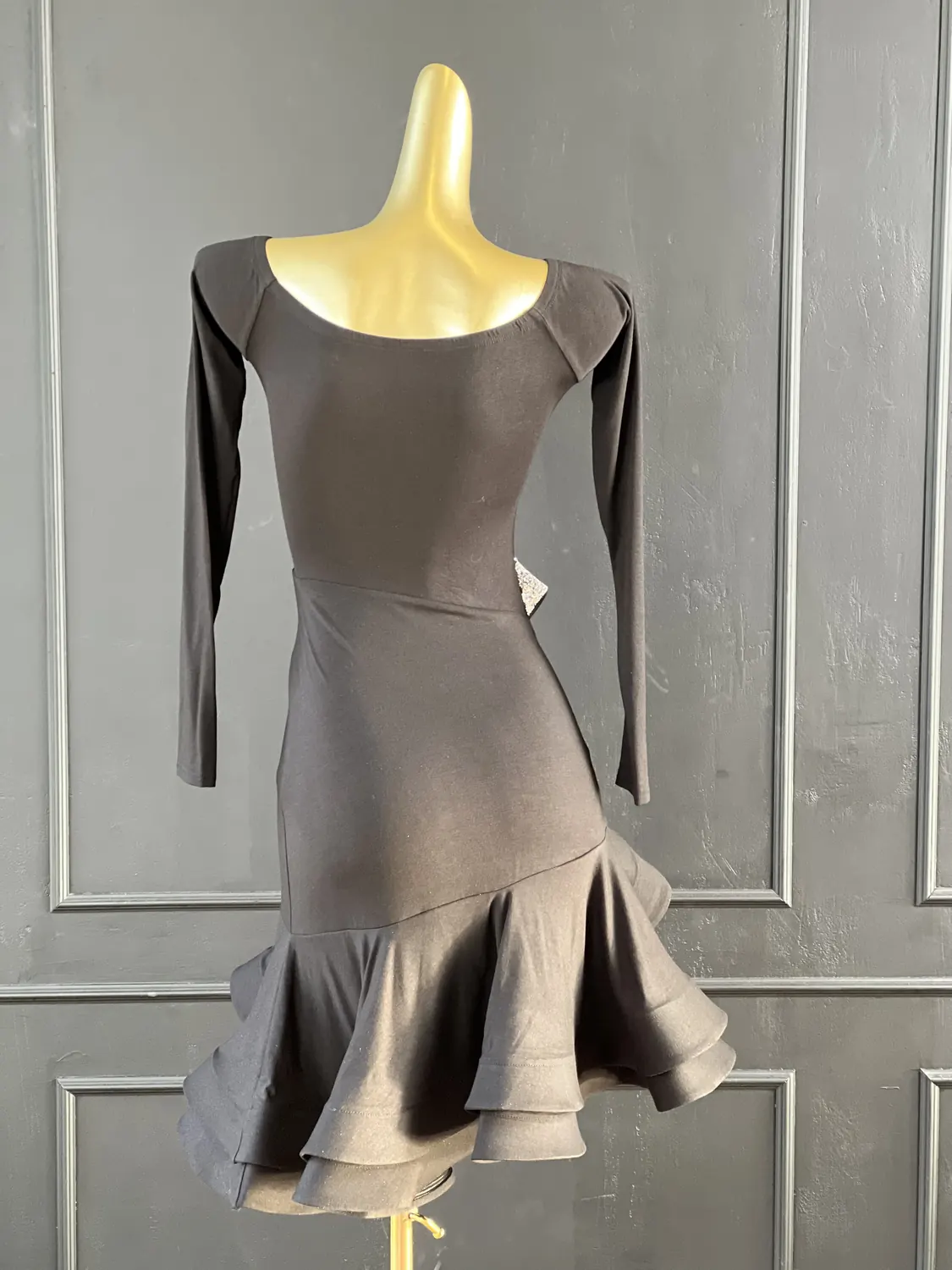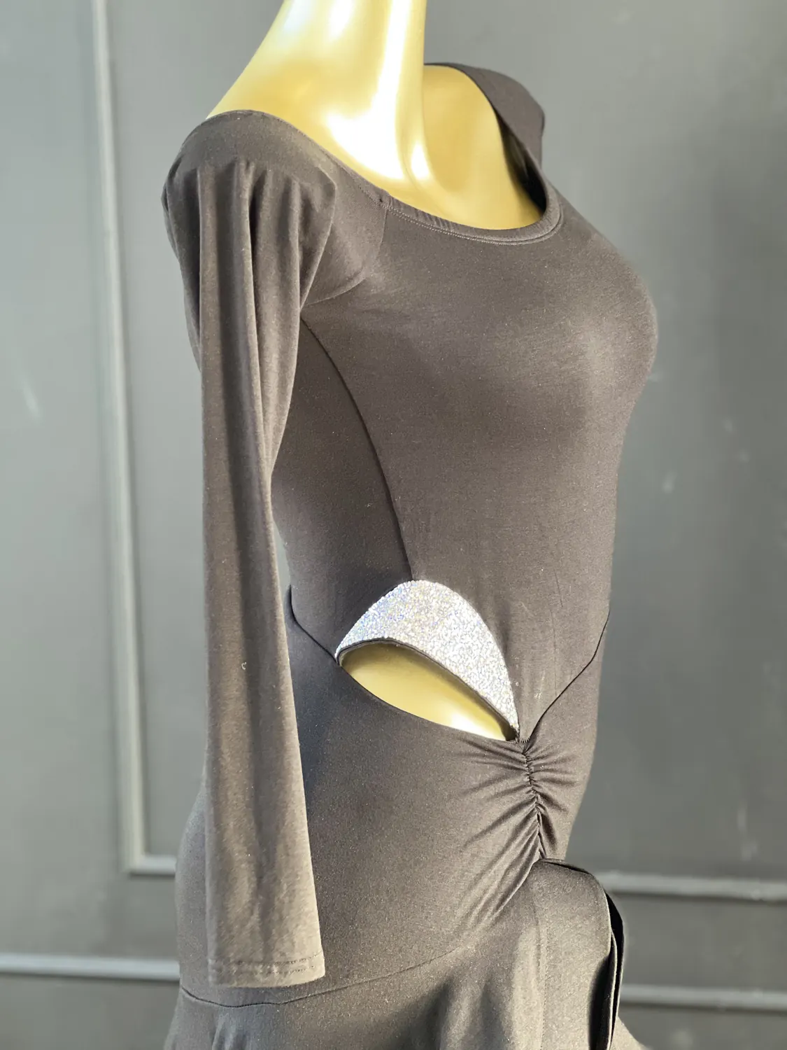 Latin practice dress in black jersey with hip cut-out with sparkle detail, extra long sleeves with thumb holes and graduated frill with crinoline.
