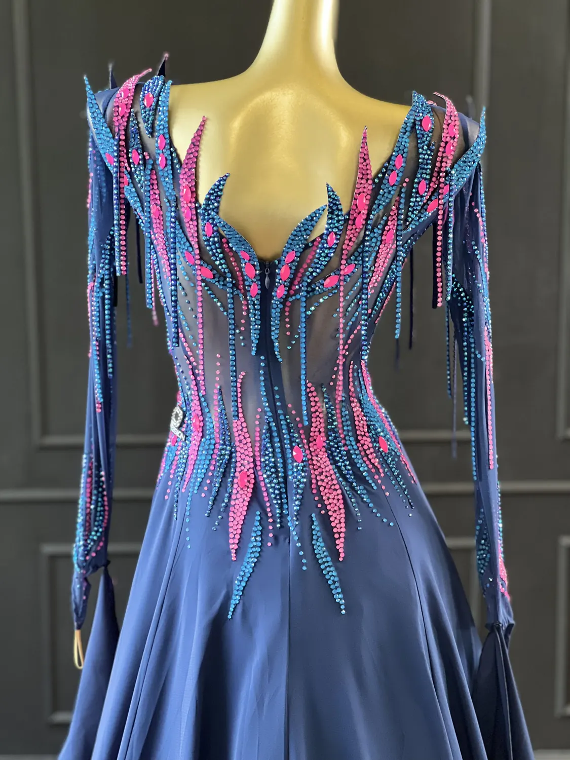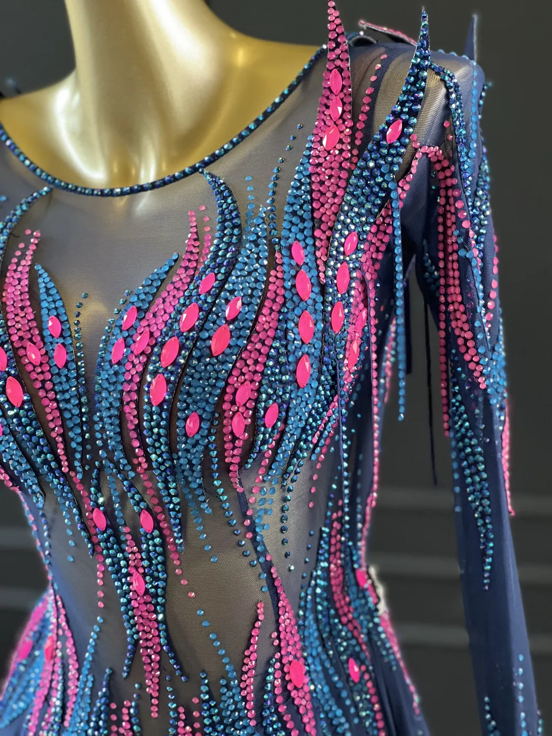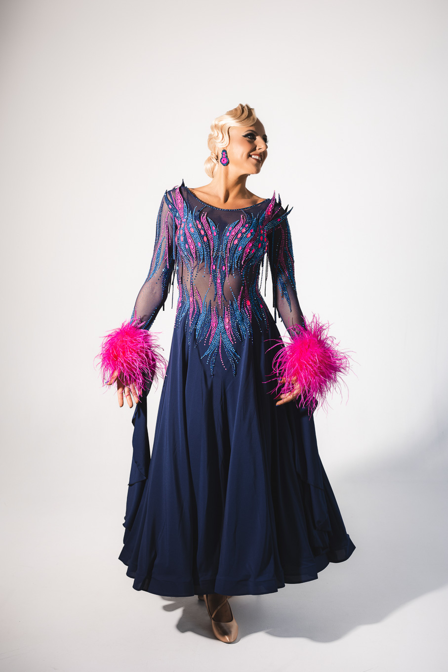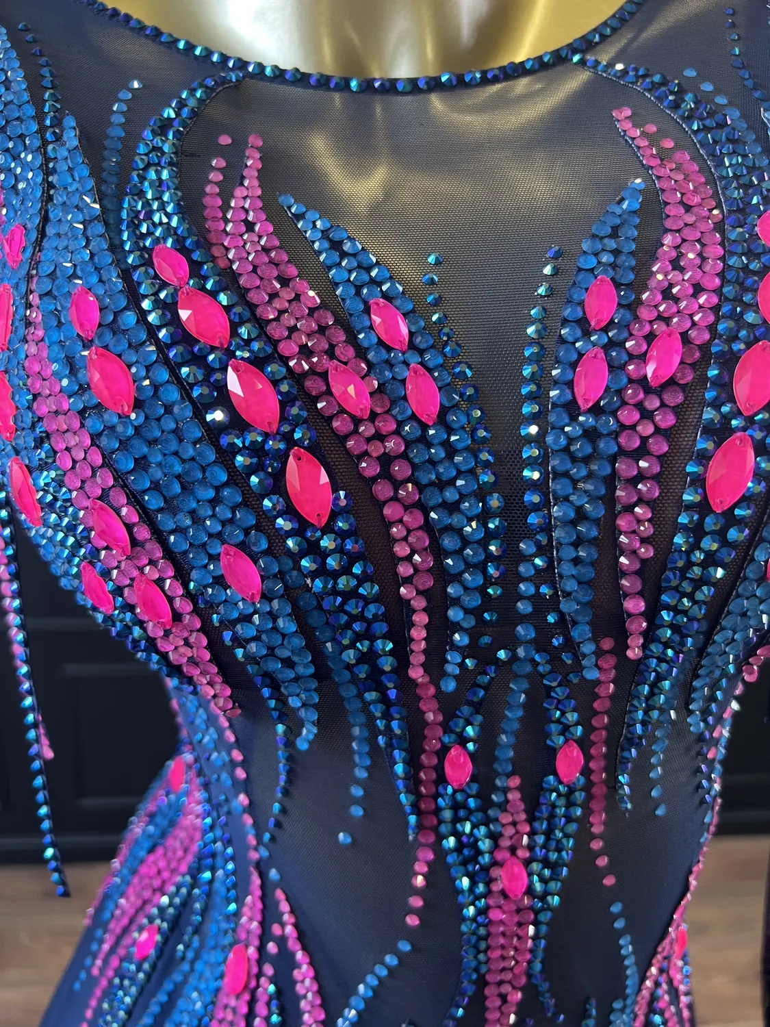 This dress has a sheer net bodice decorated with hand-made stoned shapes that restrict the amount of stretch available. This dress is therefore most suited to a dancer who is a UK size 10.