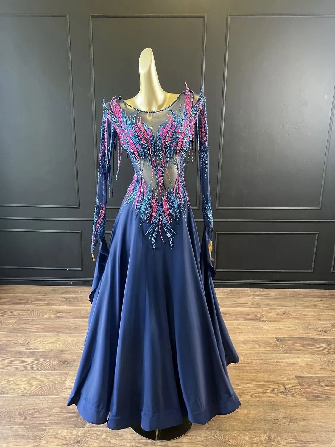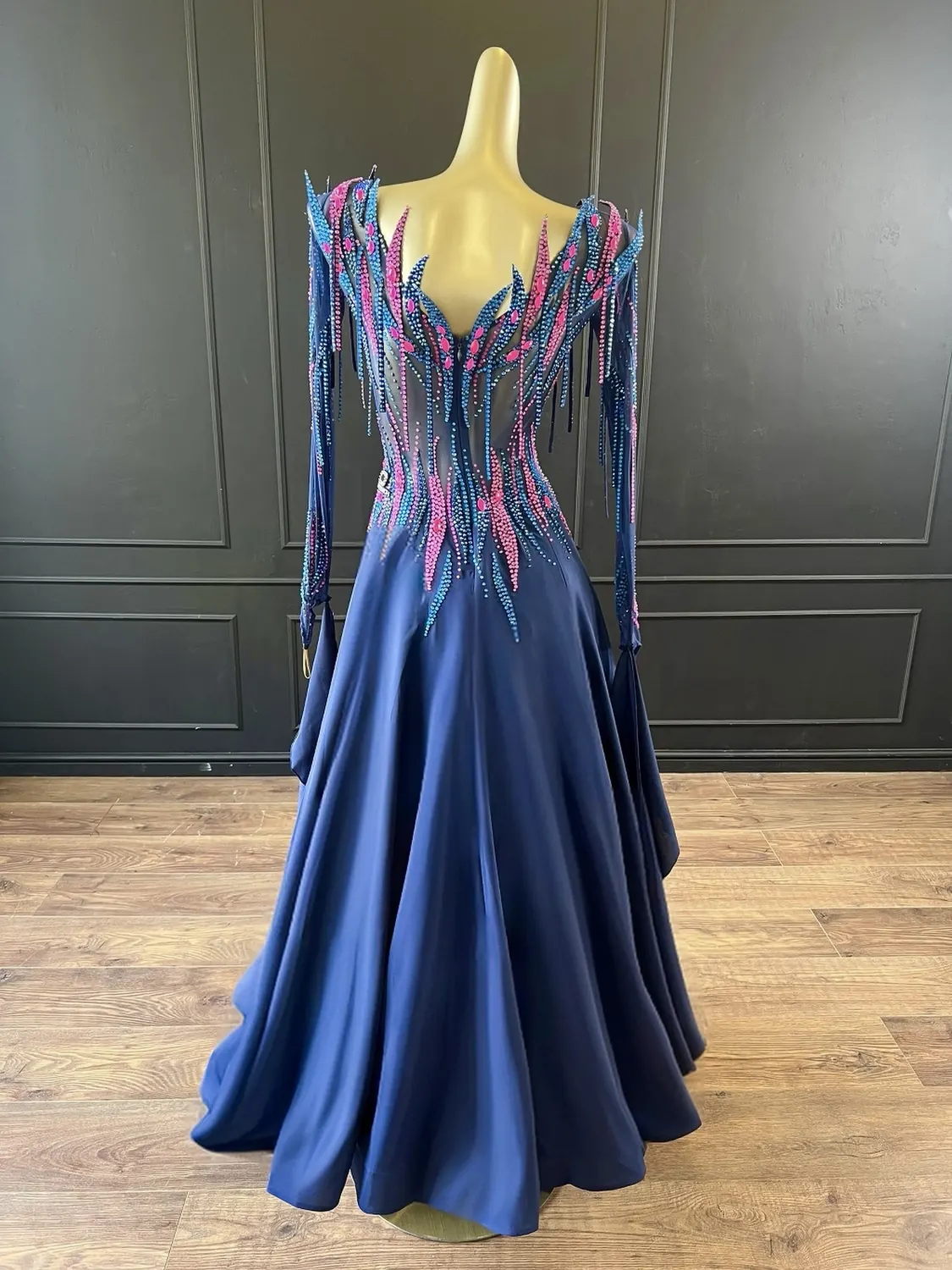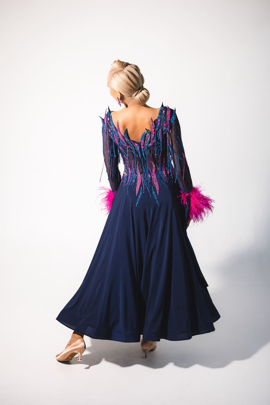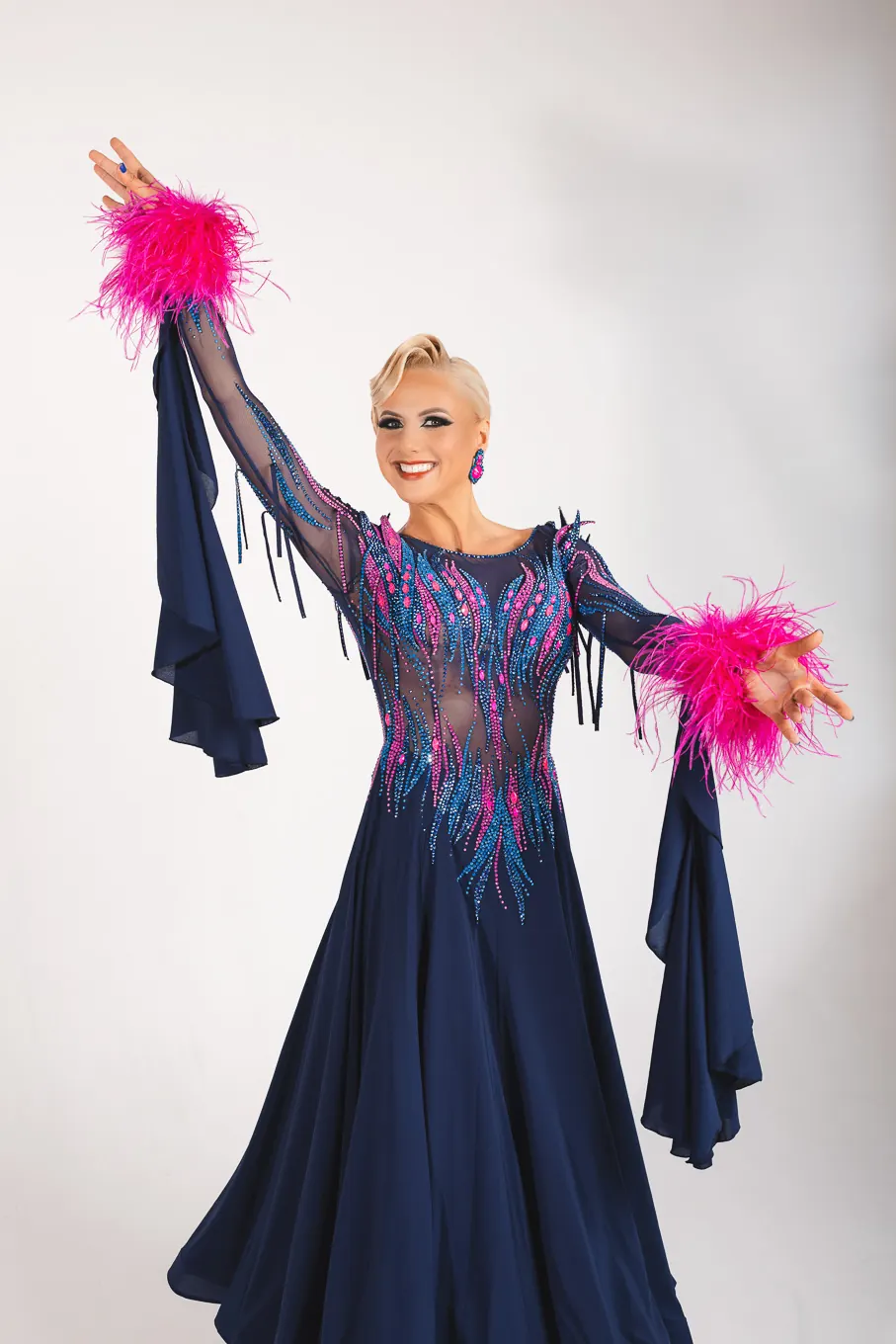 This dress has a sheer net bodice decorated with hand-made stoned shapes that restrict the amount of stretch available. This dress is therefore most suited to a dancer who is a UK size 10.
